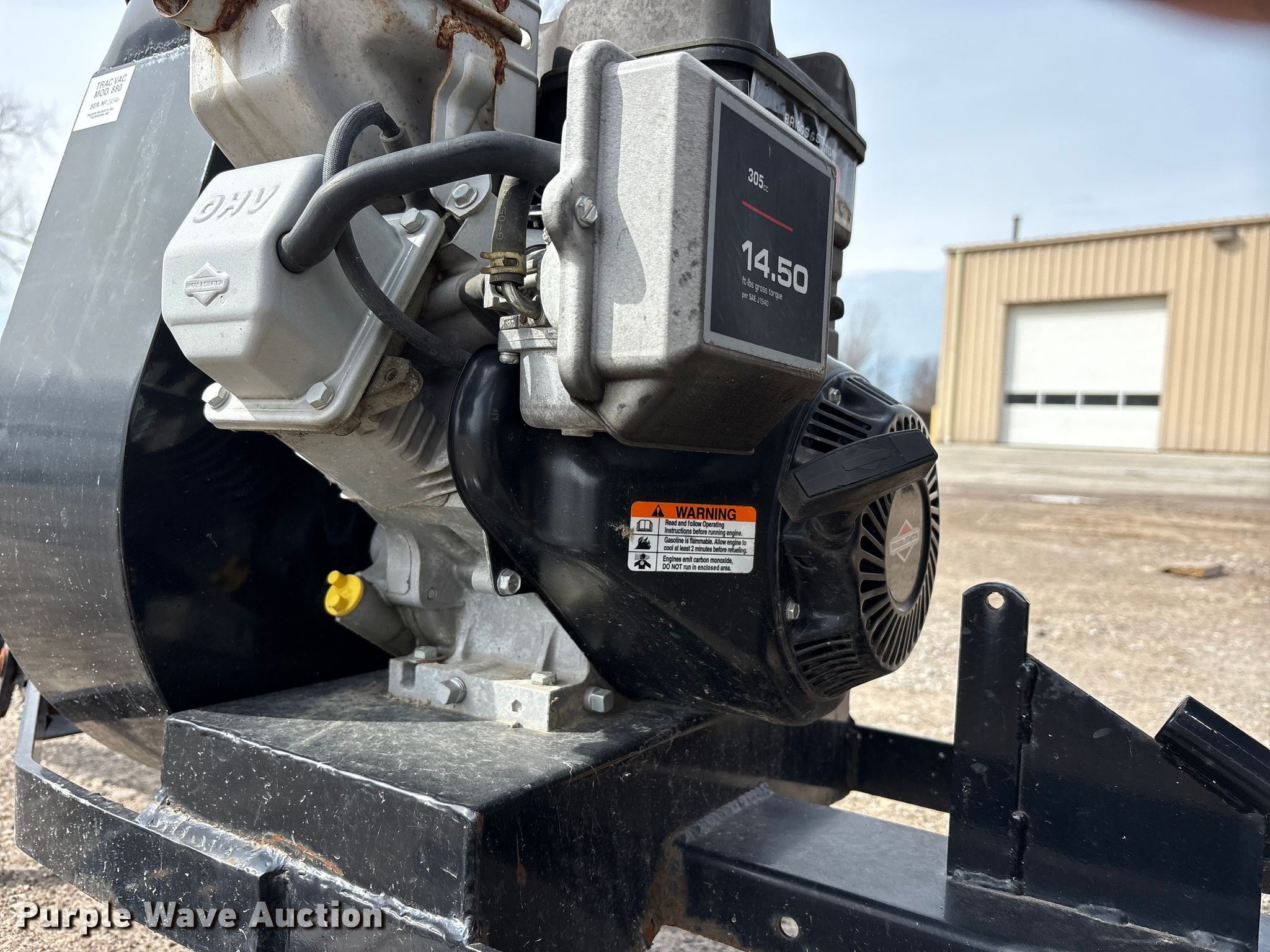 Trac Vac 880 leaf vacuum. Serial: 24546. Dimensions Overall Length: 10', Width: 4' 3", Height: 5' 3". Engine Briggs & Stratton, Cylinders: 1, Fuel type: Gas. Tires Size: 16x7.50-8. Notes Engine issues, seized , Non-operational unit. This is worksite support equipment and will not come with a title. Transfer of ownership documentation will be a bill of sale. City of Avon Lake. Avon Lake, OH 44012