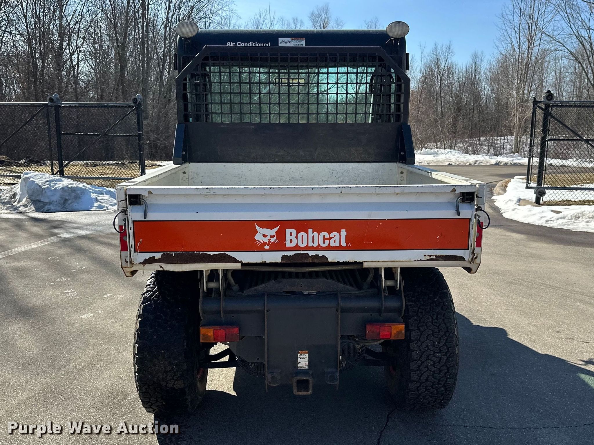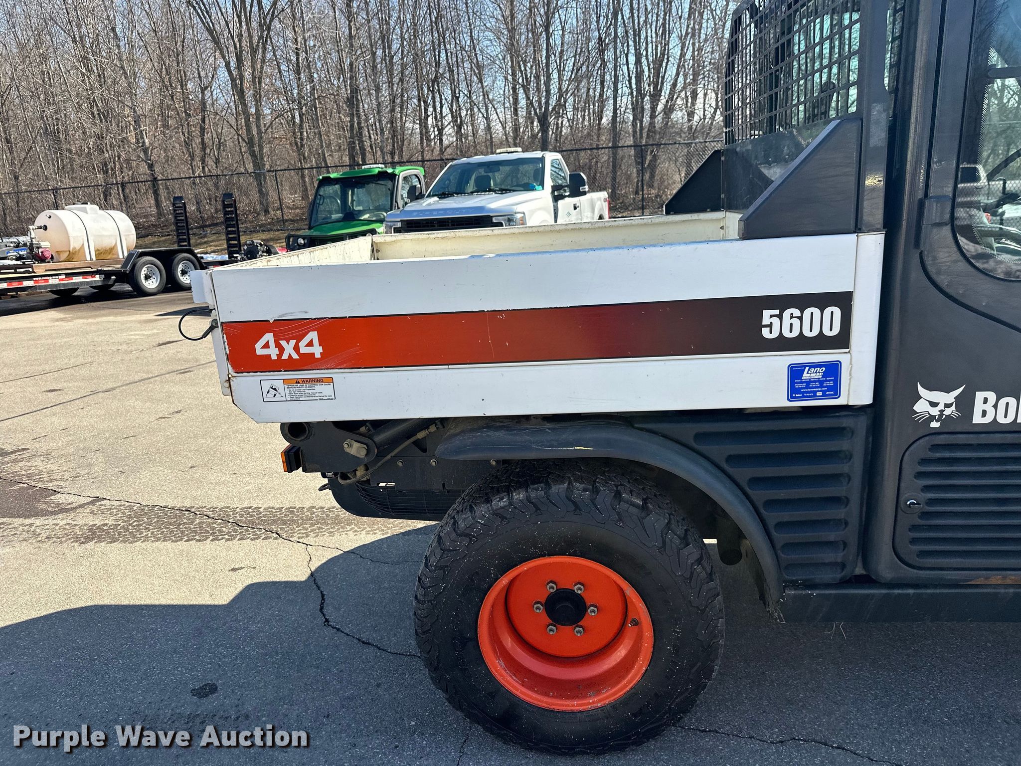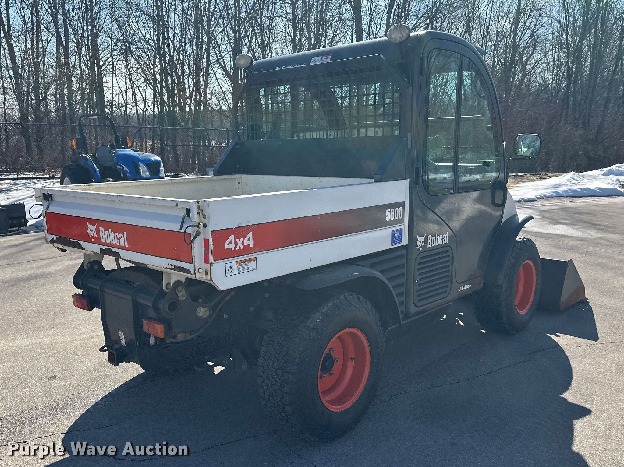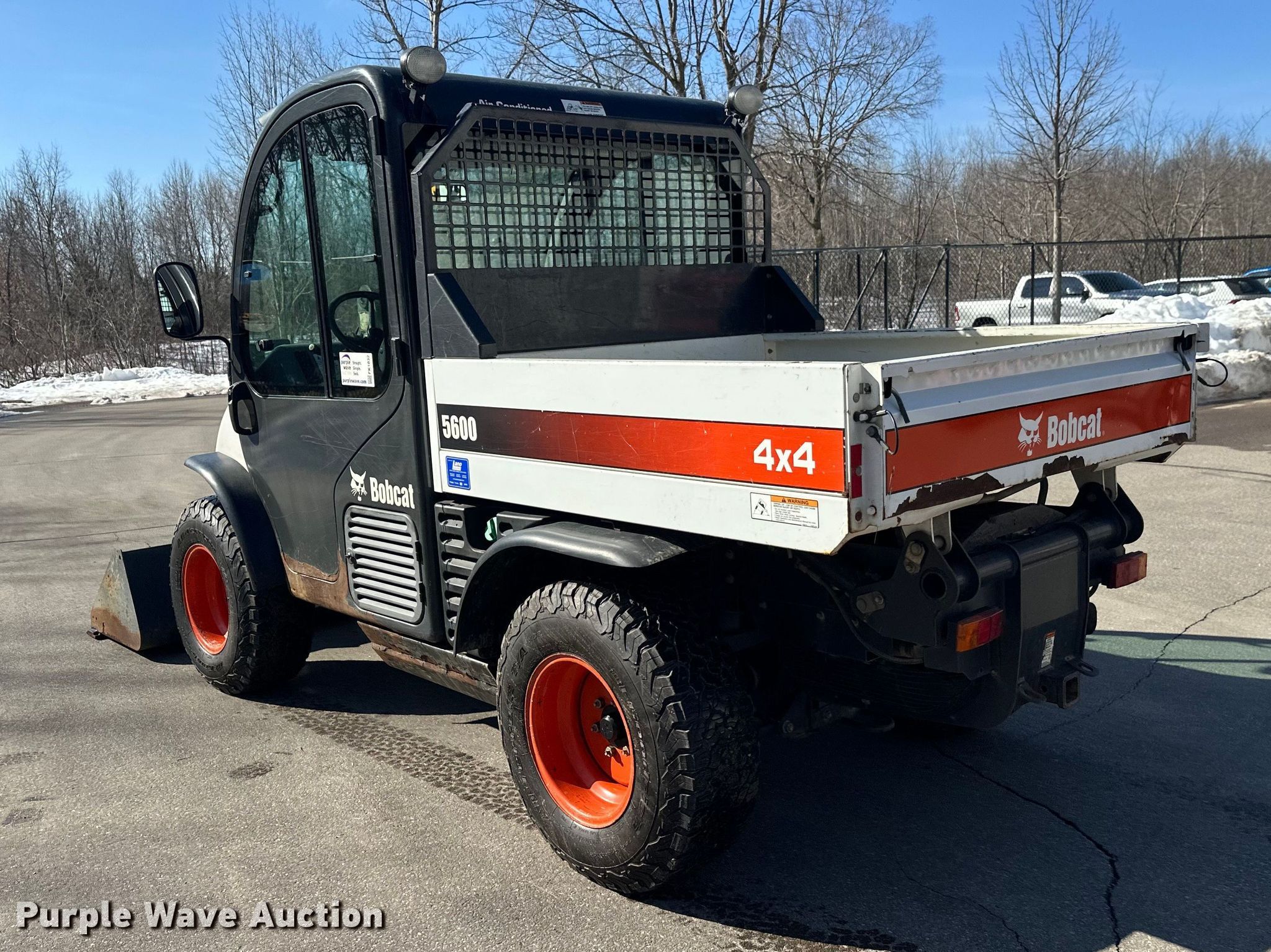2019 Bobcat 5600 utility vehicle. Hours: 4,013 on meter, Serial: AHG816678. Engine Bobcat, Cylinders: 4, Fuel type: Diesel. Transmission Hydrostatic. Chassis Four wheel drive/ All wheel drive. Operators station Enclosed cab, AC, Heat, Bucket control: Hand. Features Auxiliary hydraulics, Dump bed 58" L x 56" W, Dump bed type: Hydraulic, Auxiliary electrical outlet, Quick coupler: Hydraulic, Bucket Width: 66", Cutting edge: Bolt-on. Tires Size: 21x10.5R15. Transfer of ownership documentation will be a bill of sale. Three Rivers Parks. Maple Plain, MN 55359