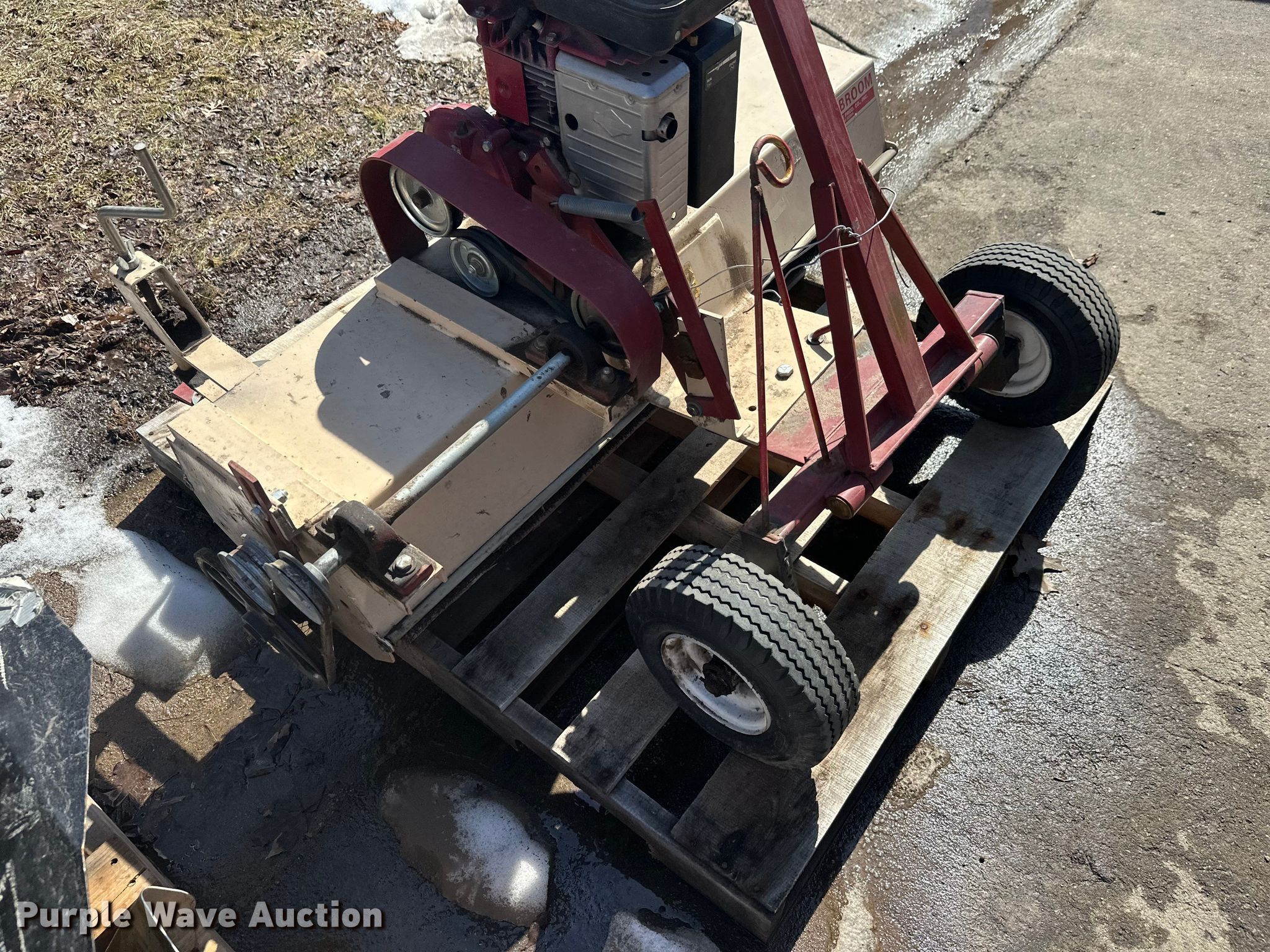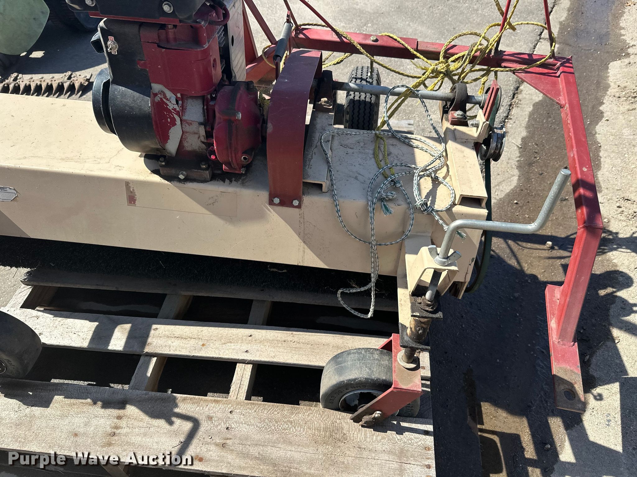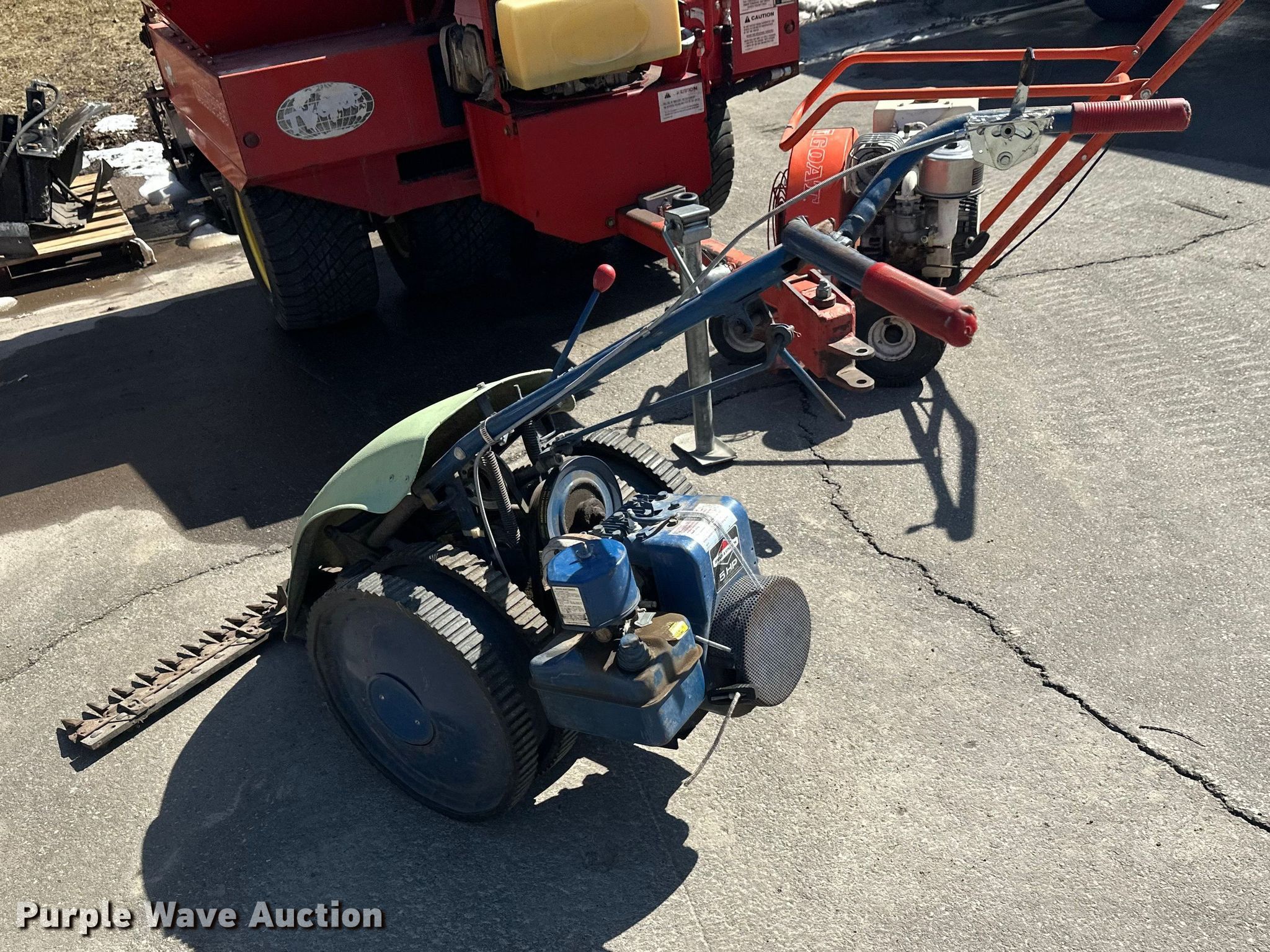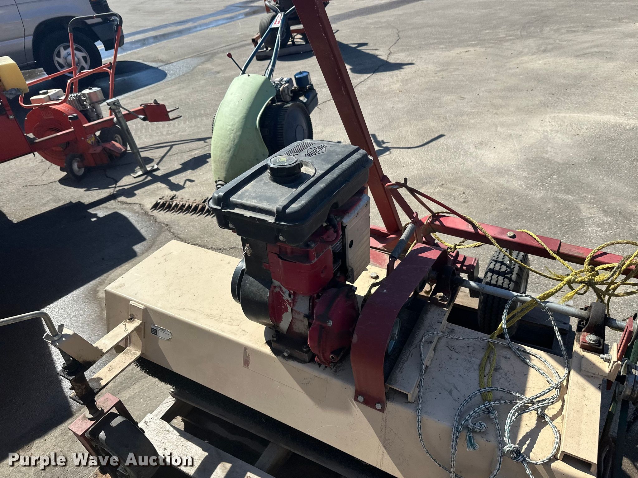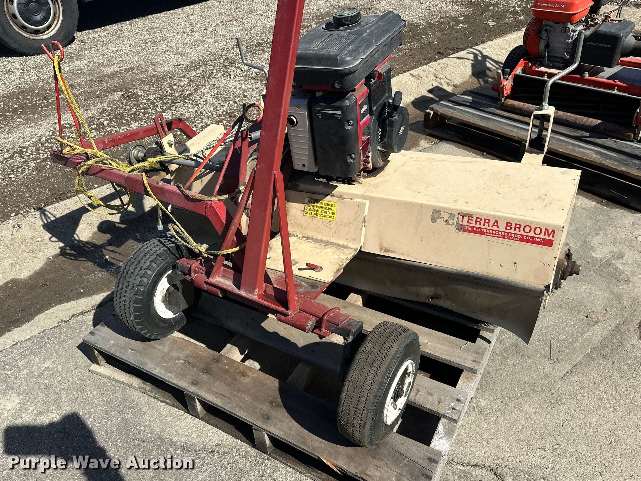 Purple Wave is selling a used Lawn and Garden in Minnesota. This item is a Lawn and garden equipment with the following: Terra broom, Jacobsen reel mower, Billy goat blower, Tycrop quick pass, Sickle mower, Ryan core harvester