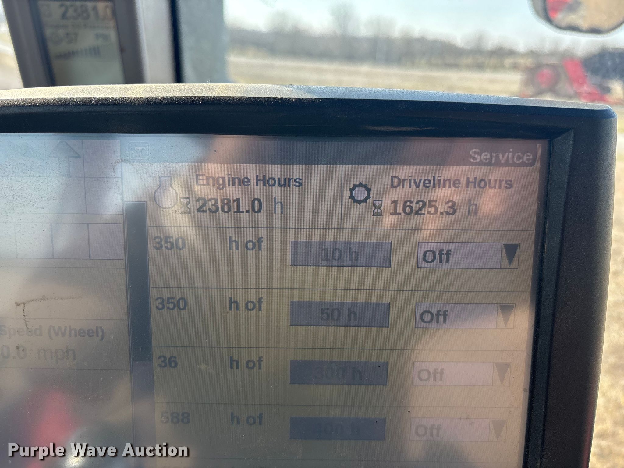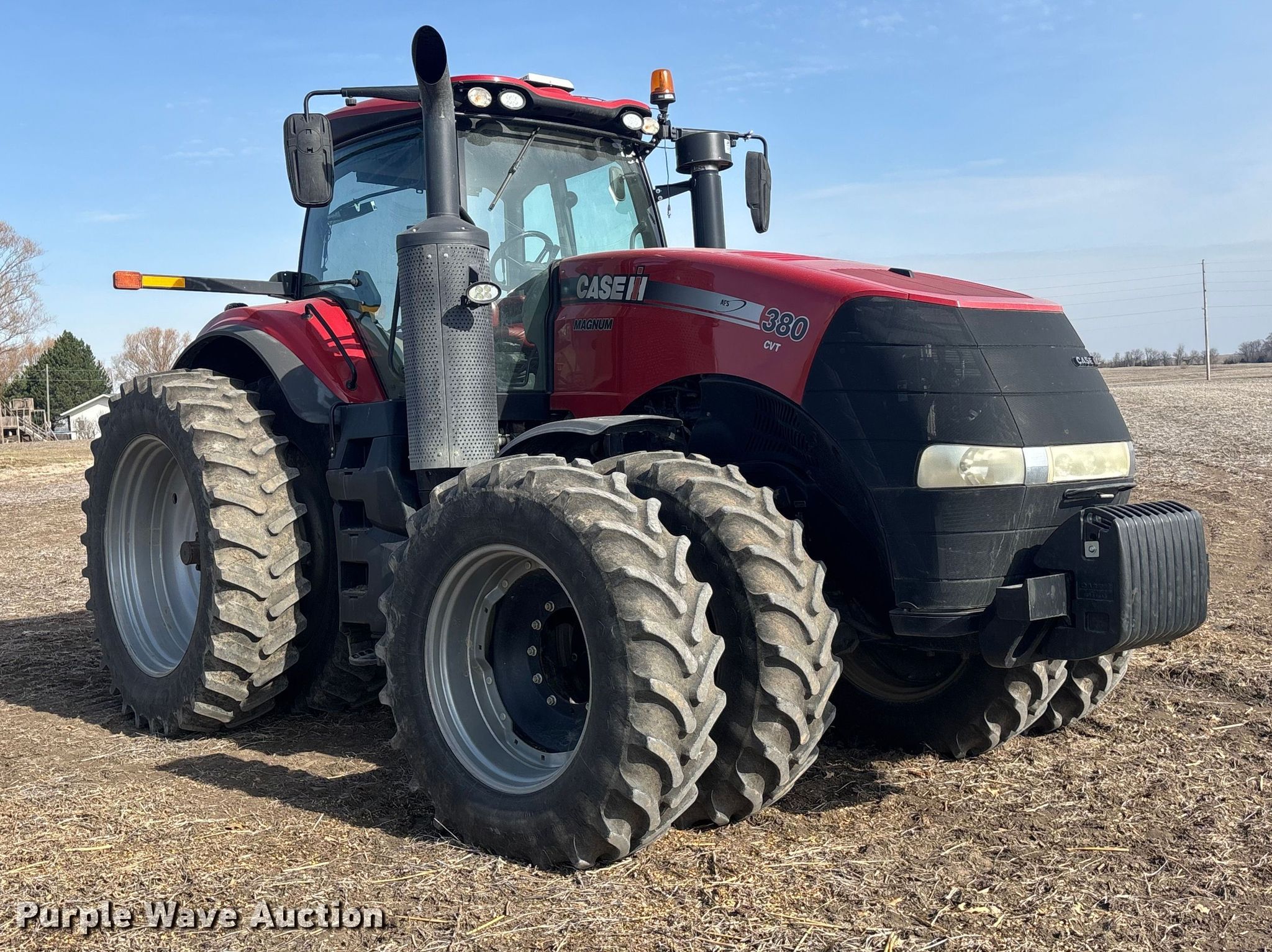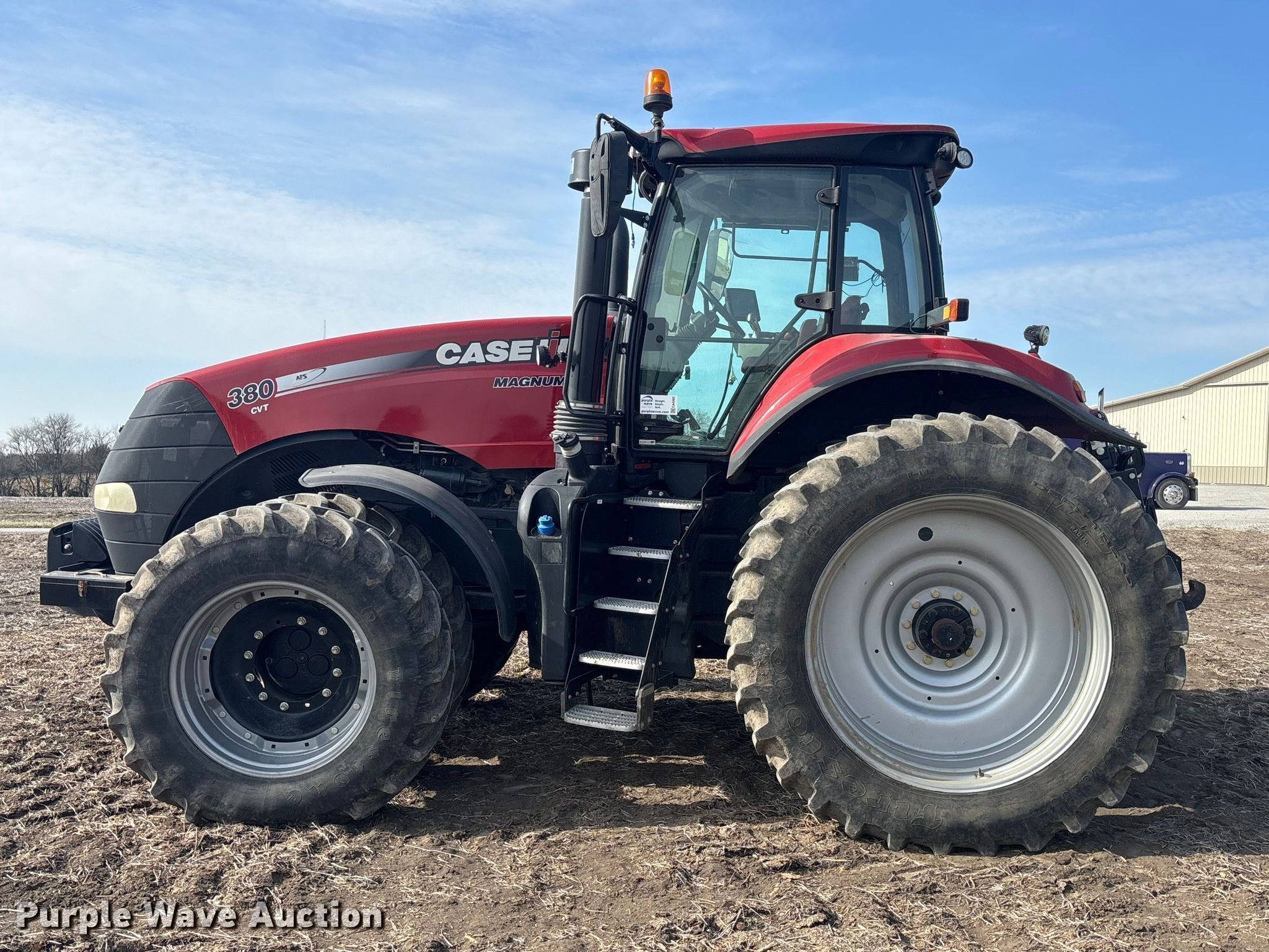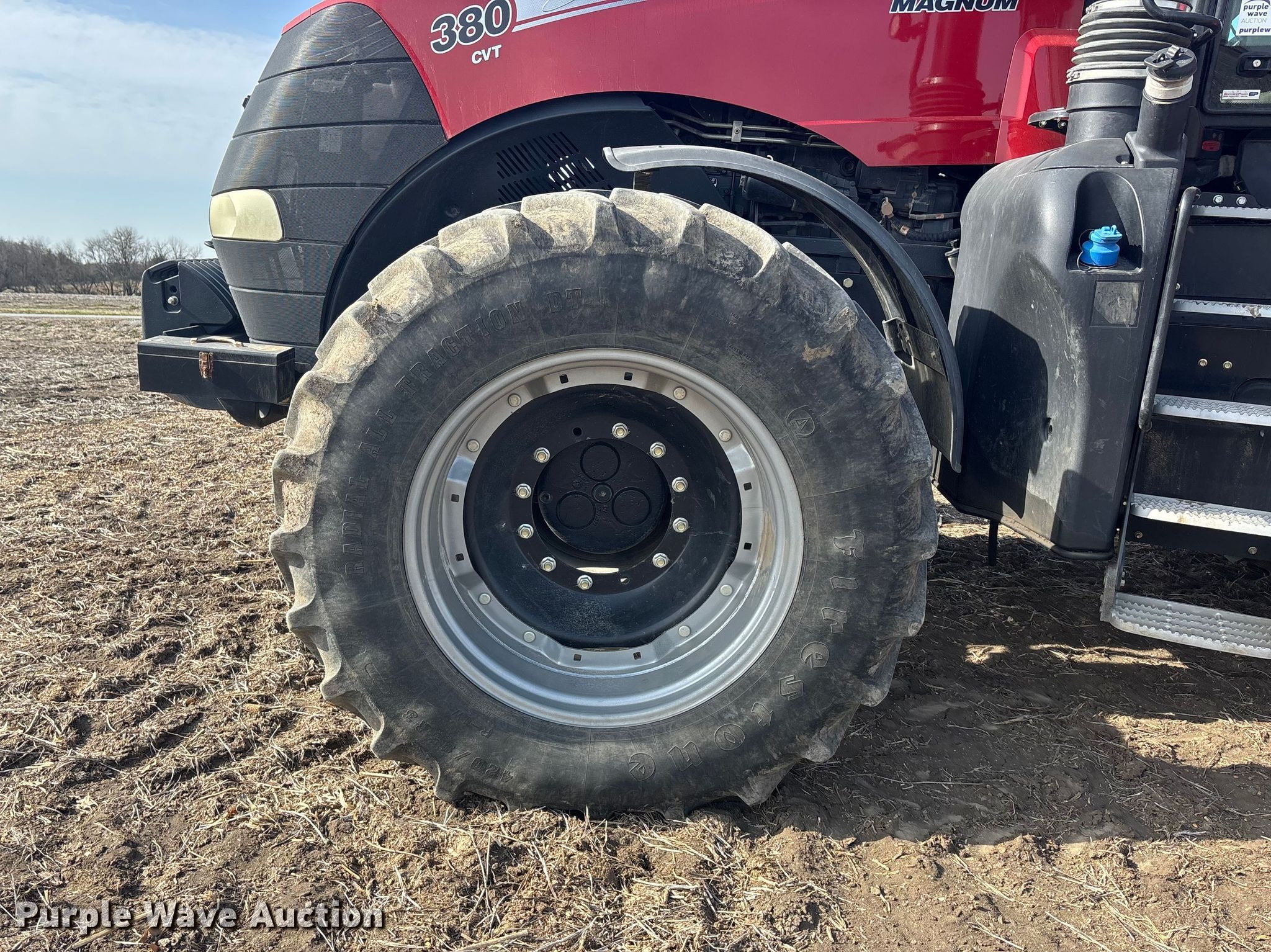 2019 Case 380 CVT Magnum MFWD tractor. Hours: 2,381 on meter, Serial: JJAM0380HJRF04438. Engine Displacement: 8.7, Cylinders: 6, Fuel type: Diesel. Transmission CVT, Left-hand reverser, Differential lock. Operators station AC, Heat, GPS receiver Case IH 372, Display, Auto steer. Features PTO: 1 3/4" 1000, Three point Quick attach, Seven pin outlet, Hydraulic remote sets Rear: 5, Suitcase weights: 10, Wheel weights. Tires Front: 420/85R34, Rear: 480/80R50, Duals, Front duals. Notes Cb radio not included. Tom Stirton Farms. Horton, KS 66439