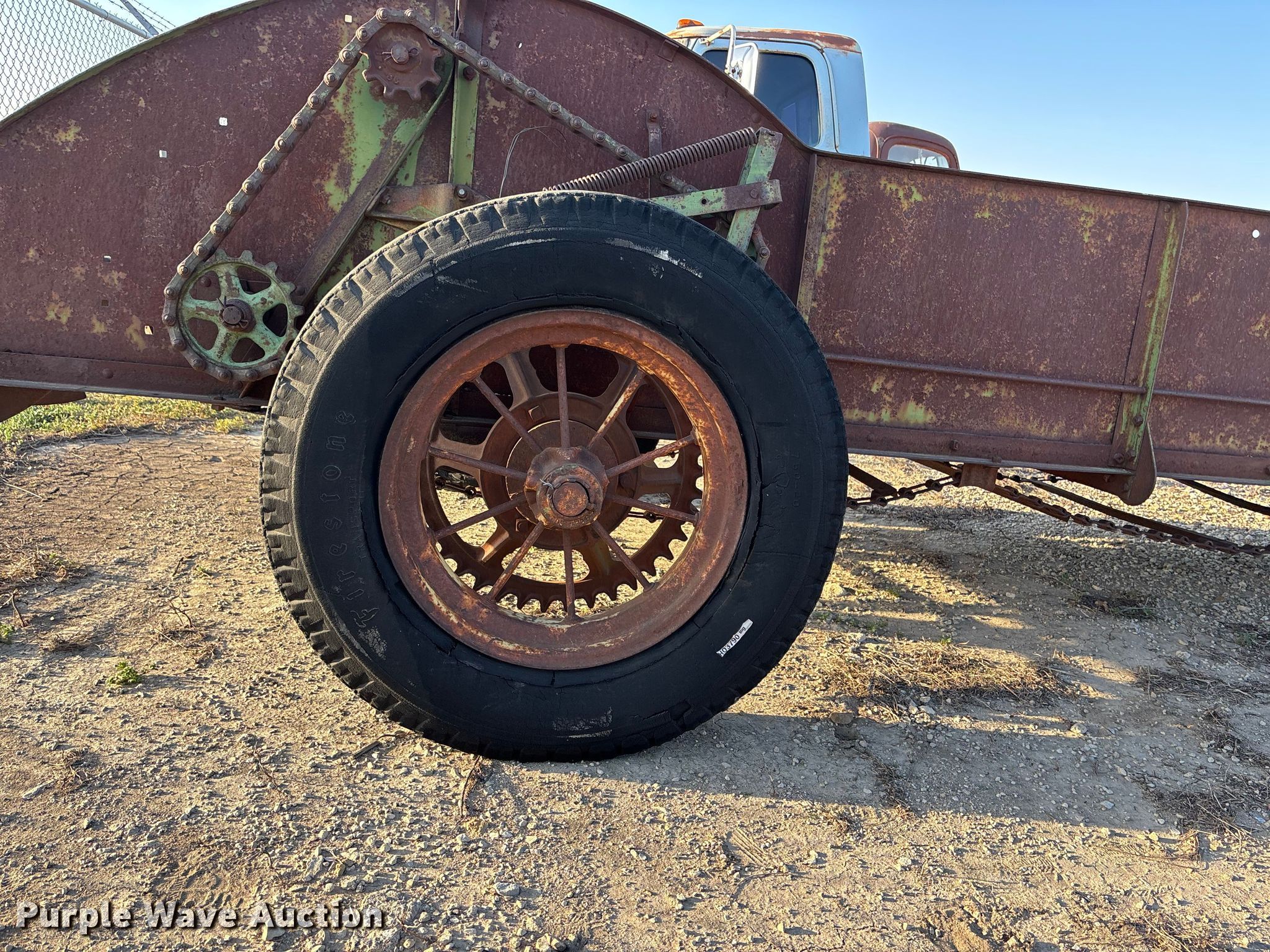 Manure spreader. Features. 8' L x 42" W, Side height: 20", Chain driven floor, Rear beaters: Horizontal. Tires Size: 7.50-20. Notes Flat tires, Parts missing. Irish Express, Inc.. Alma, KS 66401