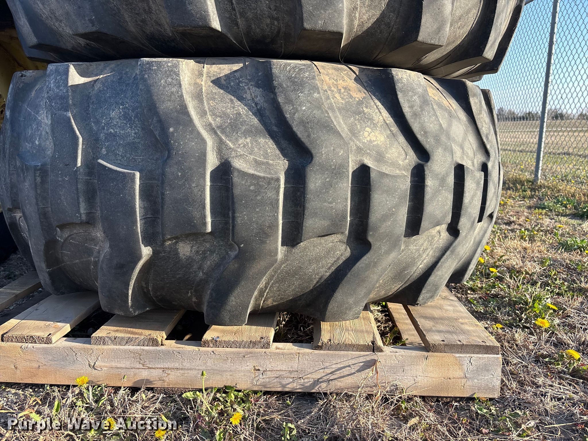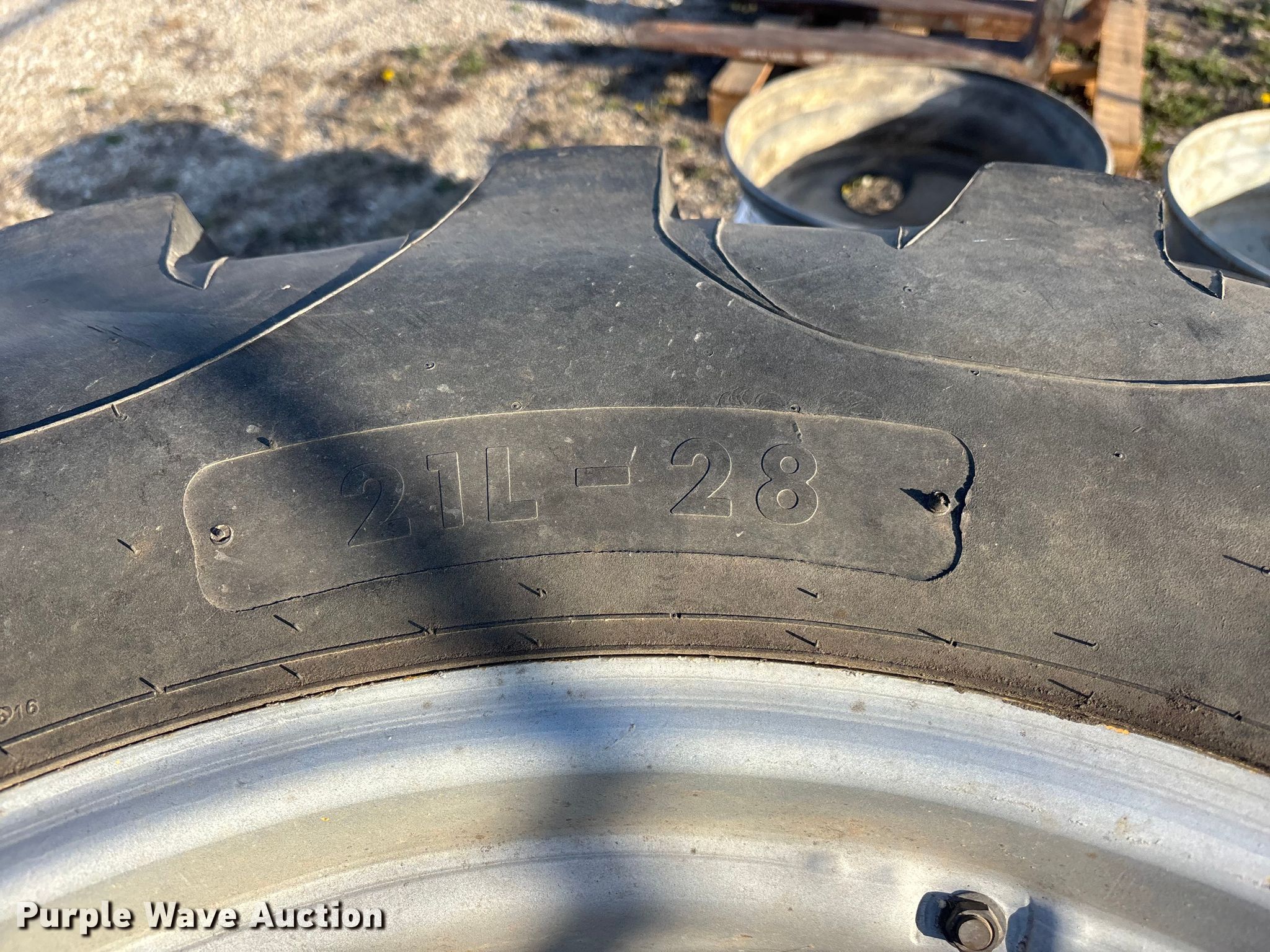 Purple Wave is selling a used Industrial Tires or Tracks in Kansas. This item is a (4) tires and wheels with the following: (2) 21L-28, (2) 11-24