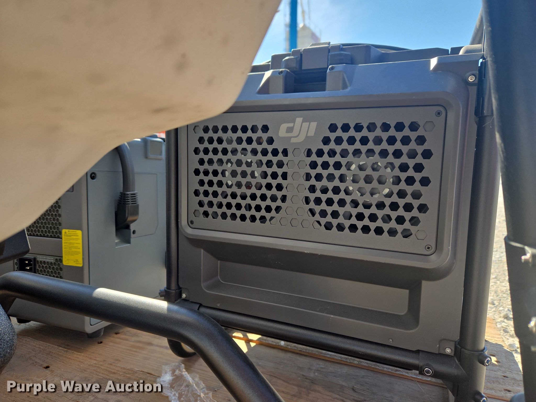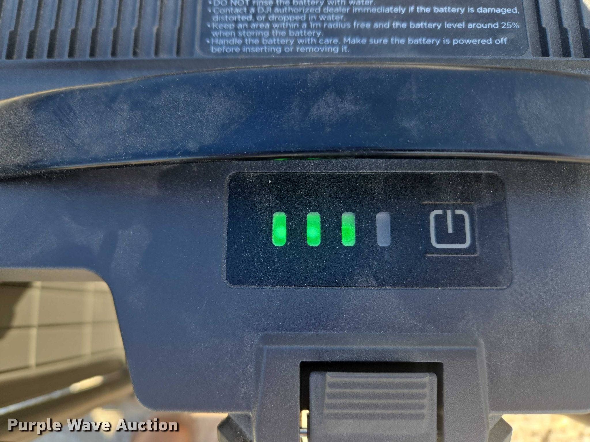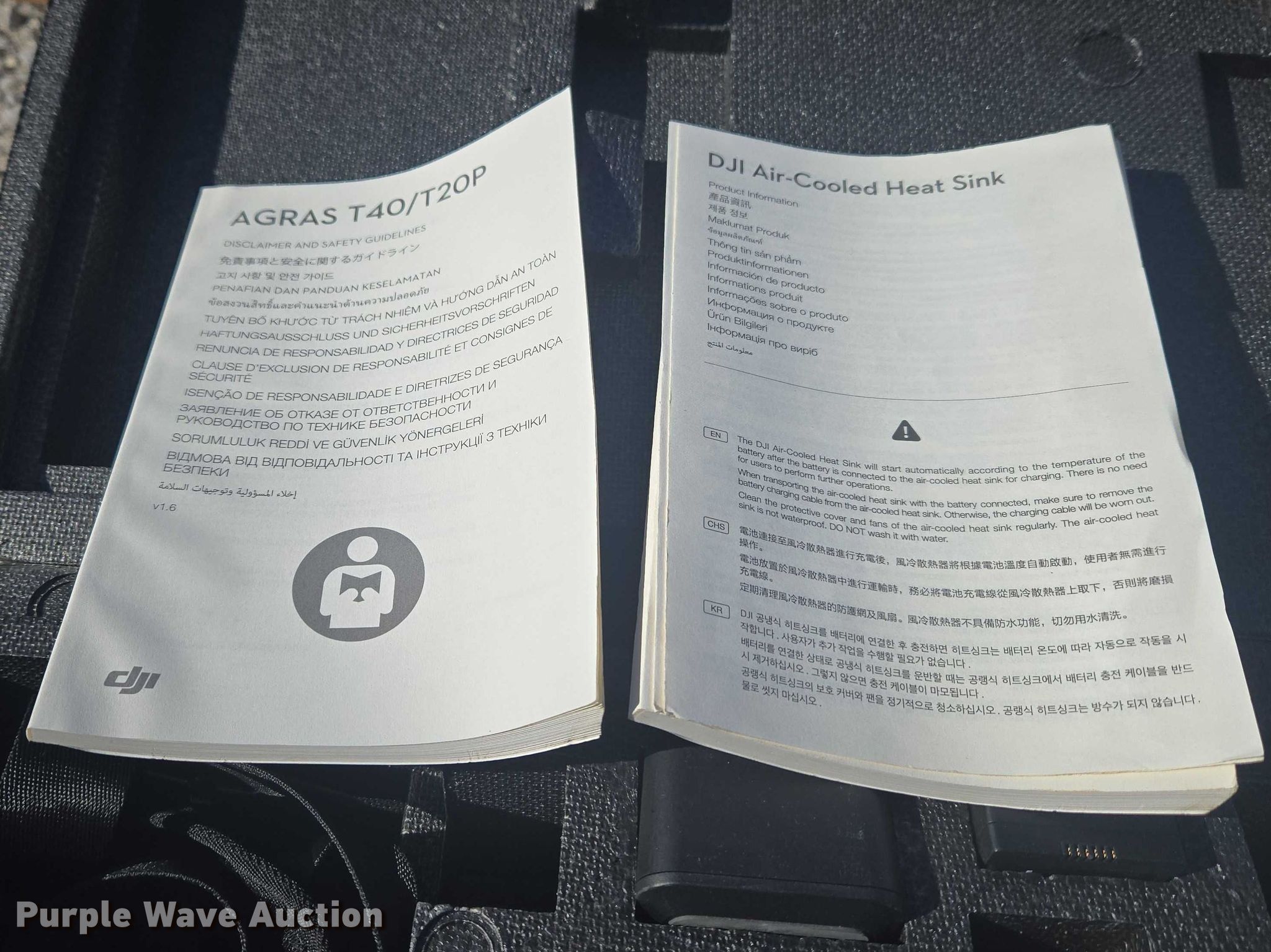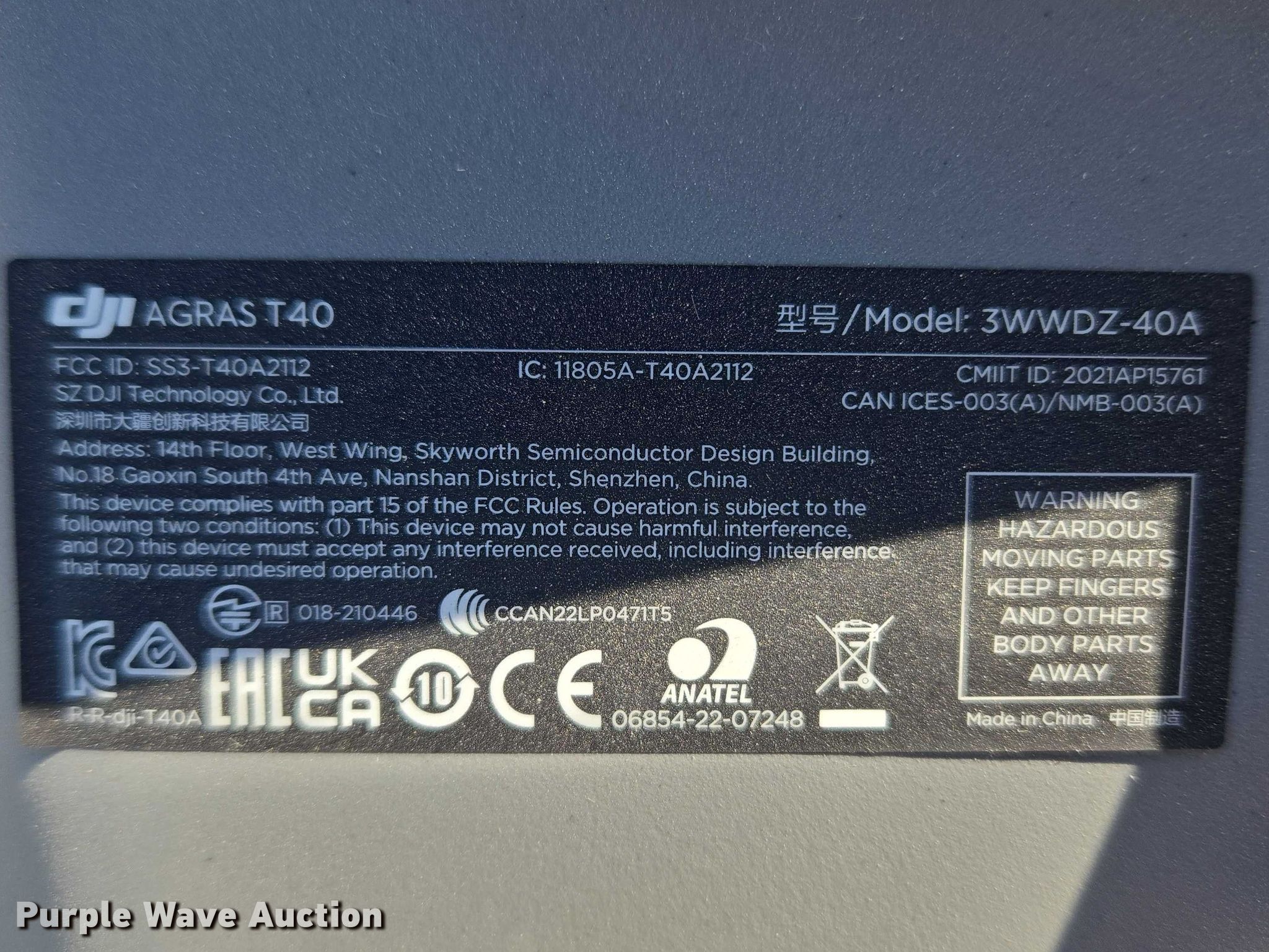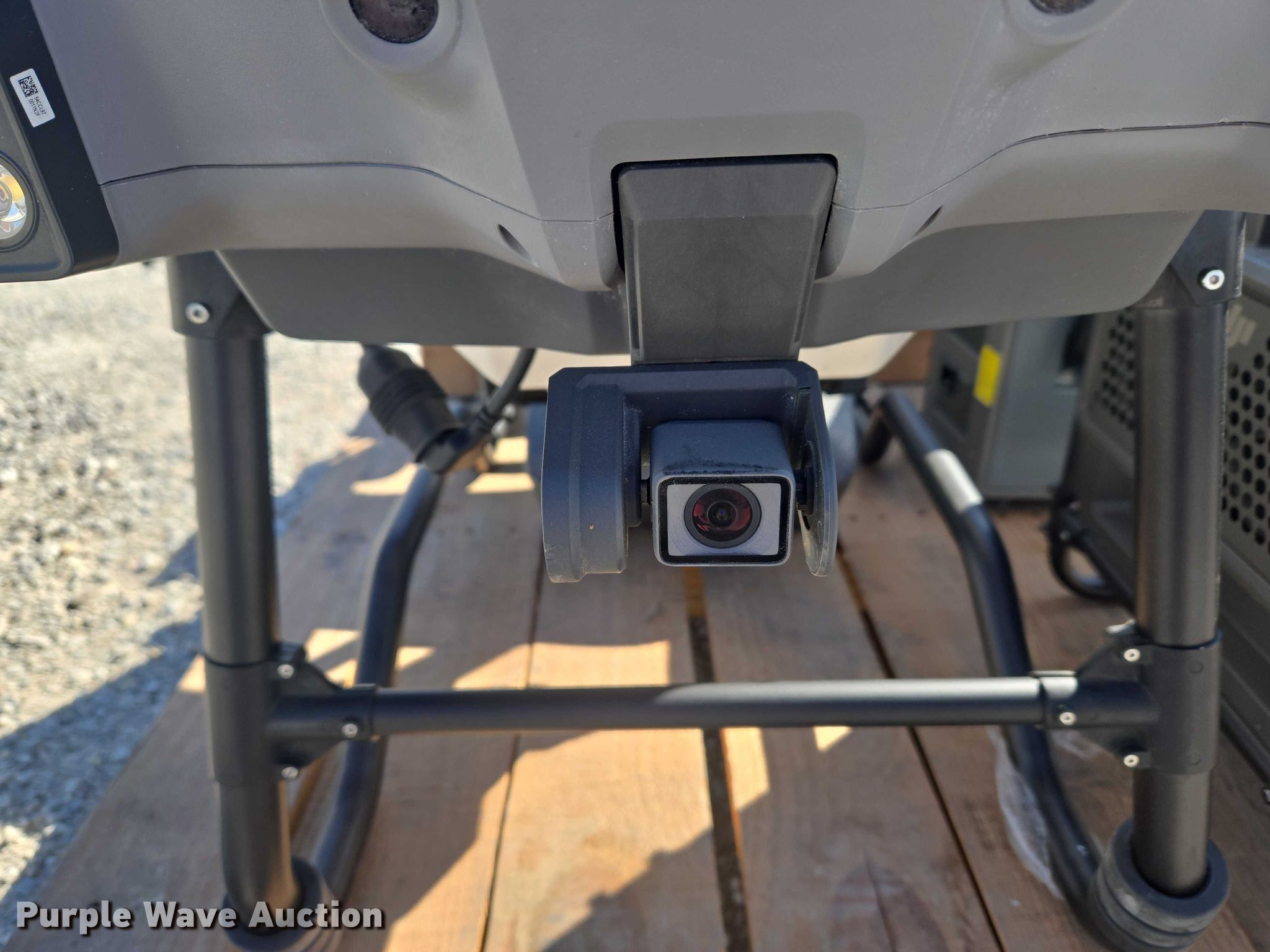 Purple Wave is selling a used Electronics in Indiana. This item is a DJI AGRIS T40 drone with the following: Serial: 64TBL9D00200ER, Parts kit, (2) batteries, Battery station, Liquid tank
