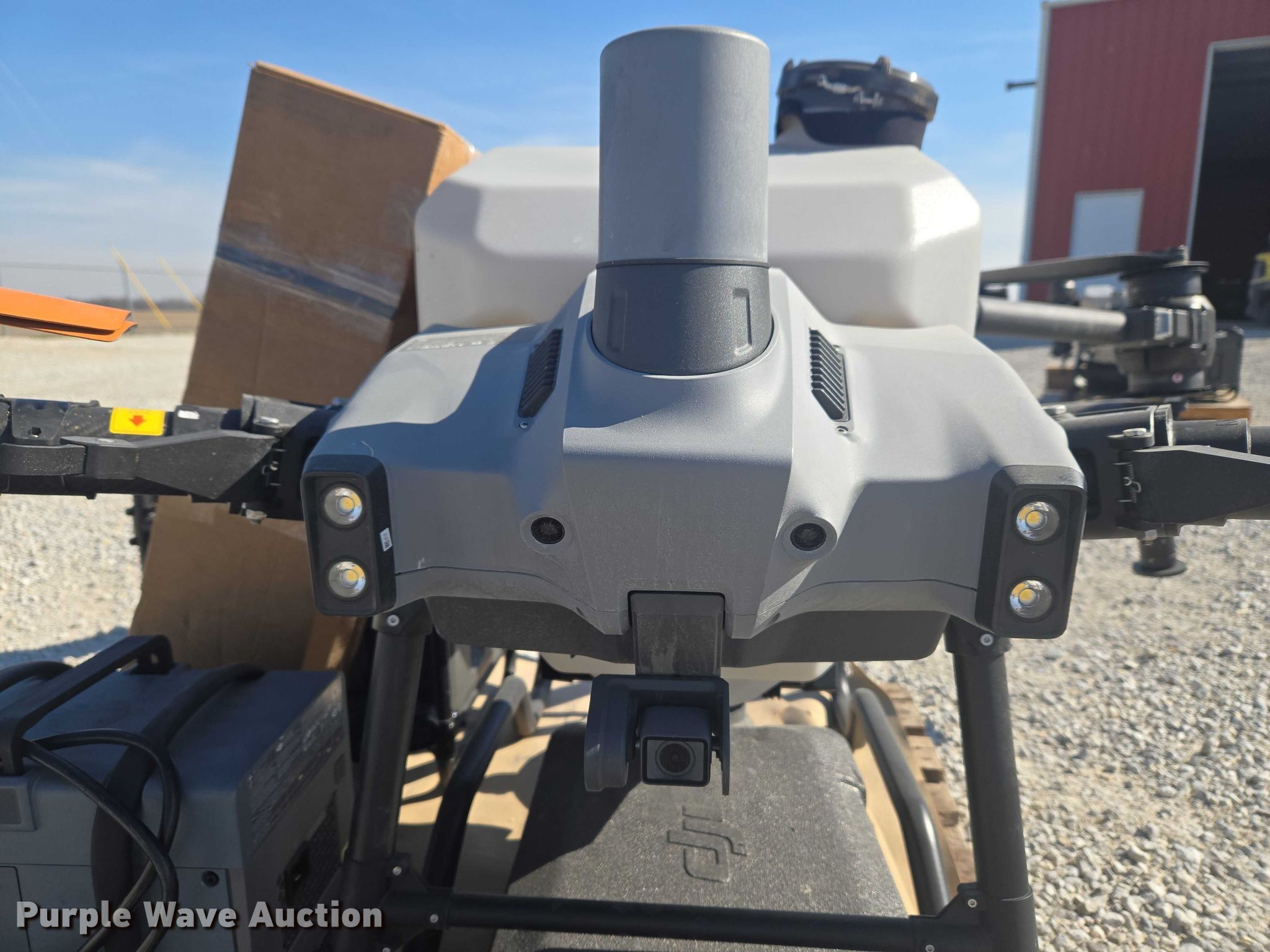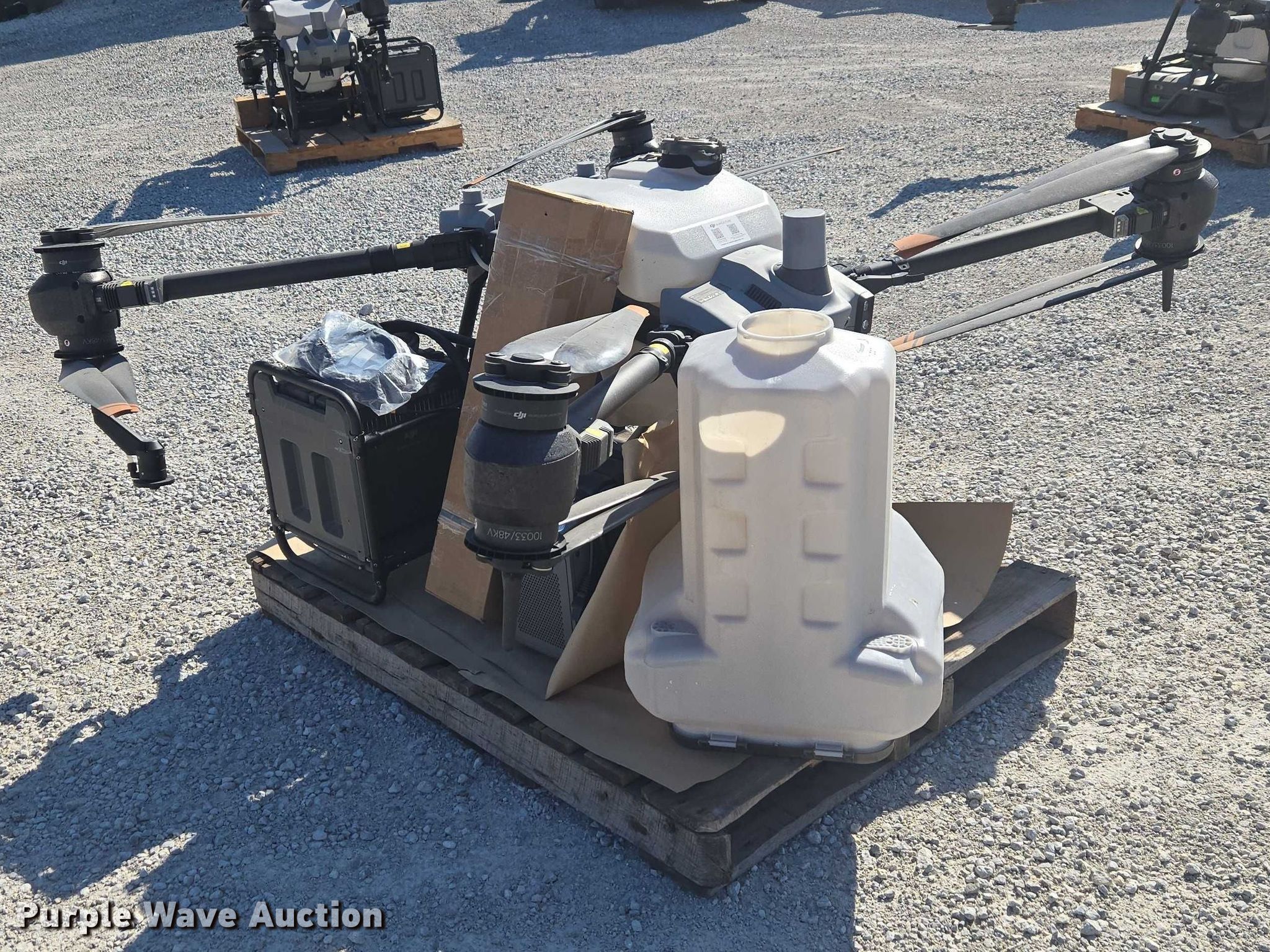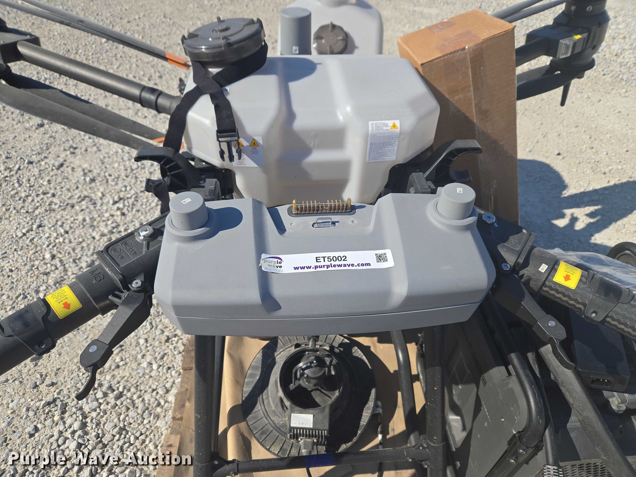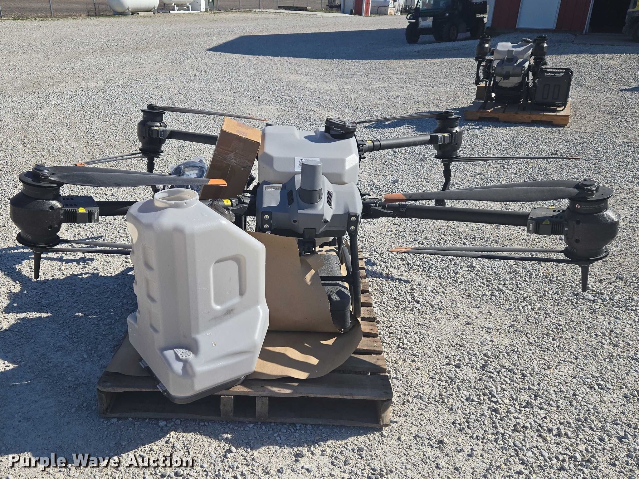 Purple Wave is selling a used Electronics in Indiana. This item is a DJI AGRAS T40 drone with the following: Serial: 64TBL8H0020049, Parts kit, (2) batteries, Battery station, Liquid tanks, Dry tanks