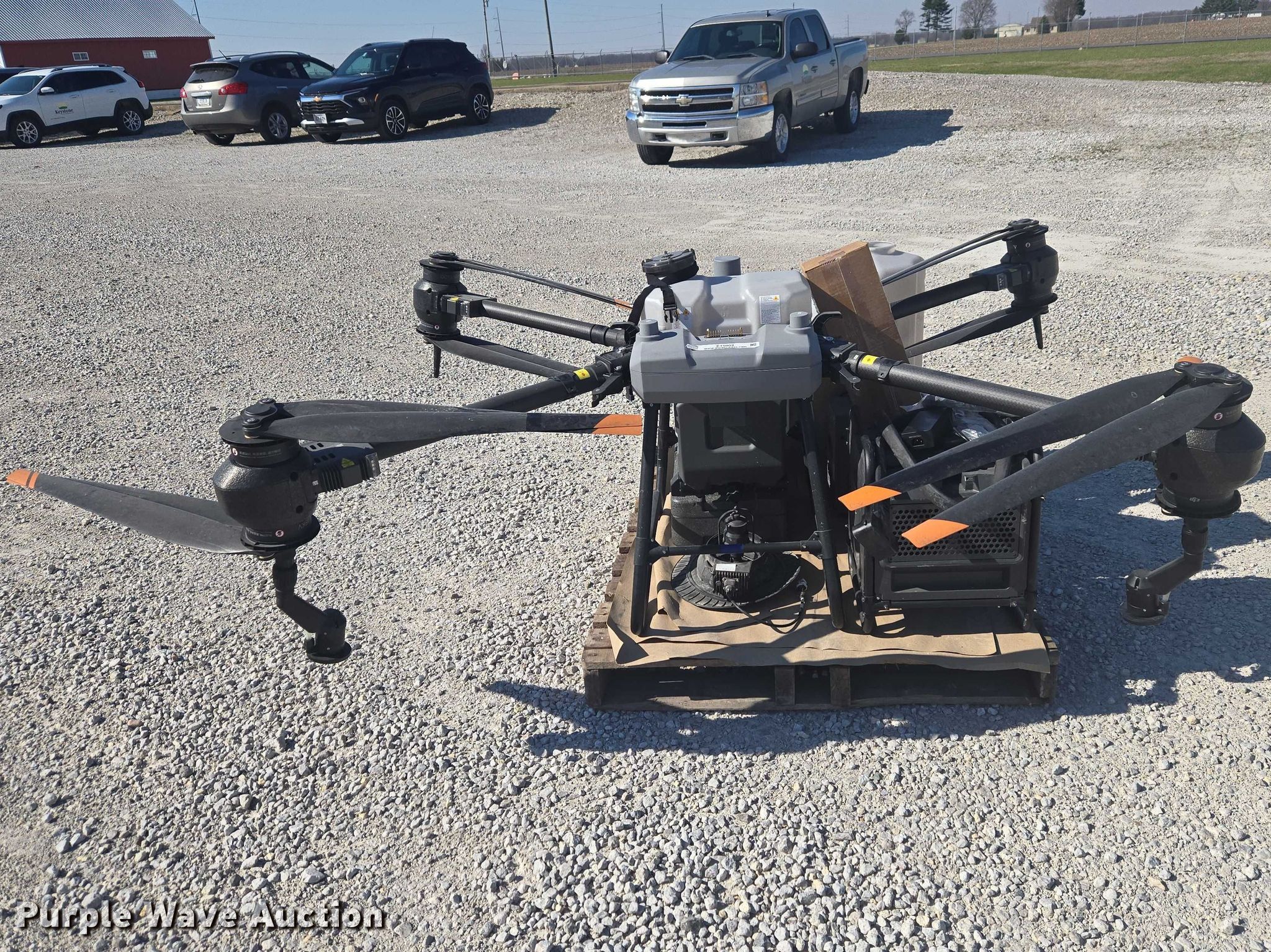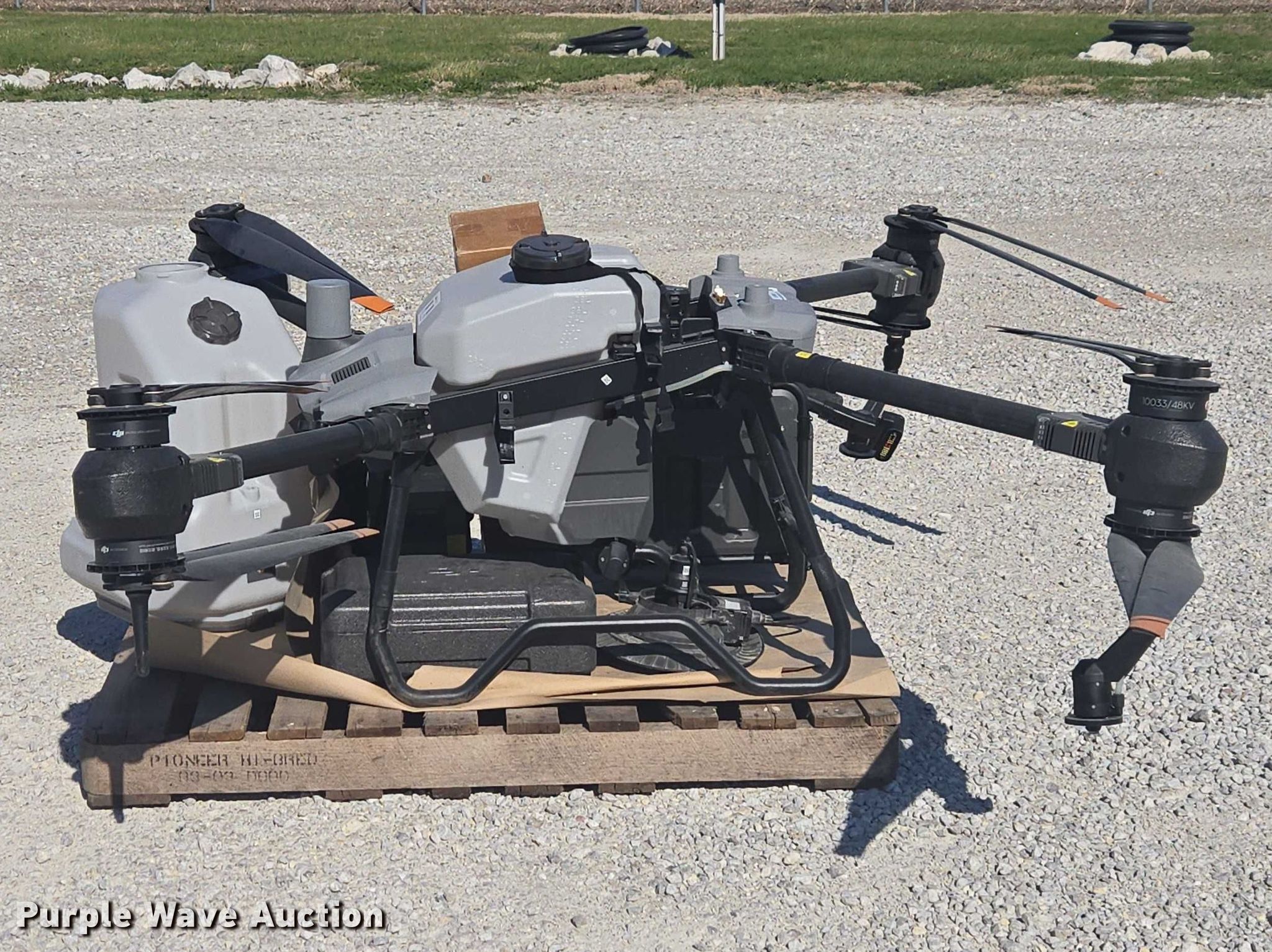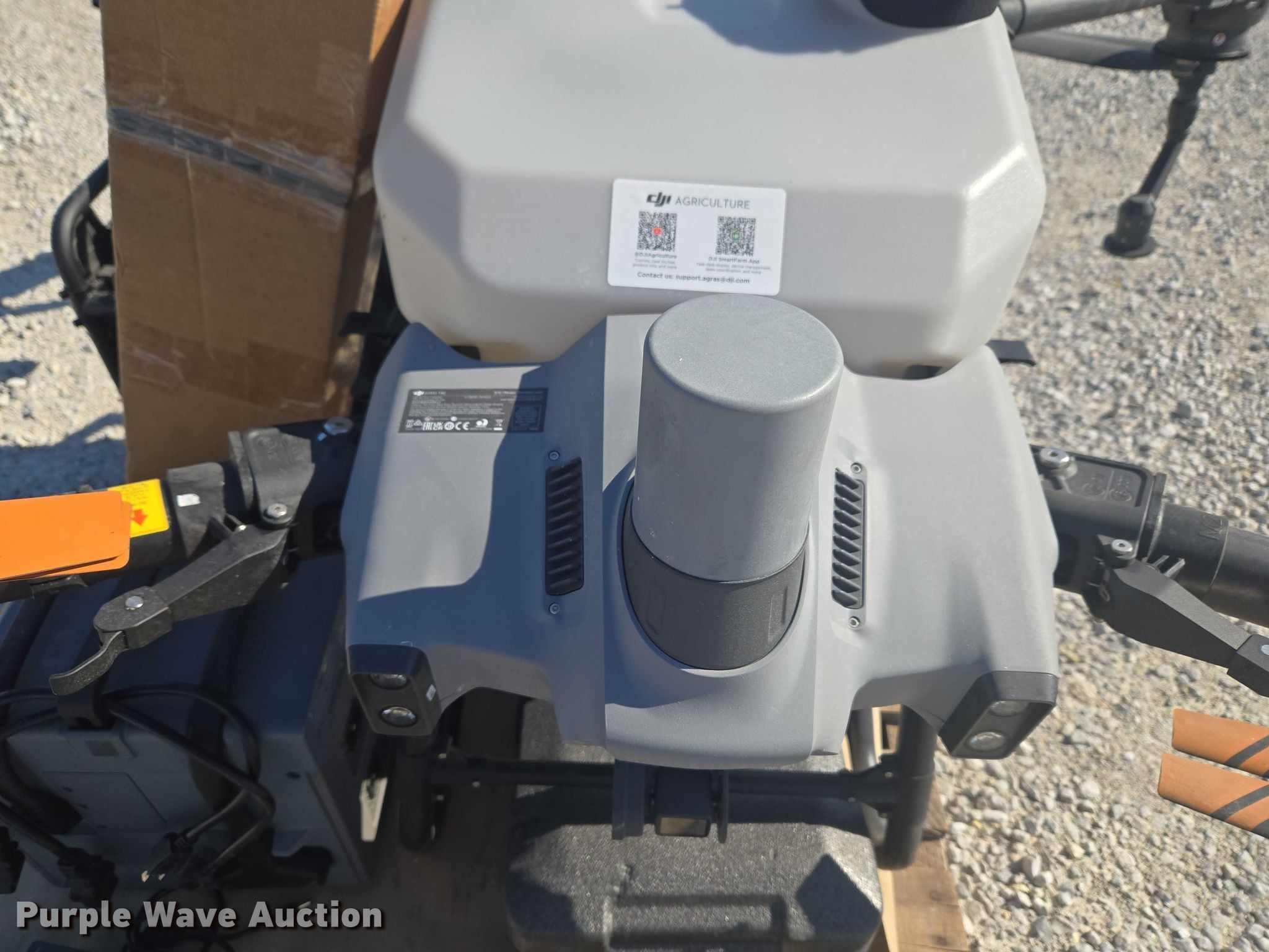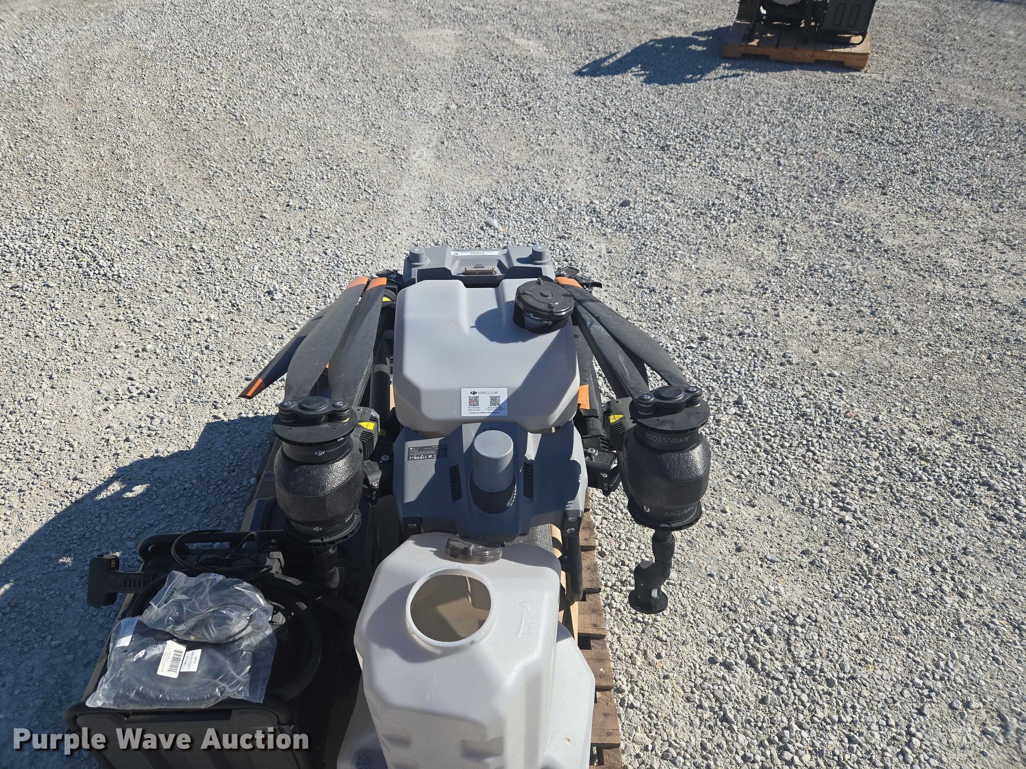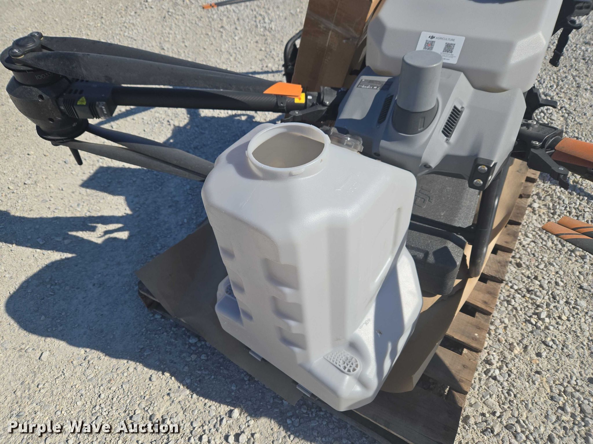Purple Wave is selling a used Electronics in Indiana. This item is a DJI AGRAS T40 drone with the following: Serial: 64TBL8H0020049, Parts kit, (2) batteries, Battery station, Liquid tanks, Dry tanks