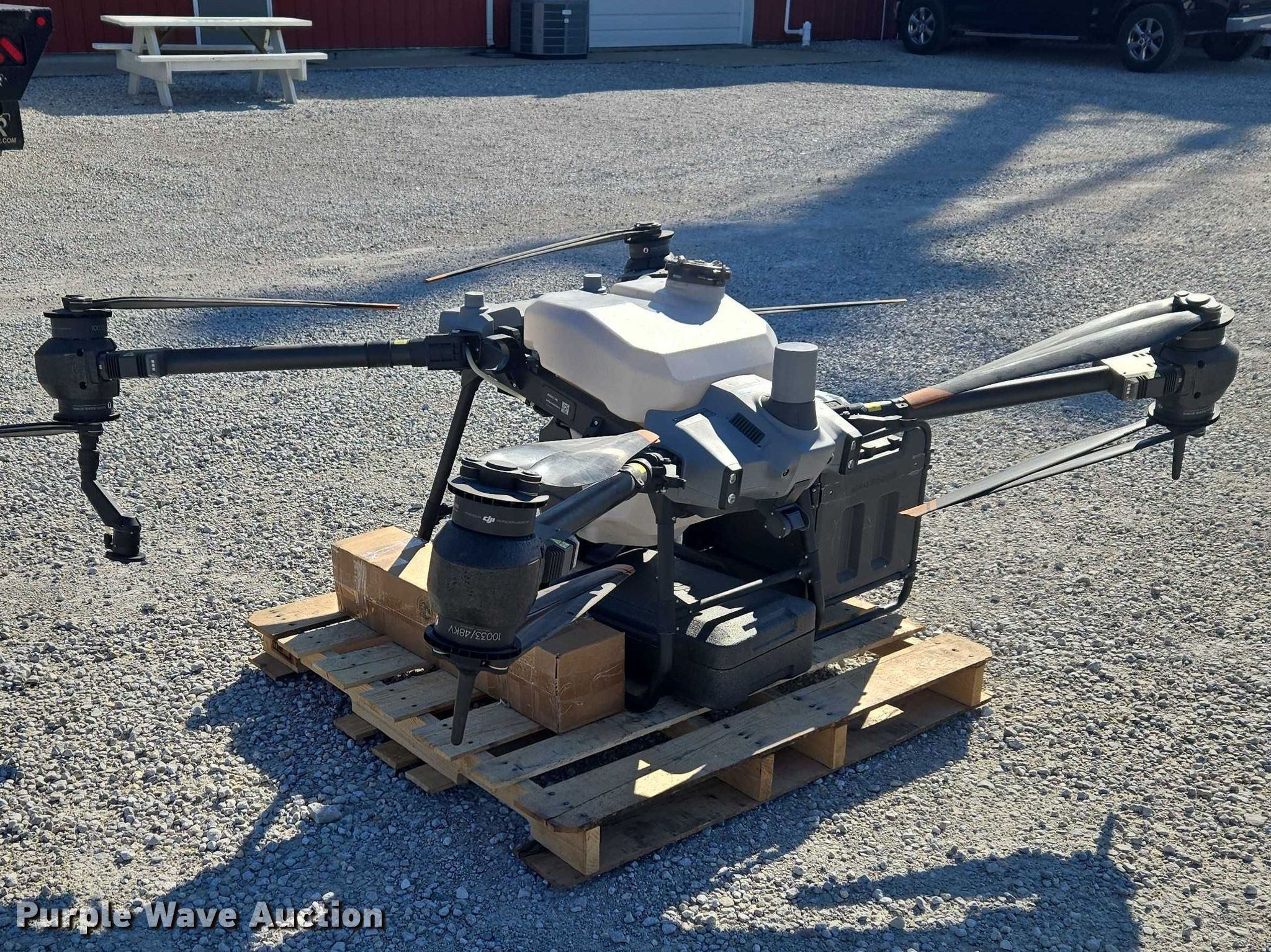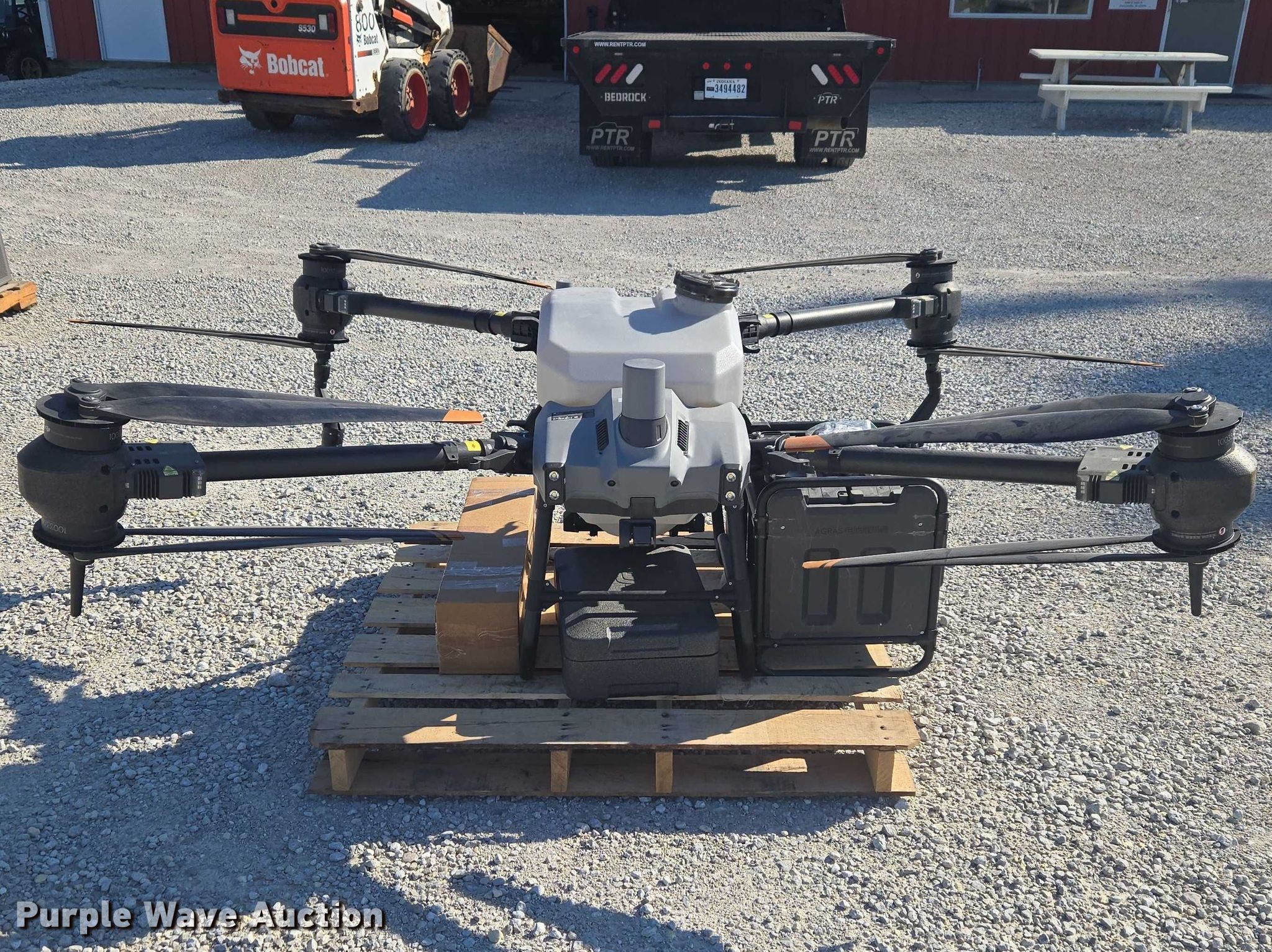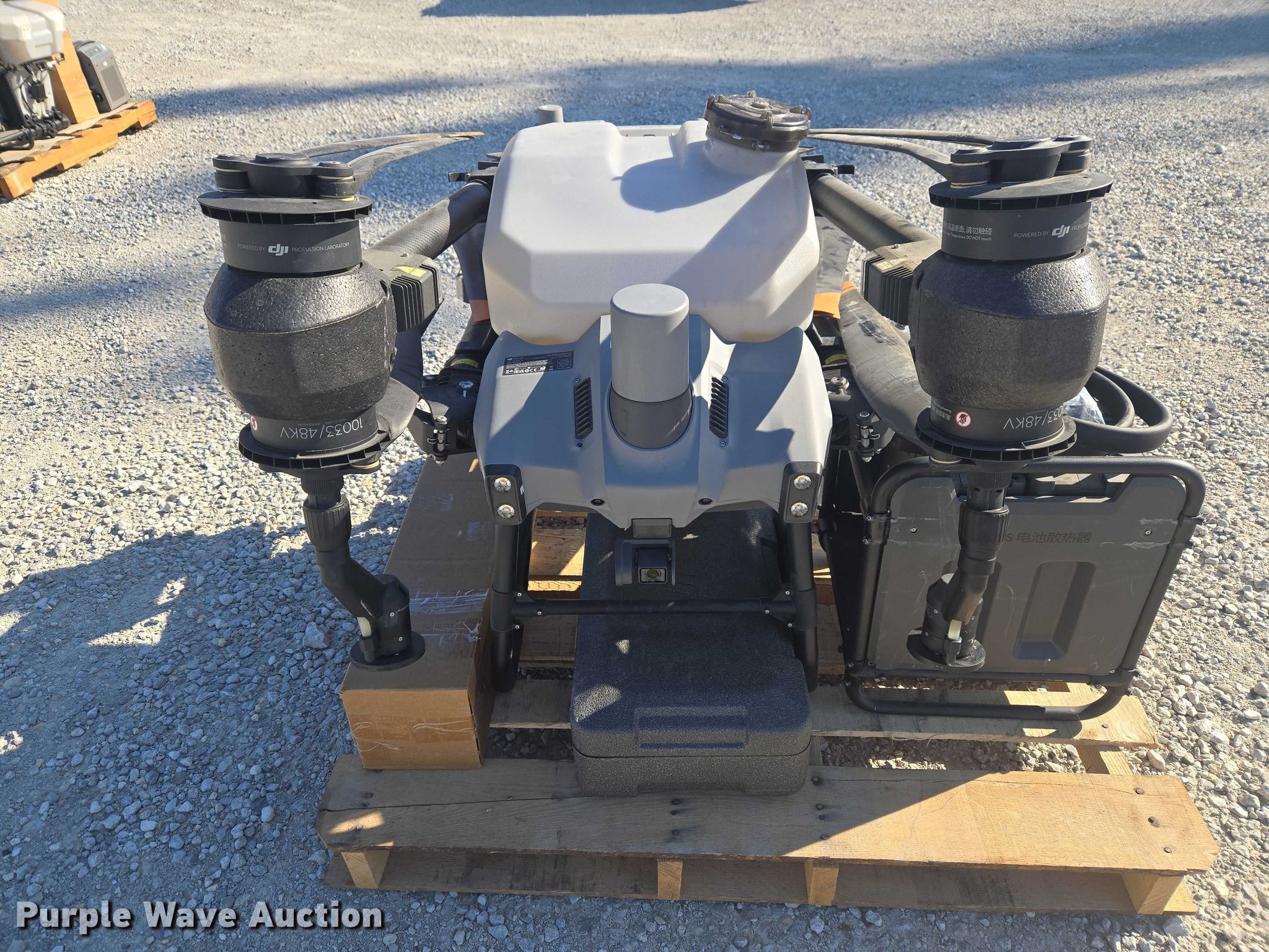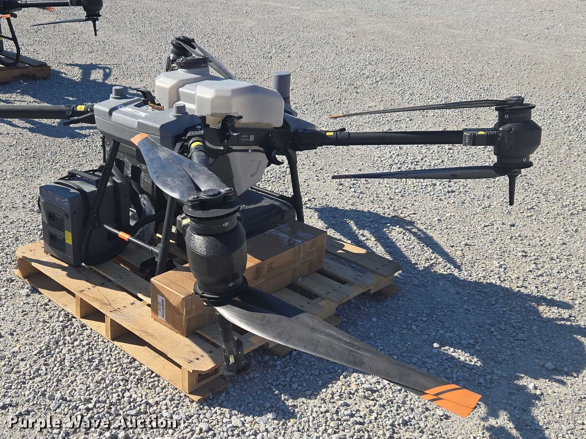 Purple Wave is selling a used Electronics in Indiana. This item is a DJI AGRAS T40 drone with the following: Serial: 6TBL7N00200CG, Parts kit, (2) batteries, Battery station, Liquid tank