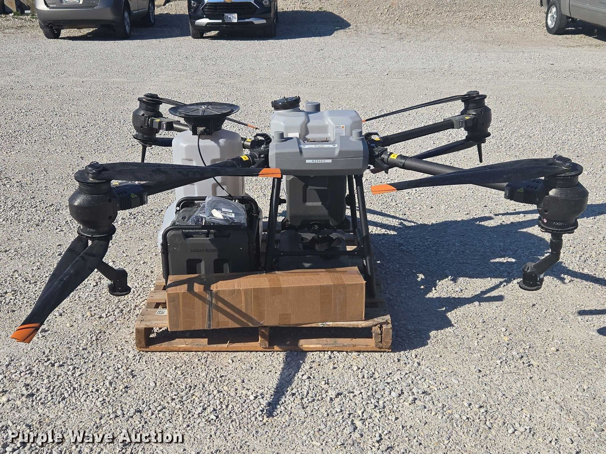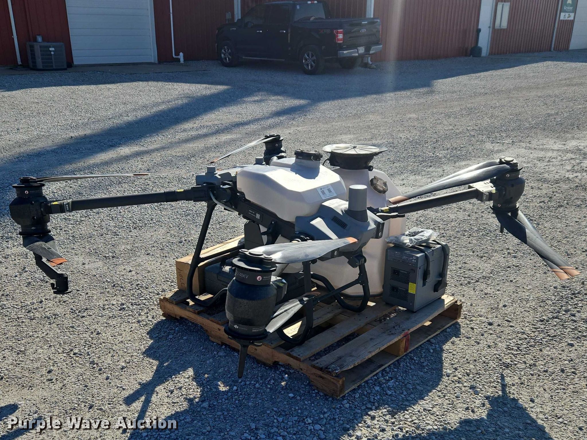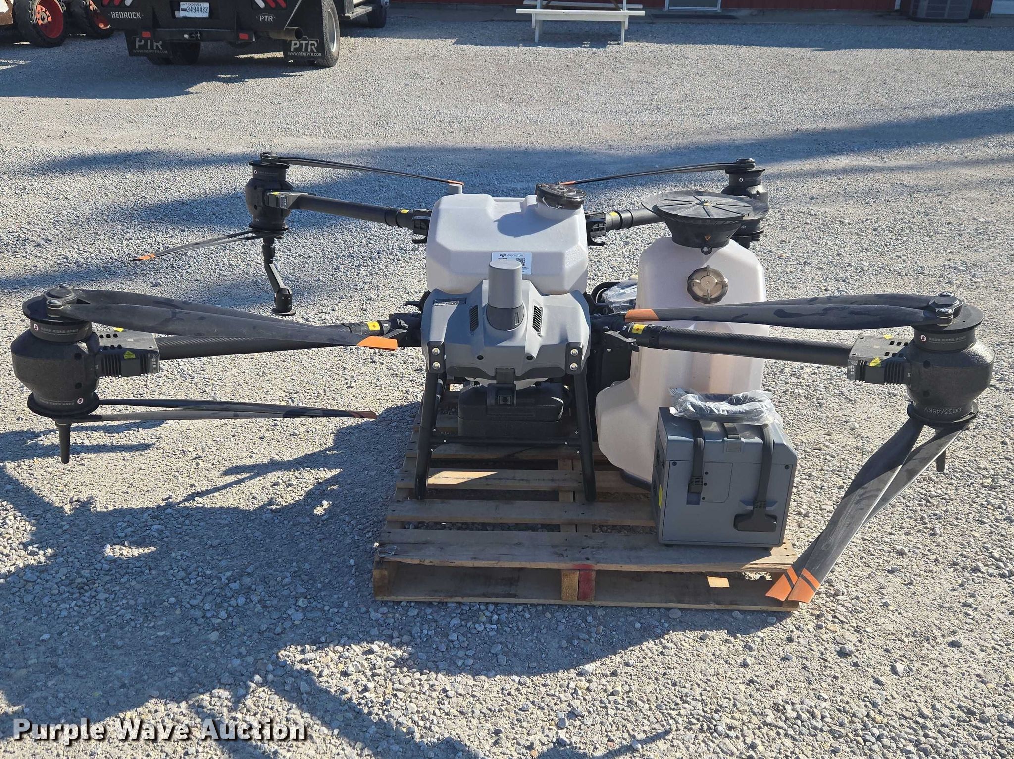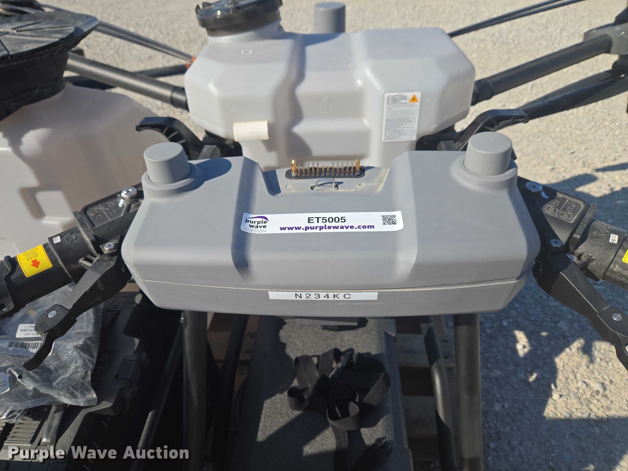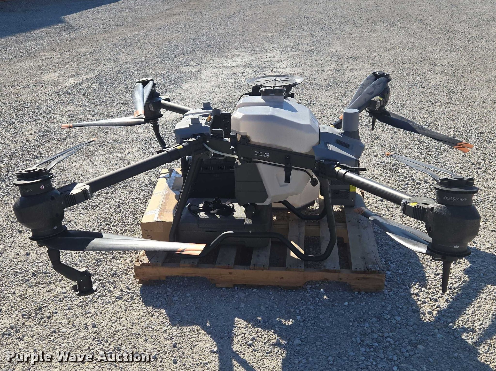 Purple Wave is selling a used Electronics in Indiana. This item is a DJI AGRAS T40 drone with the following: Serial: 64TBL7H00200D0, Parts kit, (2) batteries, Battery station, Liquid tank