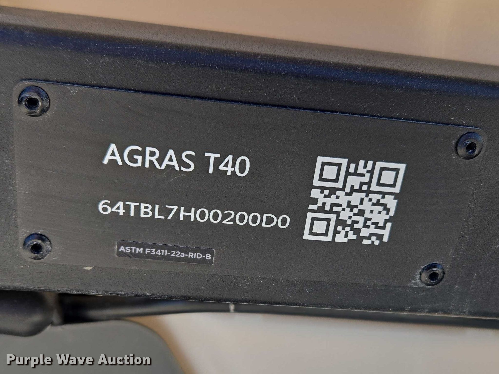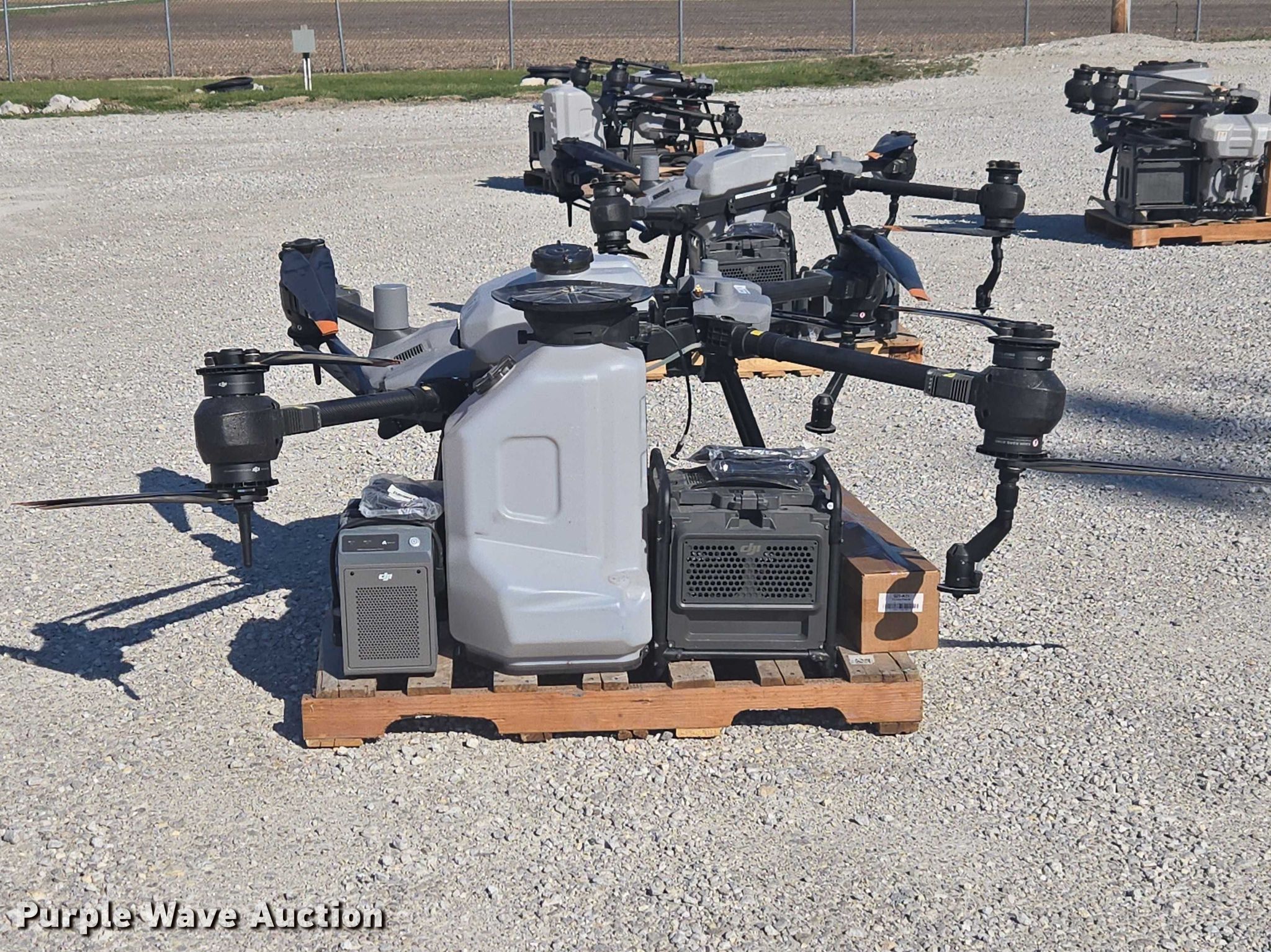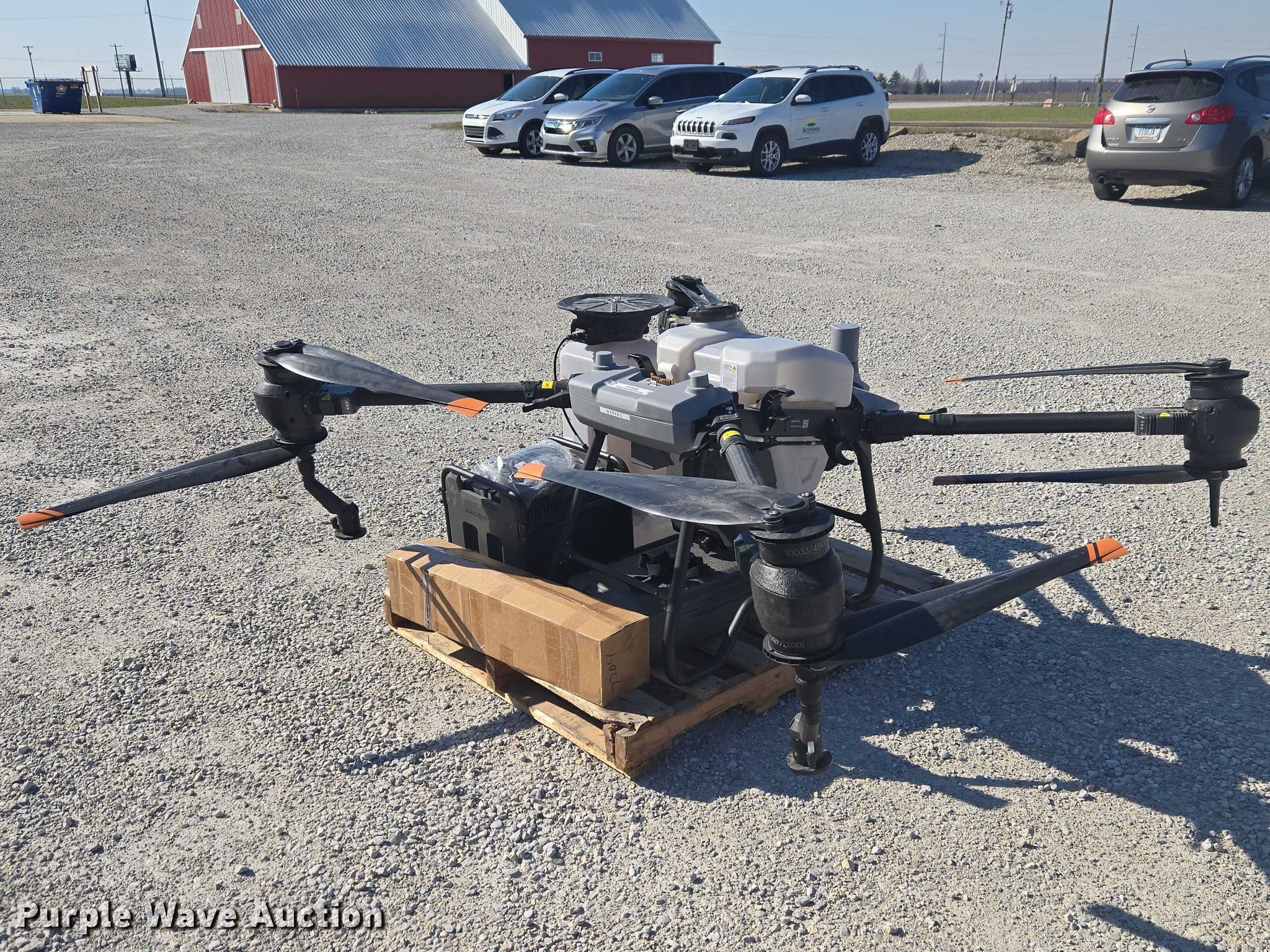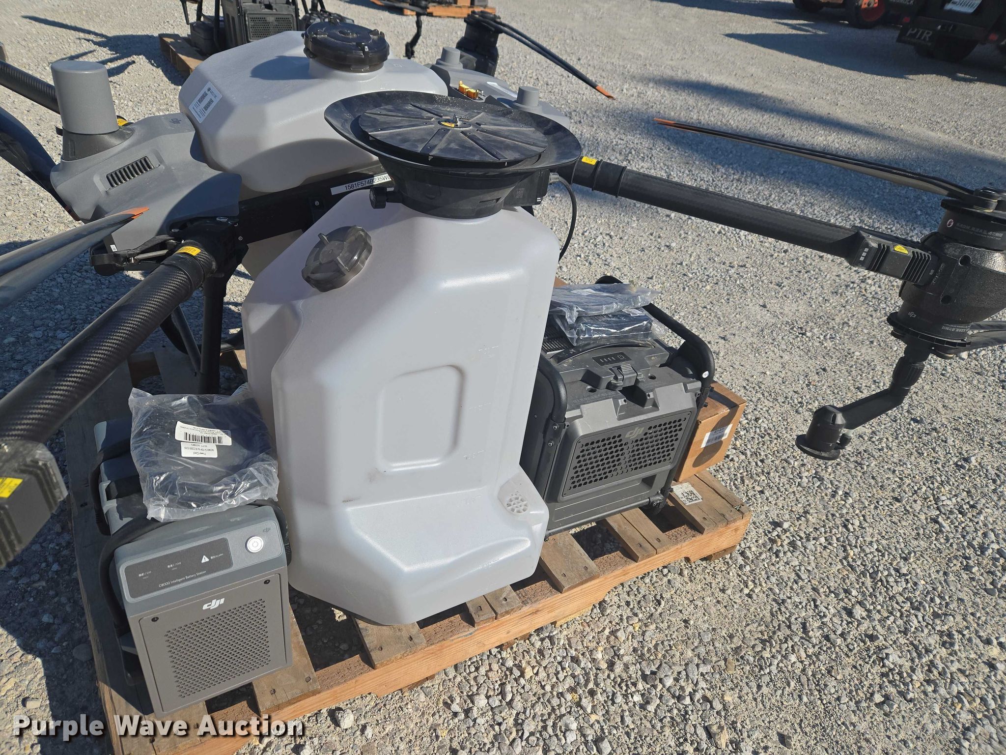 Purple Wave is selling a used Electronics in Indiana. This item is a DJI AGRAS T40 drone with the following: Serial: 64TBL7H00200D0, Parts kit, (2) batteries, Battery station, Liquid tank
