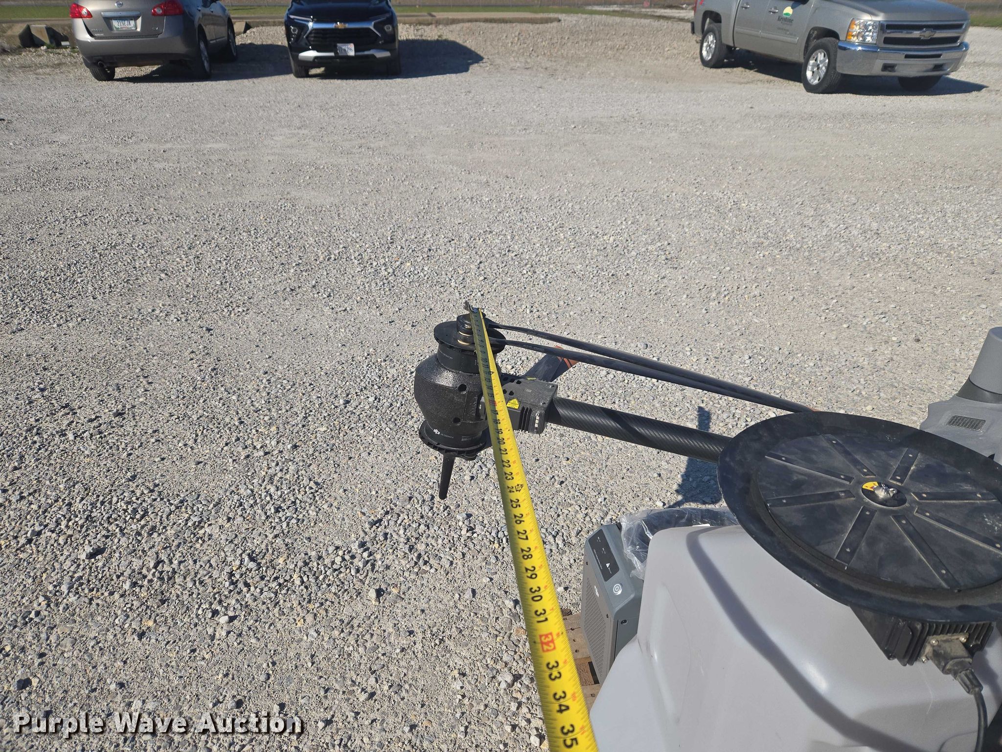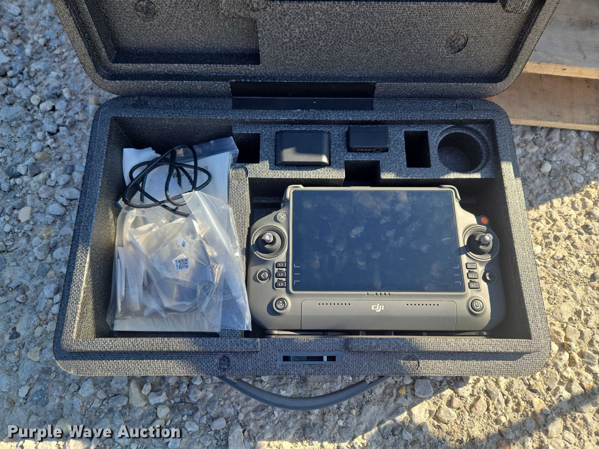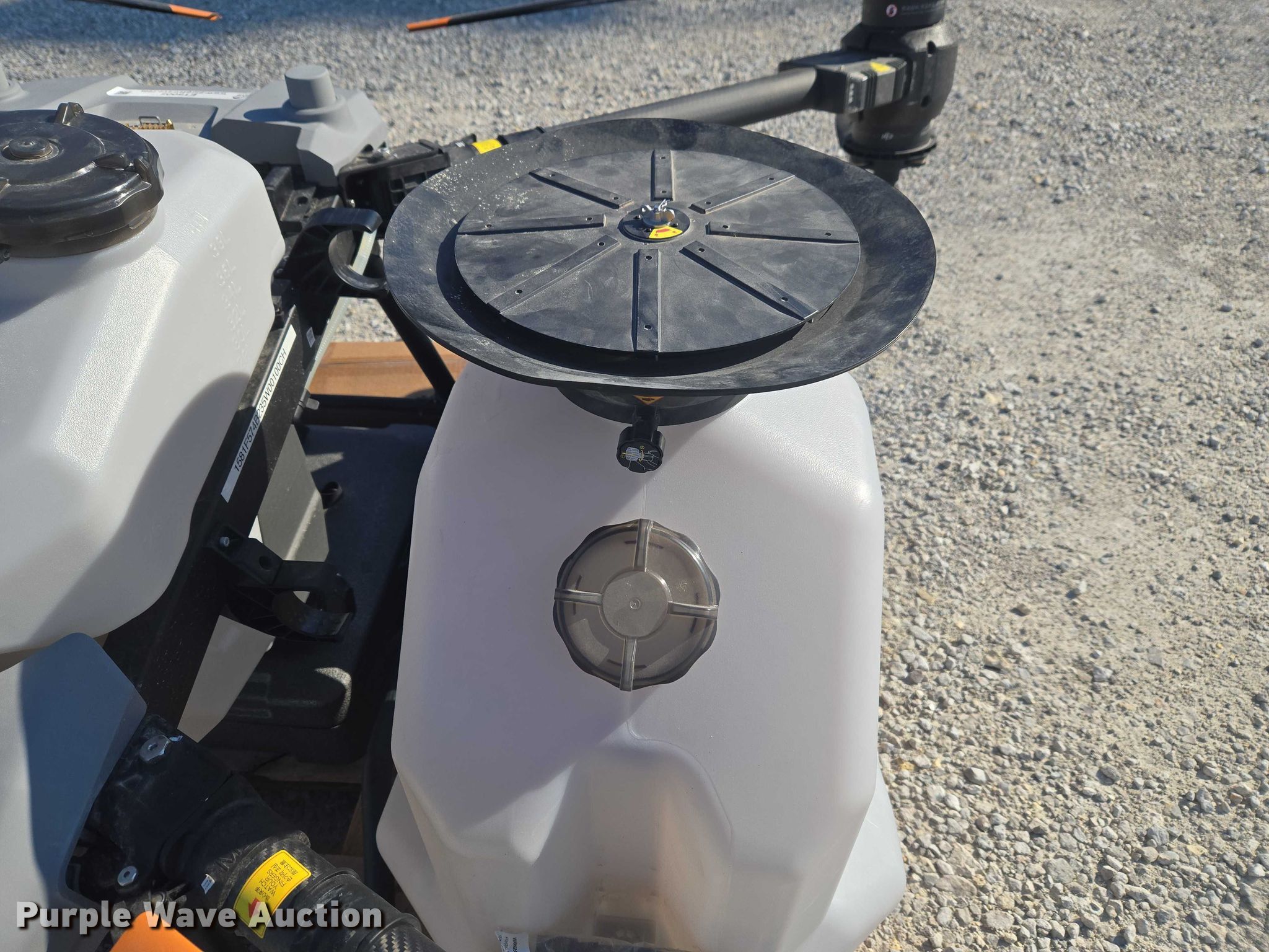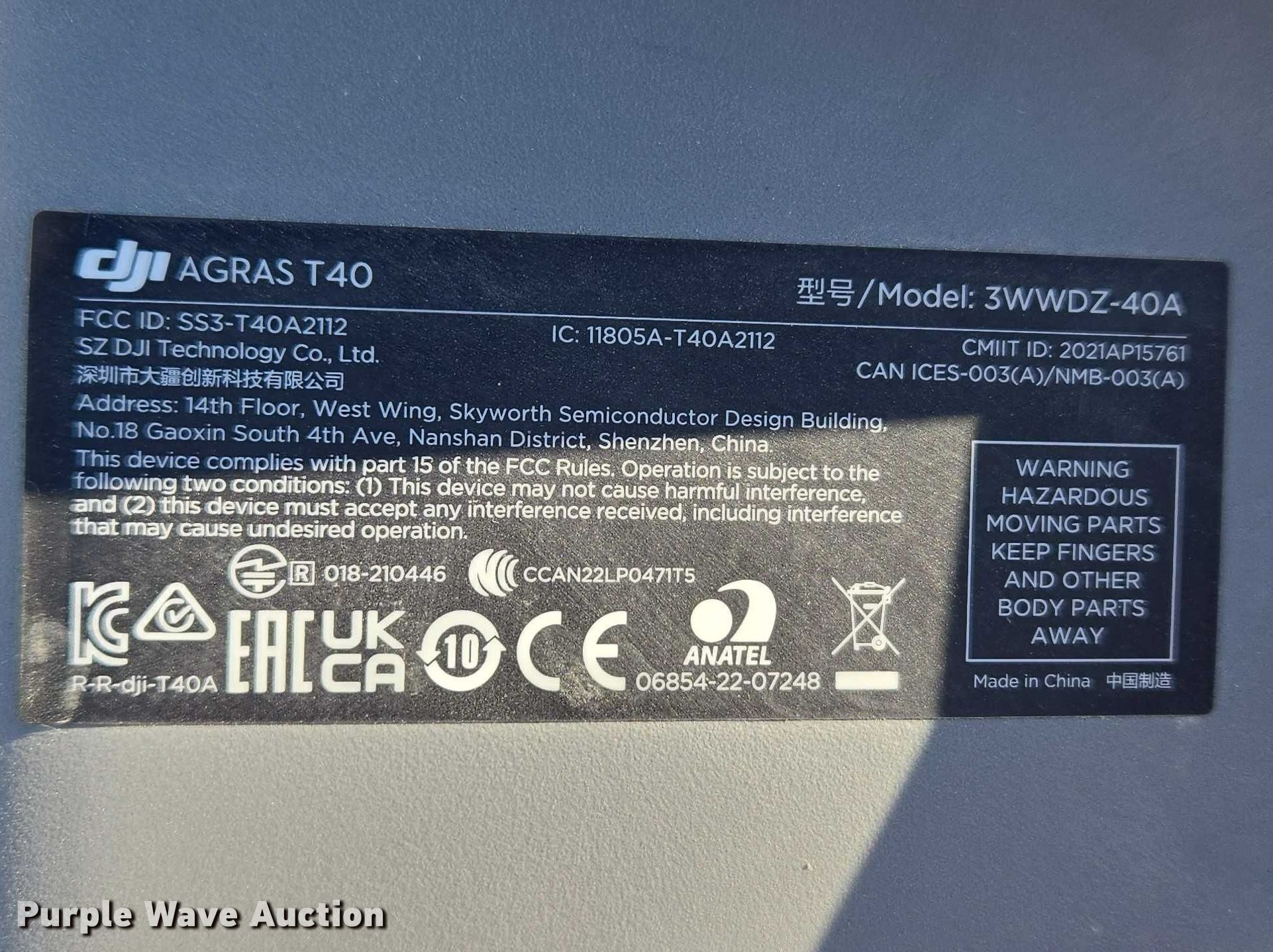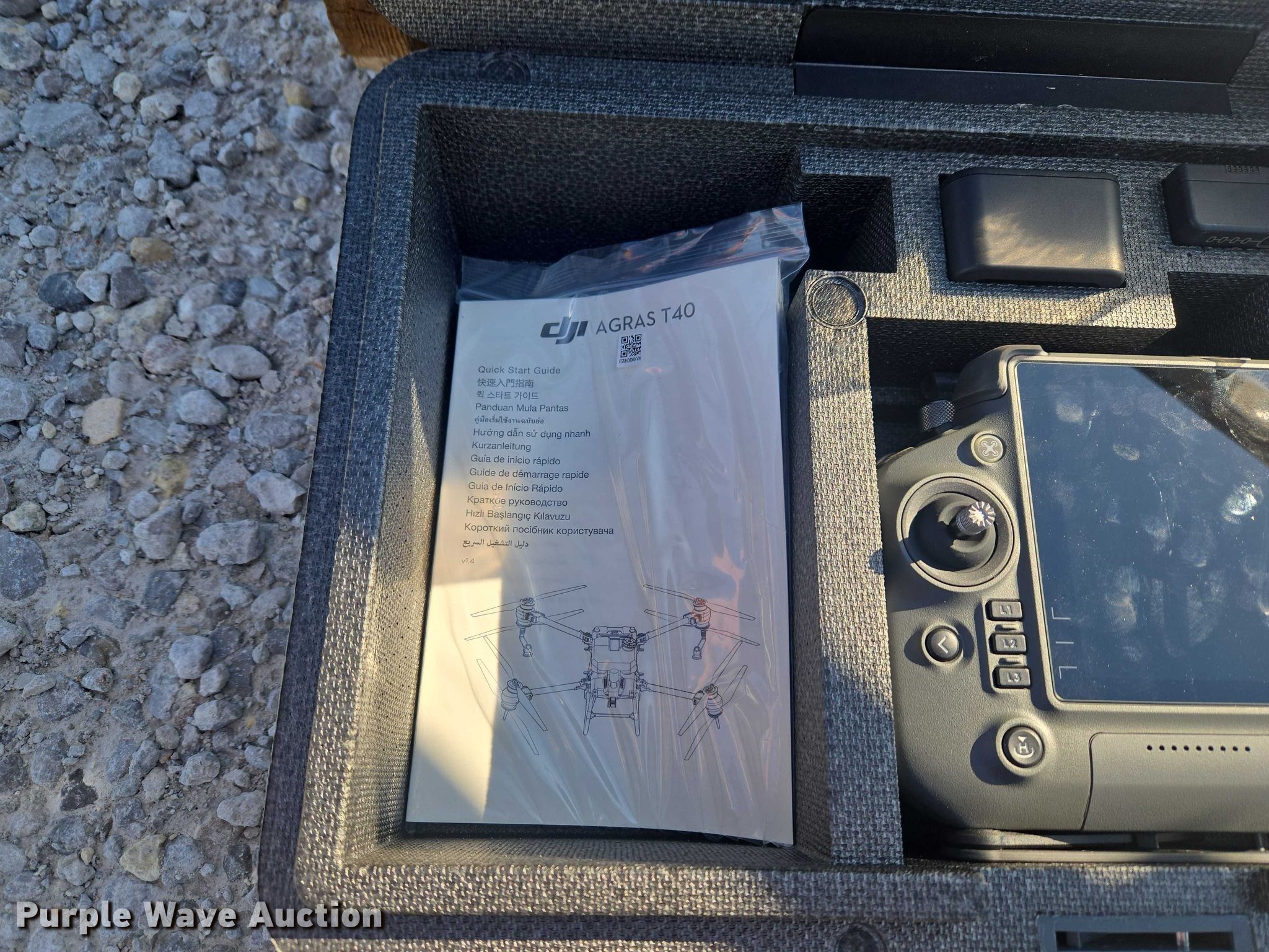 Purple Wave is selling a used Electronics in Indiana. This item is a DJI AGRAS T40 drone with the following: Serial: 64TBL7H00200D0, Parts kit, (2) batteries, Battery station, Liquid tank