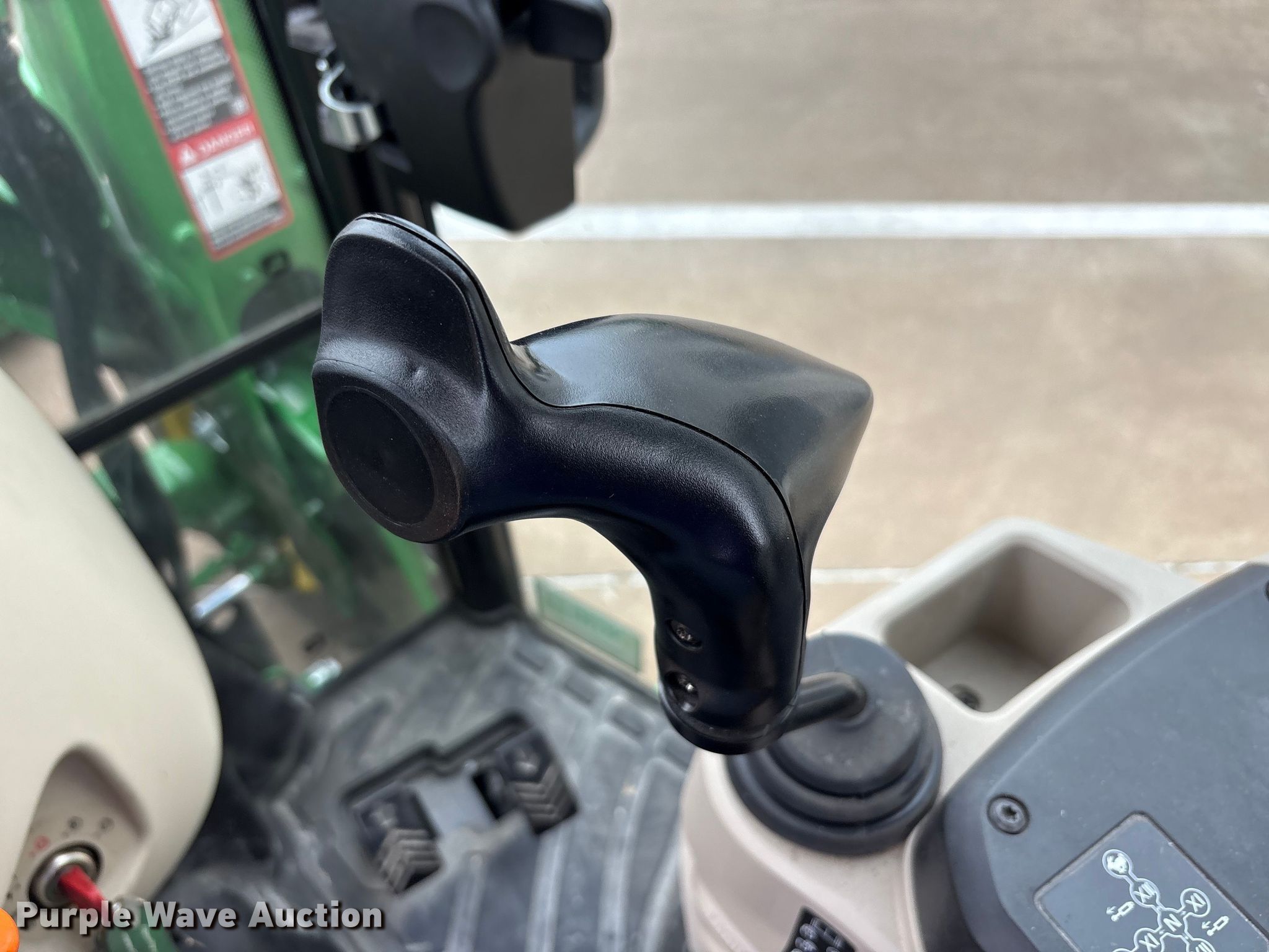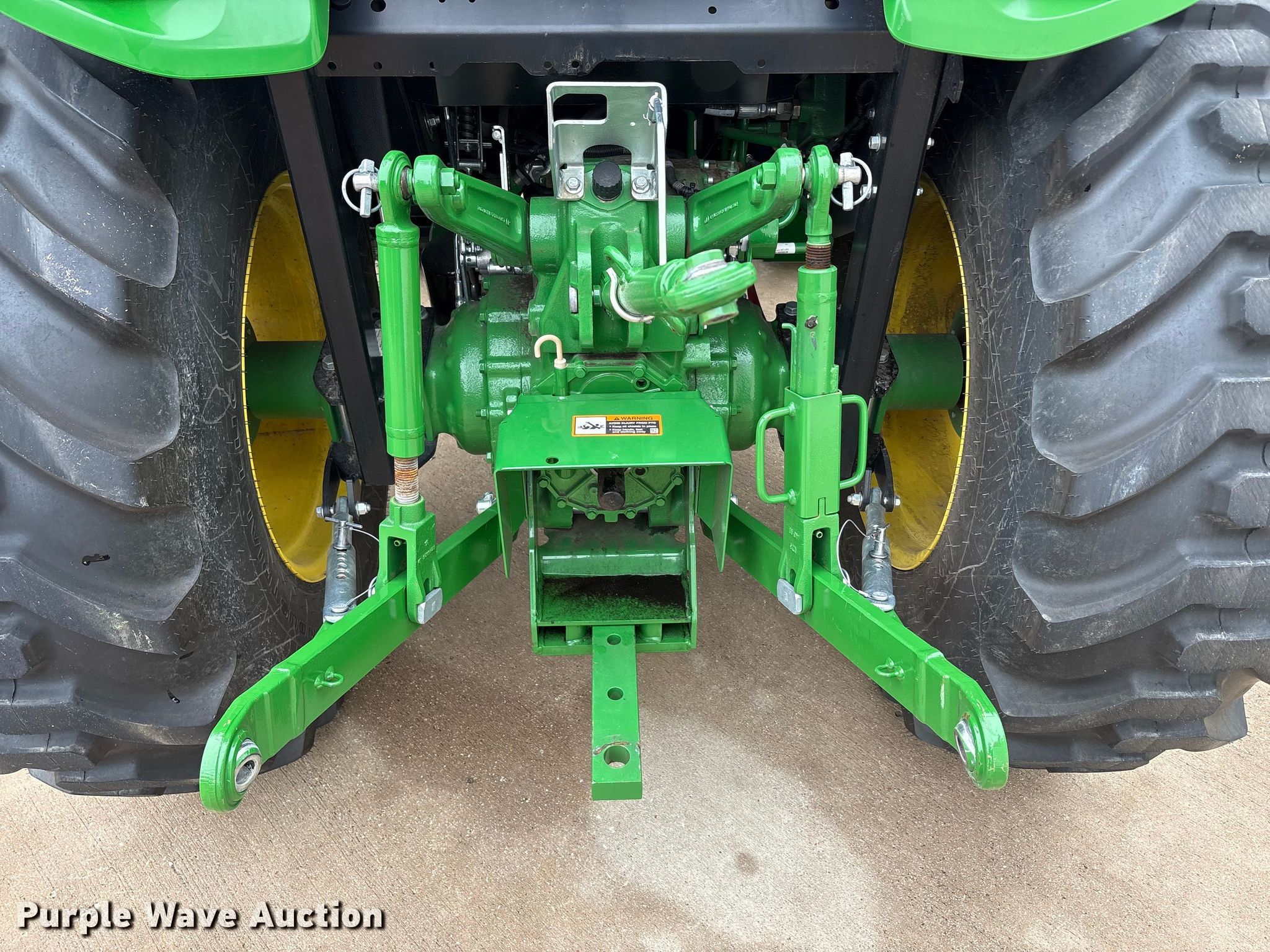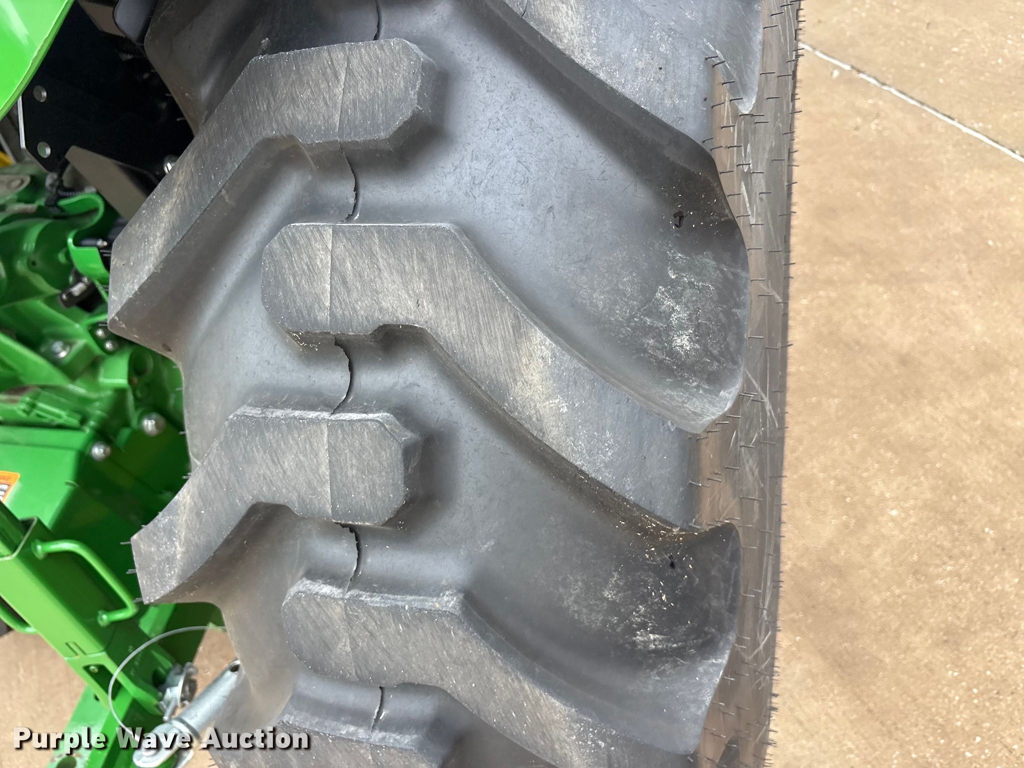 2024 John Deere 4066R tractor. Hours: 44 on meter, Serial: 1LV4066RJRR418572. Engine John Deere, Cylinders: 4. Transmission Hydrostatic, Differential lock. Operators station AC. Features PTO: 540, Three point Top link, Hydraulic remote sets Front: 2, Loader ready, Loader John Deere 440R, Quick attach, Self-leveling, Controls: Joystick, Bucket Width: 75".. Tires Front: 260/70-16.5, Rear: 440/80-24IND. Kubota Tractor Corp. Grapevine, TX 76051