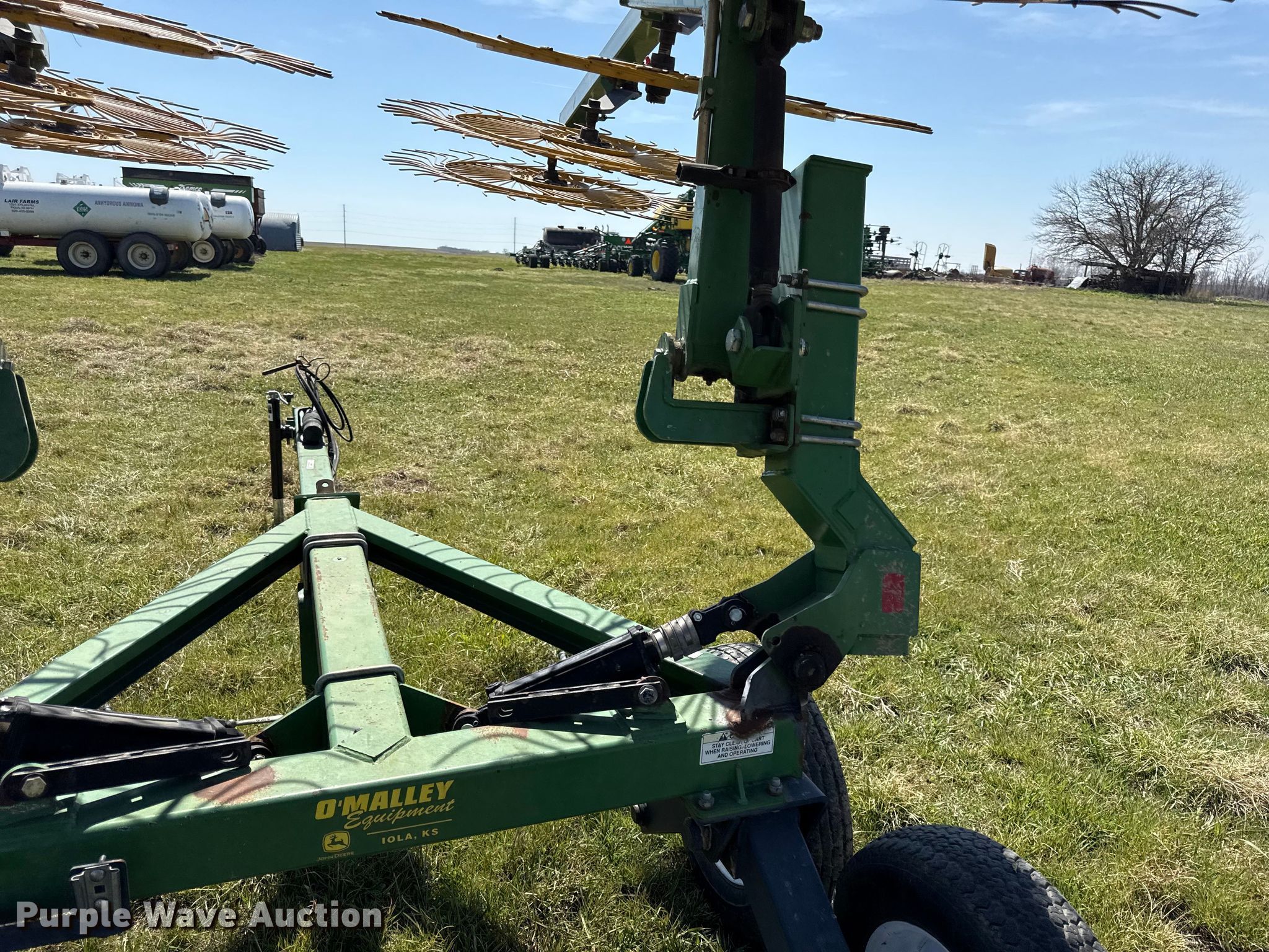 Ogden Hybrid hay rake. Features. Wheels: 12 Diameter: 52", Hydraulic lift, Hydraulic fold, Ground driven. Tires Size: 205/75R15. Lair Farms. Piqua, KS 66761