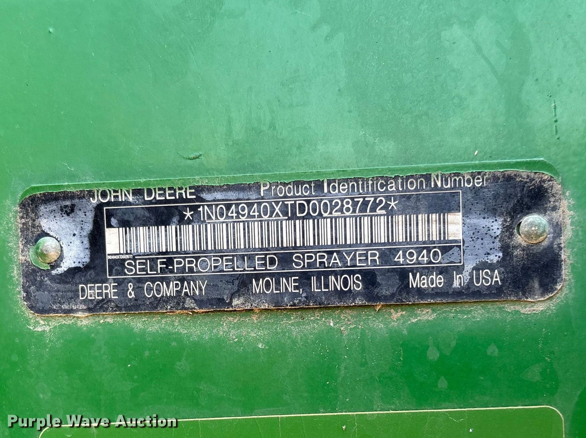 Purple Wave is selling a used Applicator Self Propelled in Missouri. This item is a 2014 John Deere 4940 spreader with the following: Serial: 1N04940XTD0028772