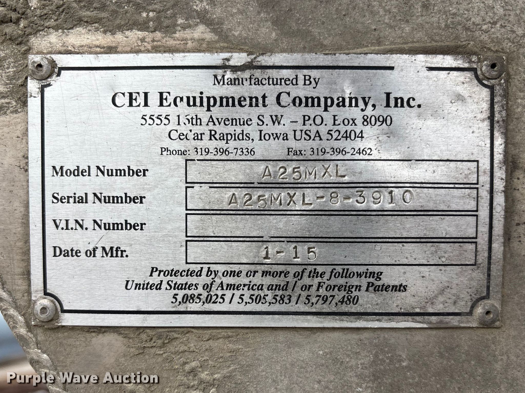 Take a look at this used 2015 CEI Equipment Company A 25MXL Feed delivery bed being sold on April 29th, 2026 in the Wednesday April 29 Ag Equipment Auction made by CEI Equipment Company. Take a look at all of the item information below or take a look at similar auctions for Machine Tools.