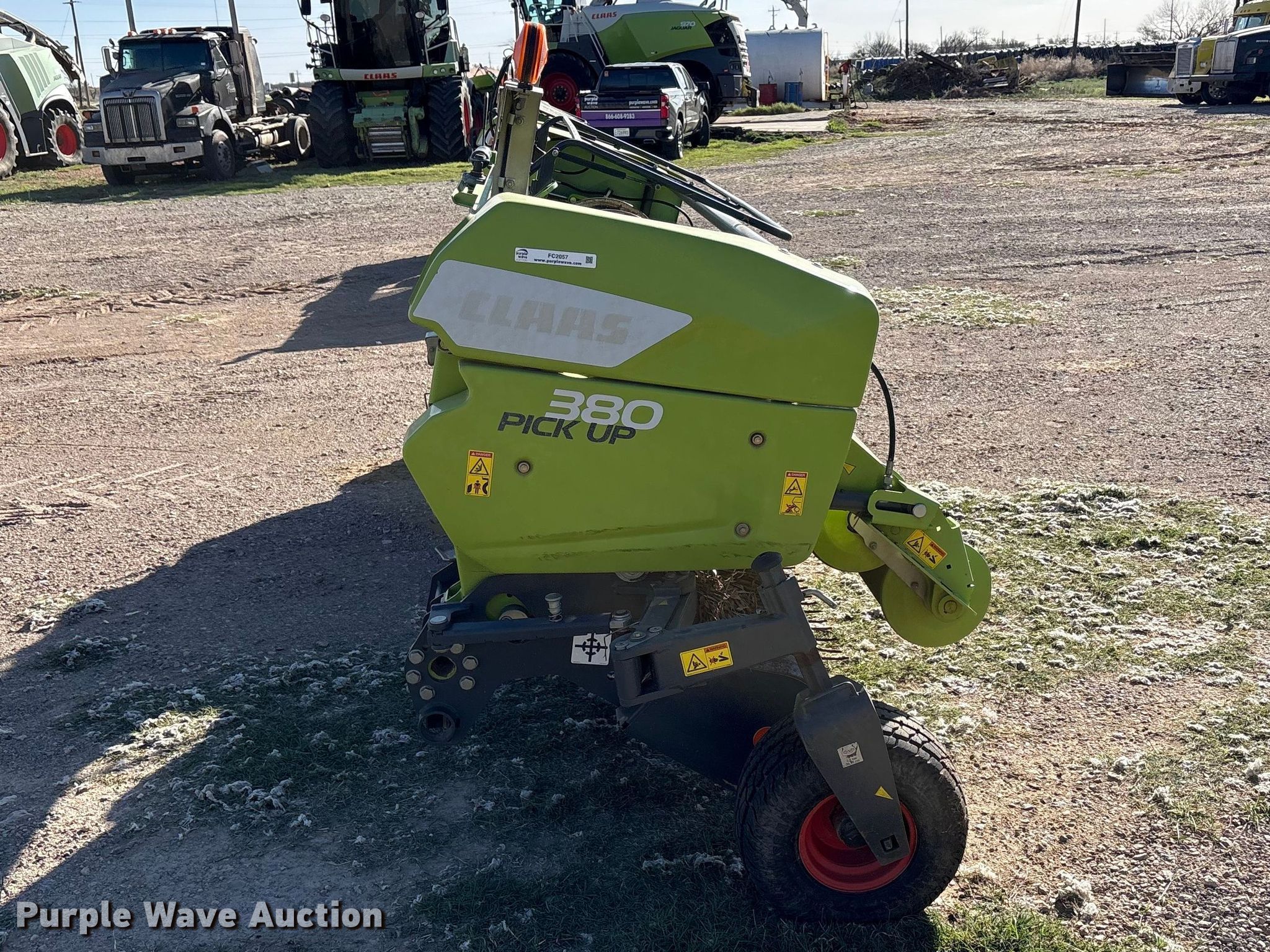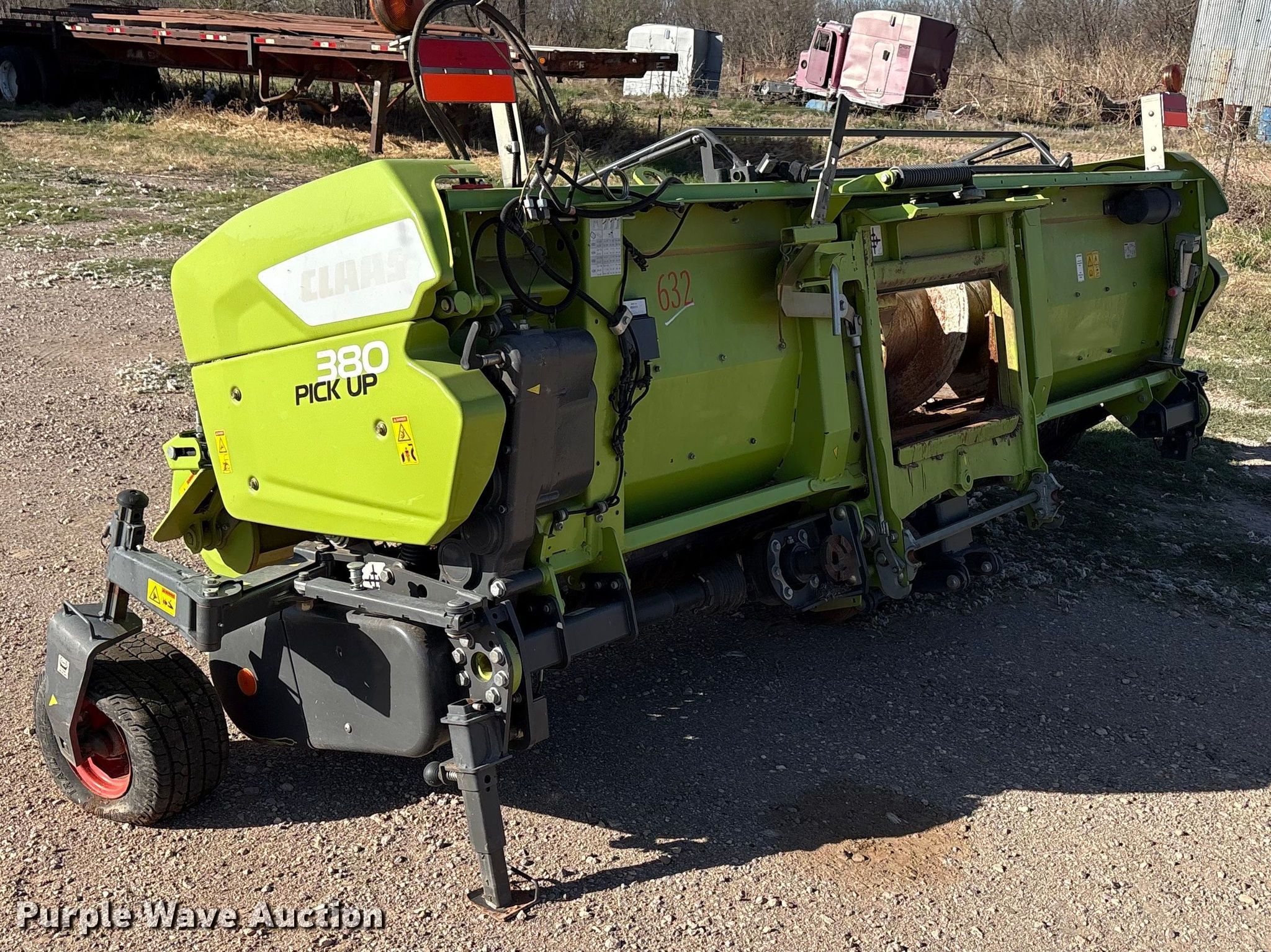 2019 Claas 380 L36 pickup head. Serial: L3602022, Unit #: 632. Features Width: 13', Crop roller, Gauge wheels, Single point coupler, Drivelines: Single. Tires Tire size: 715/60-8. Thompson Field Services. Rotan, TX 79546