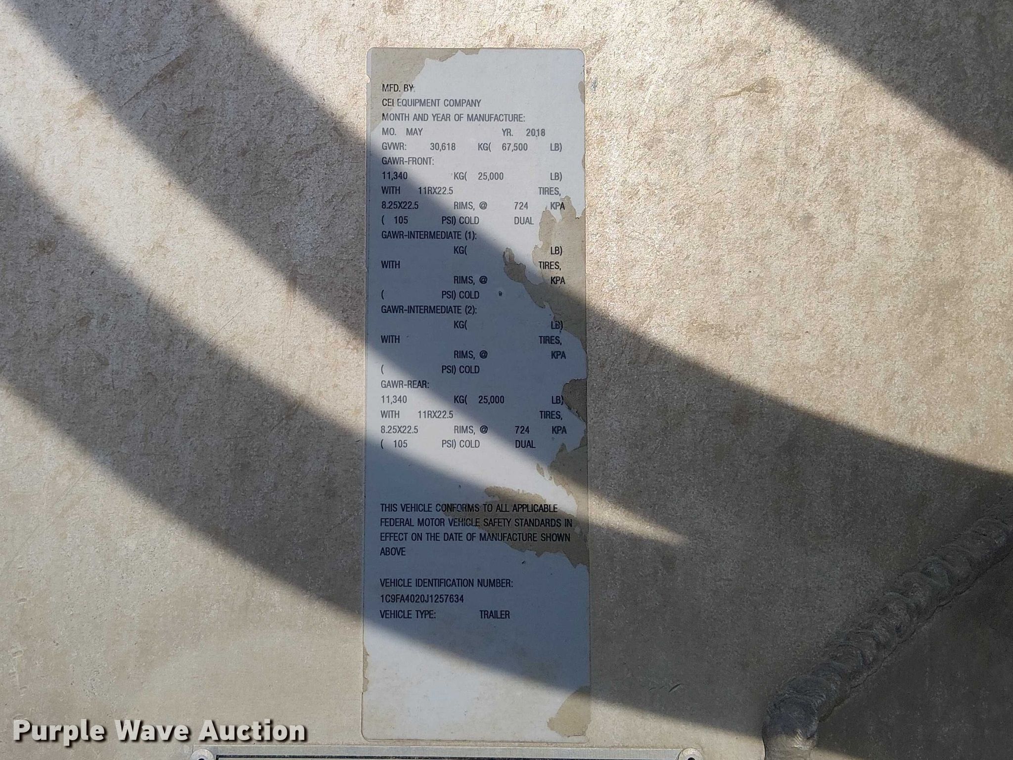 2018 CEI AT35LW feed delivery trailer. VIN: 1C9FA4020J1257634, Unit #: 5598. Dimensions Overall Length: 45', Width: 102". Features Body type: Aluminum, Compartments: 8, Discharge auger Length: 30', Diameter: 12". Chassis Landing gear: Dual, Suspension: Air, Brakes: Air, Axles: Tandem, GVWR: 67,500 lbs, GAWR: 25,000 lbs. Tires Aluminum wheels, Size: 11R22.5. Notes Conrol box hydraulic leak. Missouri title. Title distribution may be delayed up to 14 days from verification of funds. Smithfield. Princeton, MO 64673