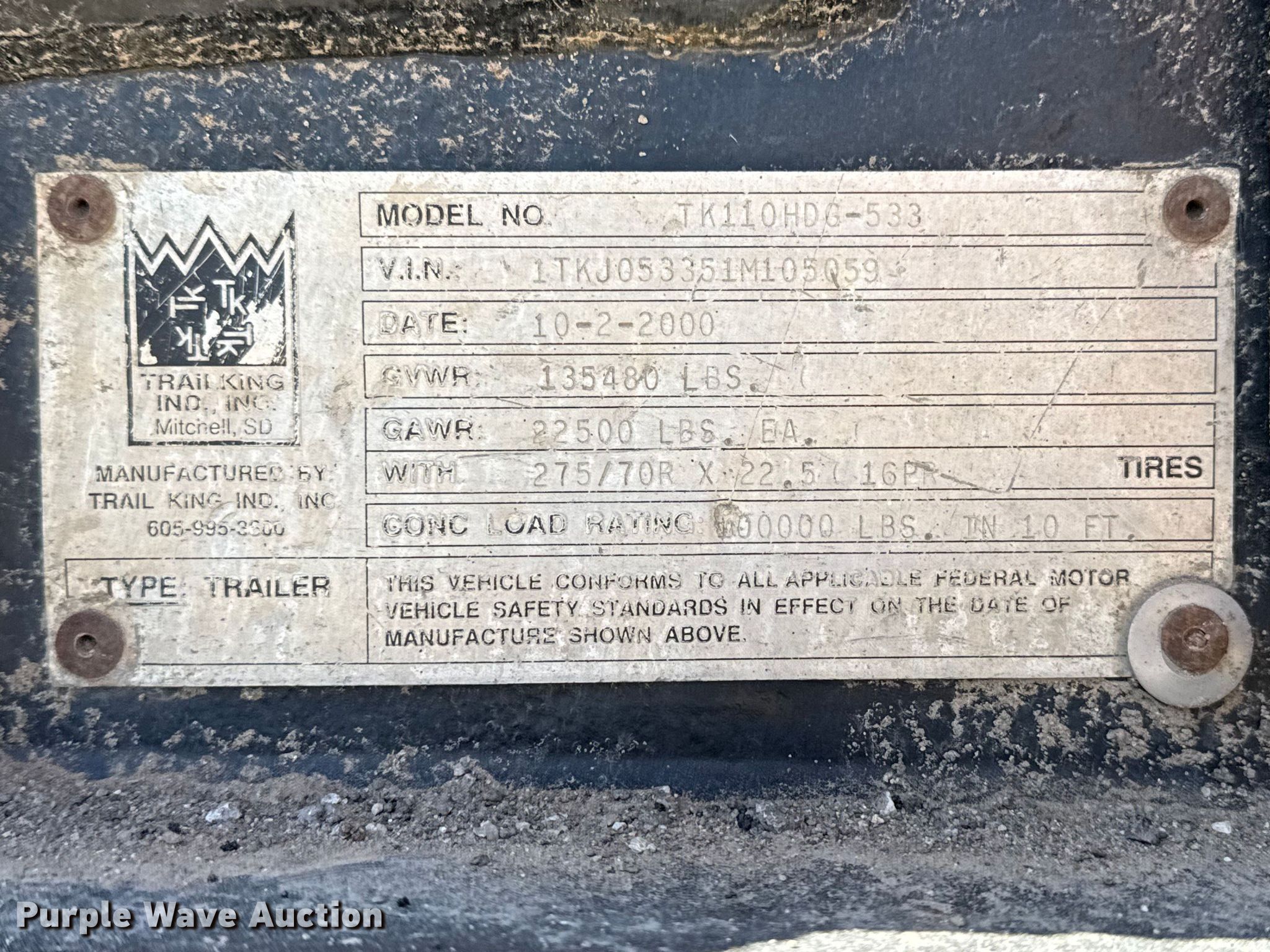 Purple Wave is selling a used Equip. Trailer in Oklahoma. This item is a 2001 Trail King TK110HDG-533 lowboy equipment trailer with the following: VIN: 1TKJ053551M105059, Unit #: 04-026