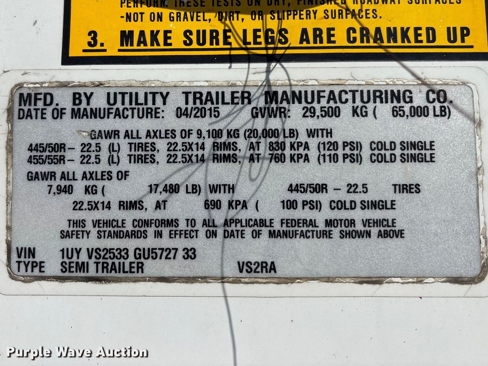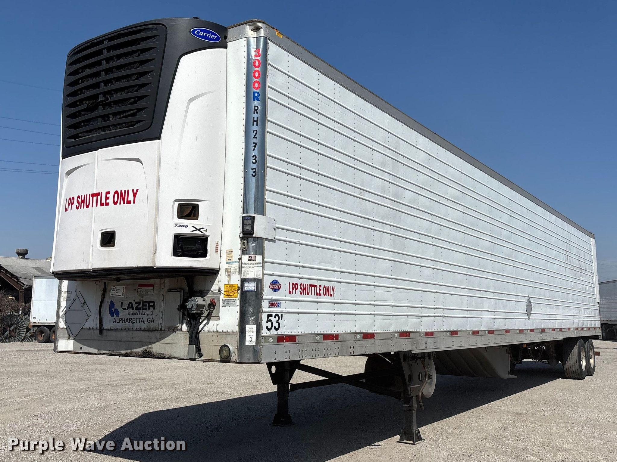 2016 Utility VS2RA refrigerated van trailer. VIN: 1UYVS2533GU572733. Dimensions Overall Length: 53', Width: 102". Features Deck type: Aluminum, Refrigeration unit Carrier 7300 X4, Generator Fuel type: Diesel. Chassis Landing gear: Dual, Suspension: Air, Brakes: Air, Axles: Tandem Sliding, GVWR: 65,000 lbs, GAWR: 20,000 lbs. Tires Aluminum wheels, Size: 445/50R22.5. Notes Unknown operating condition of refrigeration unit. Georgia title. Title distribution may be delayed up to 30 days from verification of funds. Lazer Logistics. 3414 Gardner Avenue. Kansas City, MO 64120