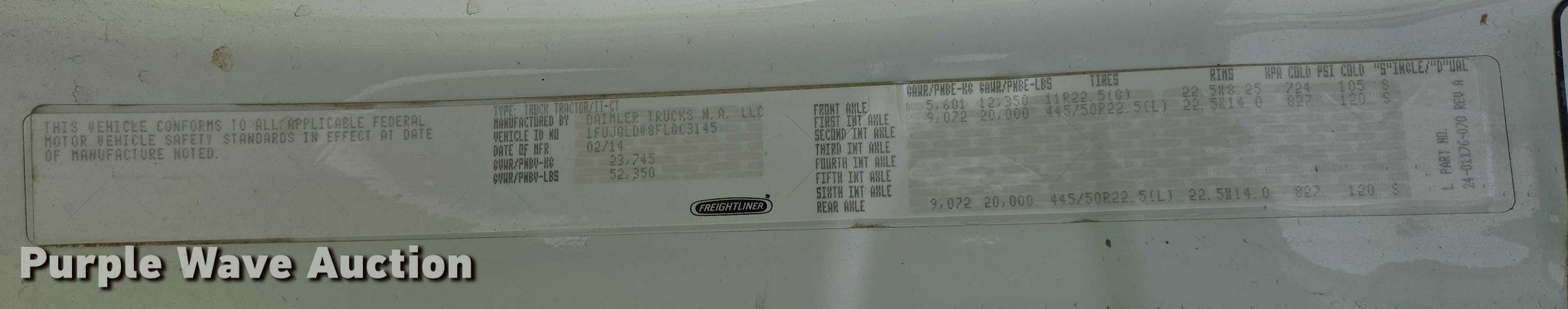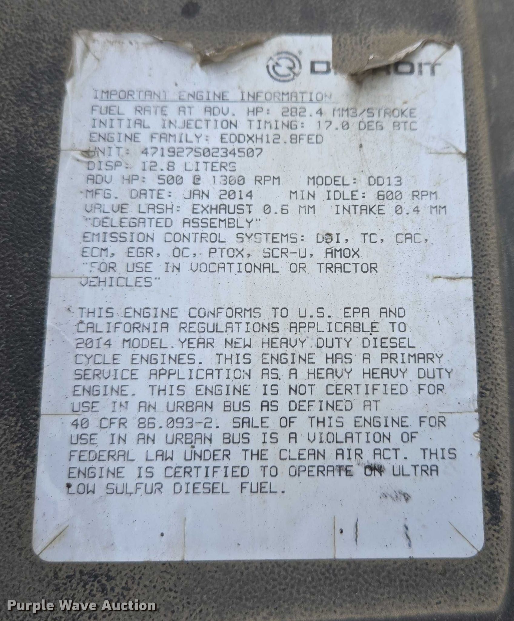 2015 Freightliner Cascadia semi truck. Miles: 818,687 on odometer, VIN: 1FUJGLDV8FLGC3145, Unit #: 153201. Engine Detroit Diesel DD13, Displacement: 12.8L, Cylinders: 6, Fuel type: Diesel, Engine brake. Transmission Eaton Fuller, Manual, Speed: 10. Chassis Axles: Tandem, Differential lock: Inter-axle, Suspension: Air Dump valves, Brakes: Air, PTO, Wet kit. Interior AC, Heat, Heated mirrors, Power windows, Cruise control, Air ride cab, Sleeper Sleeper length: 58", Beds: Single, Rear climate control. Features Deck plate: Aluminum, Fifth wheel type: Air operated, Sliding, Fuel tank: Single. Tires Front: 11R22.5, Rear: 445/50R22.5. Notes DEF issues, Possible ACM issues, Dash warning indicator: Check engine, Windshield chipped or cracked, Jump start required during on-site data collection. Minnesota title. Title distribution may be delayed up to 30 days from verification of funds. CHS, Inc.. Montevideo, MN 56265