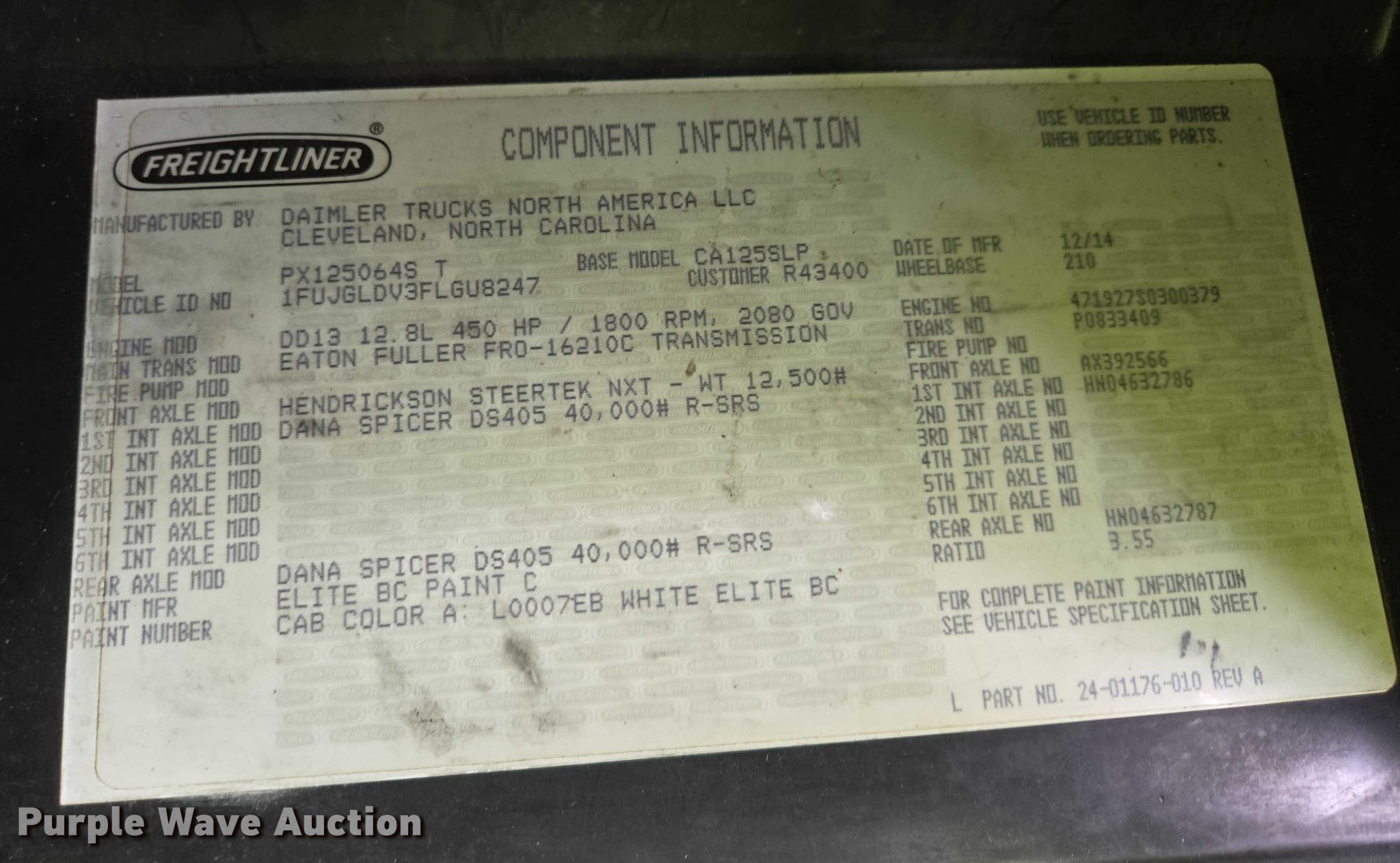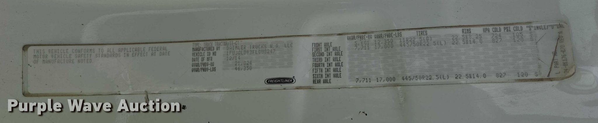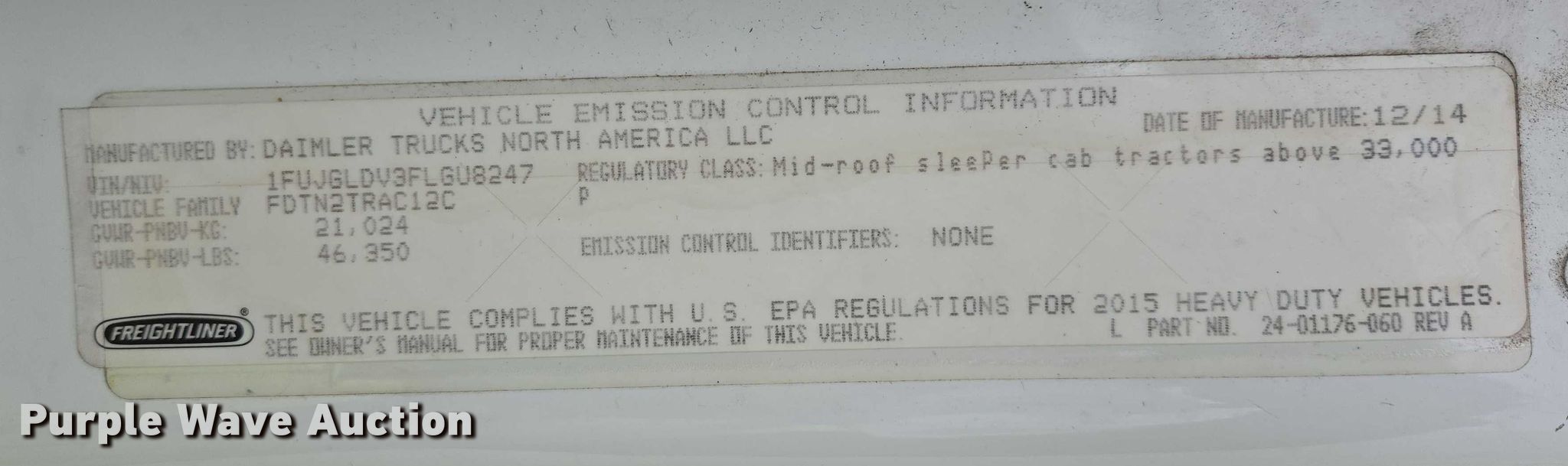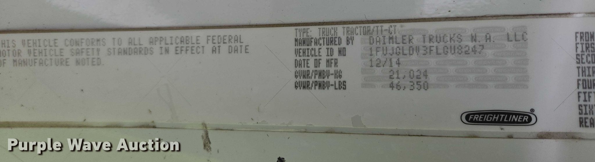 2015 Freightliner Cascadia semi truck. Miles: 587,720 on odometer, VIN: 1FUJGLDV3FLGU8247, Unit #: 153260. Engine Detroit Diesel DD13, Displacement: 12.8L, Cylinders: 6, Fuel type: Diesel, Engine brake. Transmission Eaton Fuller, Manual, Speed: 10. Chassis Axles: Tandem, Gear ratio: 3.55, Differential lock: Inter-axle, Suspension: Air Dump valves, Brakes: Air, PTO, Wet kit, GVWR: 46,350 lbs FAWR: 12,350 lbs, IAWR: 17,000 lbs, RAWR: 17,000 lbs, Wheelbase: 210". Interior AC, Heat, Heated mirrors, Power windows, Cruise control, Air ride cab, Sleeper Sleeper length: 58", Beds: Single, Rear climate control. Features Deck plate: Aluminum, Fifth wheel type: Air operated, Sliding, Fuel tank: Single. Tires Front: 11R22.5, Rear: 445/50R22.5. Notes Dash warning indicator: Check engine, Stop engine, Unknown operating condition , Possible engine issues, intermittently dies Unit must be towed or hauled, Possible emission issues. Minnesota title. Title distribution may be delayed up to 30 days from verification of funds. CHS, Inc.. Montevideo, MN 56265