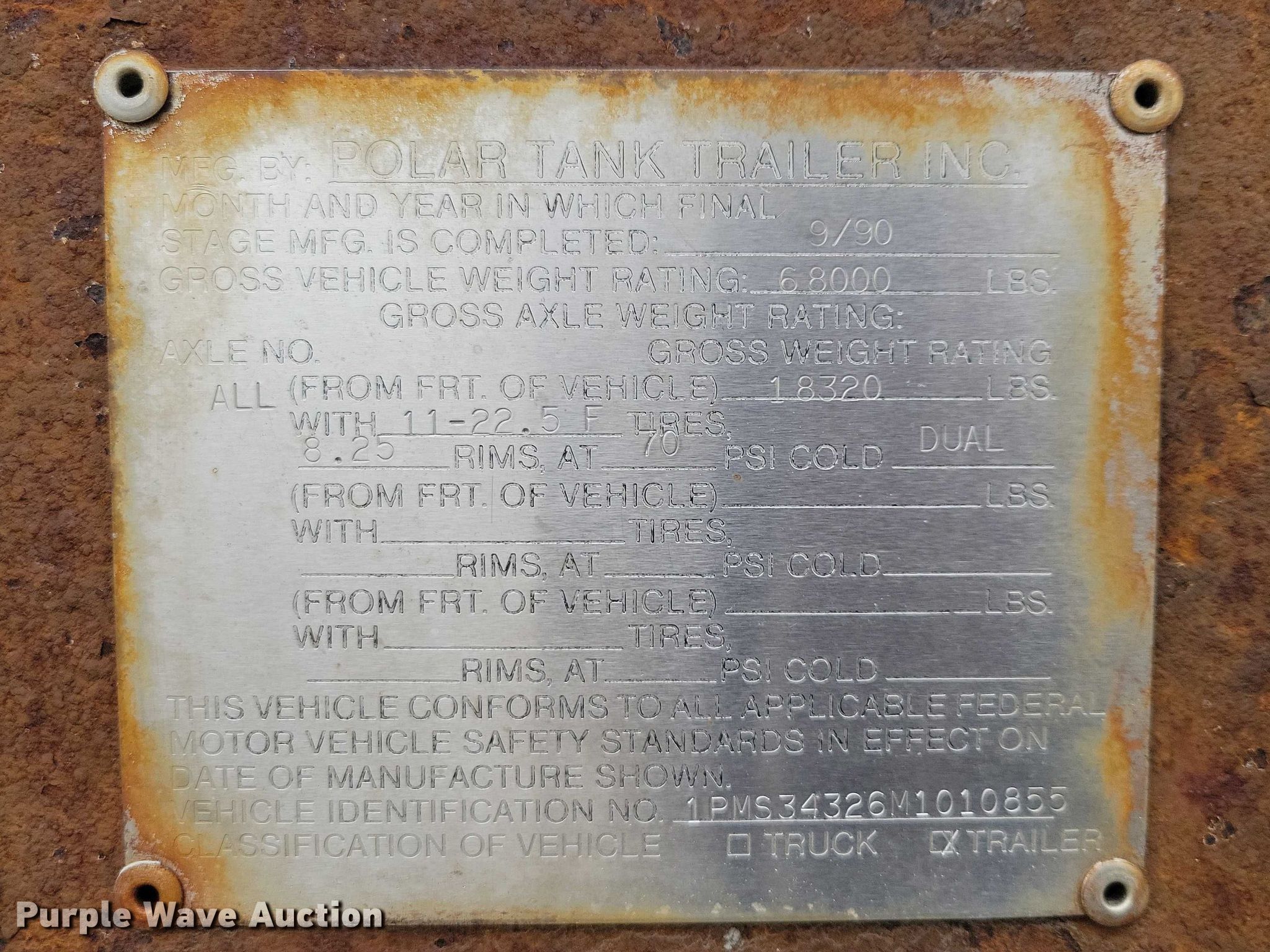 Purple Wave is selling a used Tank Trailer in Iowa. This item is a 1991 Polar tank trailer with the following: VIN: 1PMS34326M1010855, Unit #: 905407