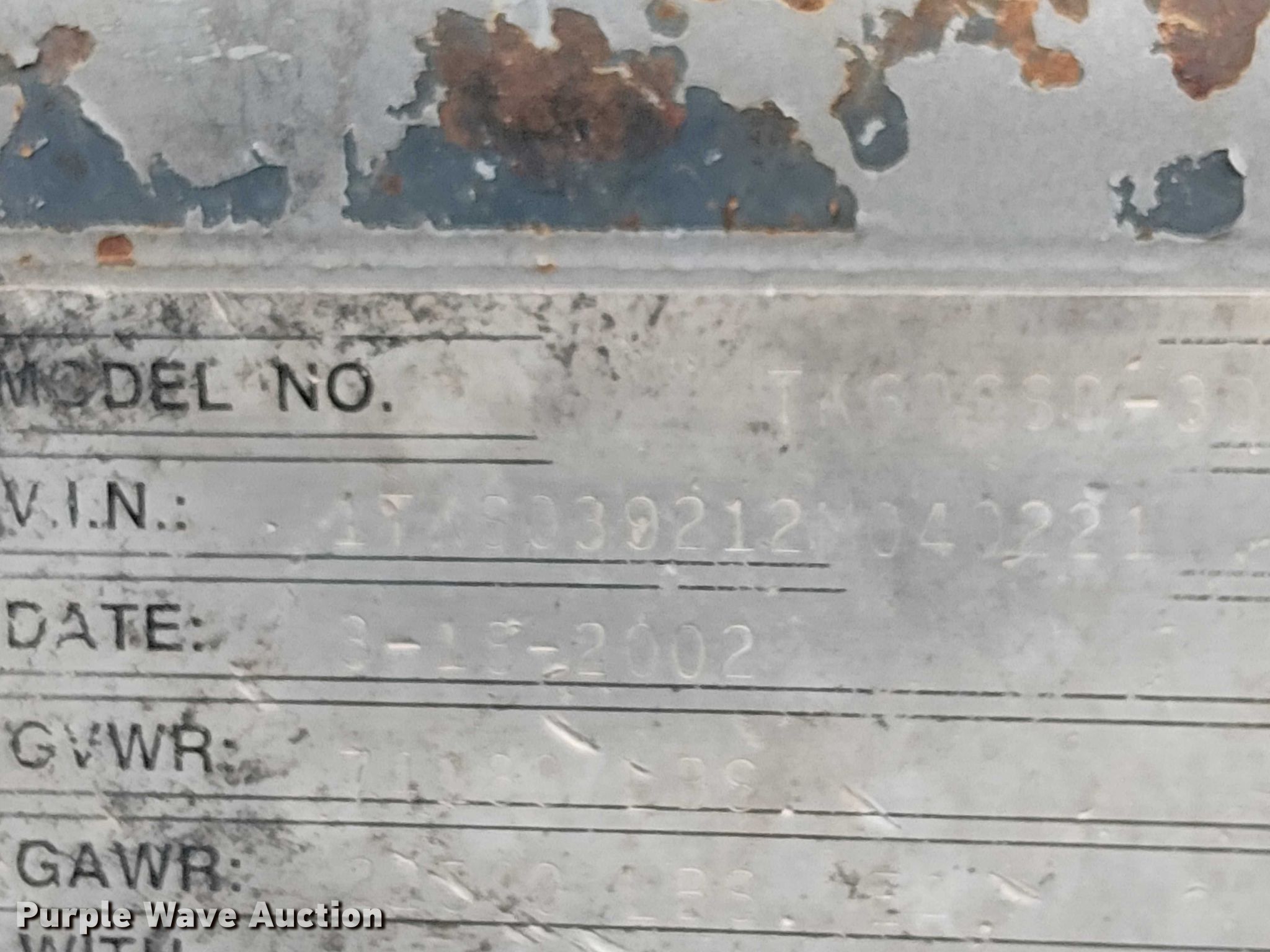 2002 Trail King Industries side dump trailer. VIN: 1TKS039212M040221. Dimensions Overall Length: 42', Width: 102", Body Length: 34', Width: 102". Features Body type: Steel, Ram: Dual, Rear push block, Roll tarp. Chassis Landing gear: Dual, Suspension: Spring, Brakes: Air, Axles: Tandem, GVWR: 74,180 lbs, GAWR: 22,500 lbs. Tires Aluminum wheels, Size: 11R22.5. Notes Non-operational roll tarp, will be repaired prior to auction, Leaf spring weld repairs, Collision damage. Arizona title. Title distribution may be delayed up to 30 days from verification of funds. A3R Trucking LLC. Phoenix, AZ 85003