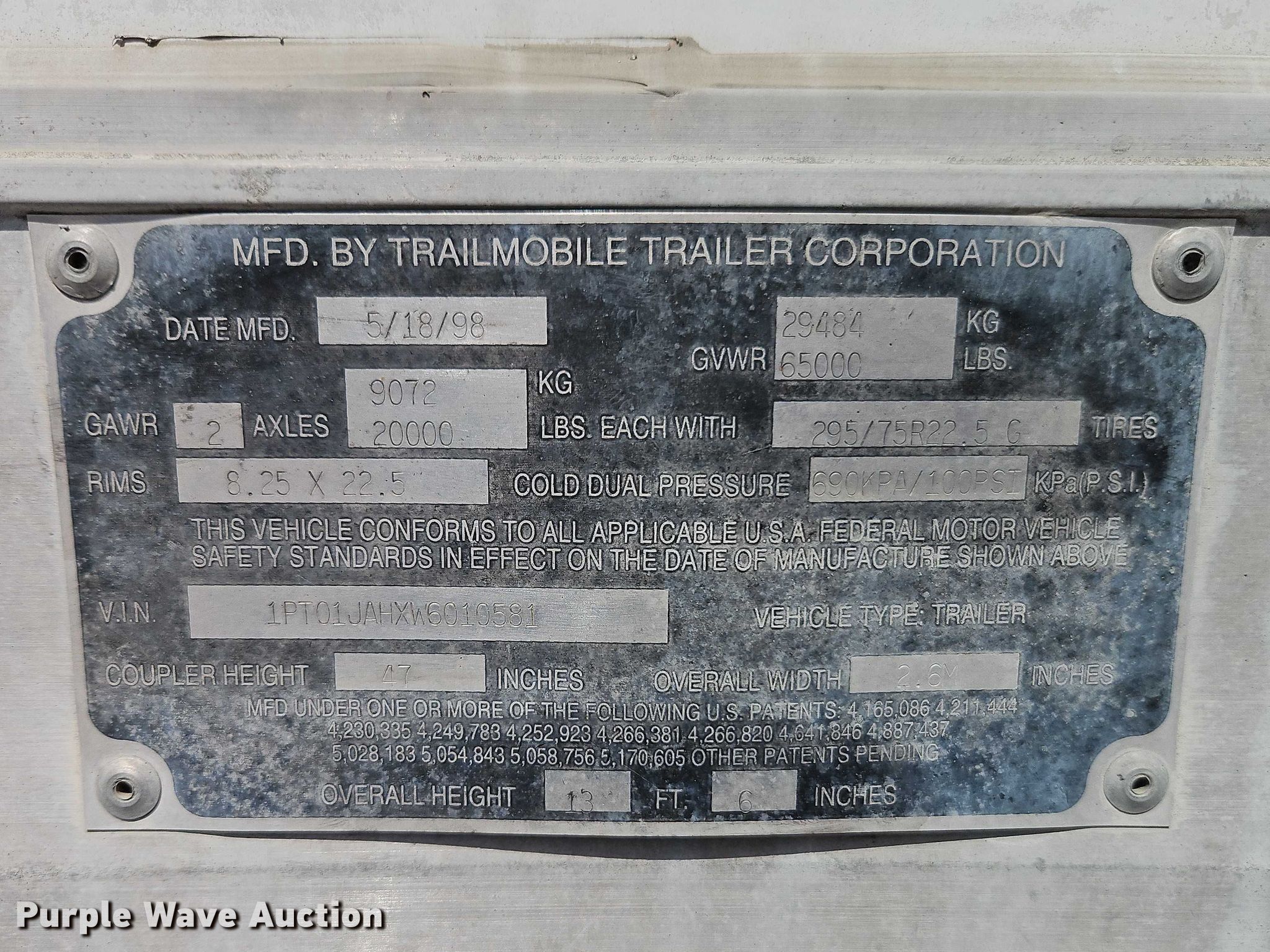 1998 Trailmobile dry van trailer. VIN: 1PT01JAHXW6010581. Dimensions Overall Length: 48', Width: 102", Body Length: 48', Width: 102". Features Deck type: Wood, E-track rail system. Chassis Landing gear: Dual, Suspension: Spring, Brakes: Air, Axles: Tandem Sliding, GVWR: 65,000 lbs, GAWR: 20,000 lbs. Tires Steel wheels, Size: 295/75R22.5. Notes Truck tractor not included, Rear doors missing. Missouri title. Title distribution may be delayed up to 14 days from verification of funds. McConnell & Associates Corp.. North Kansas City, MO 64116