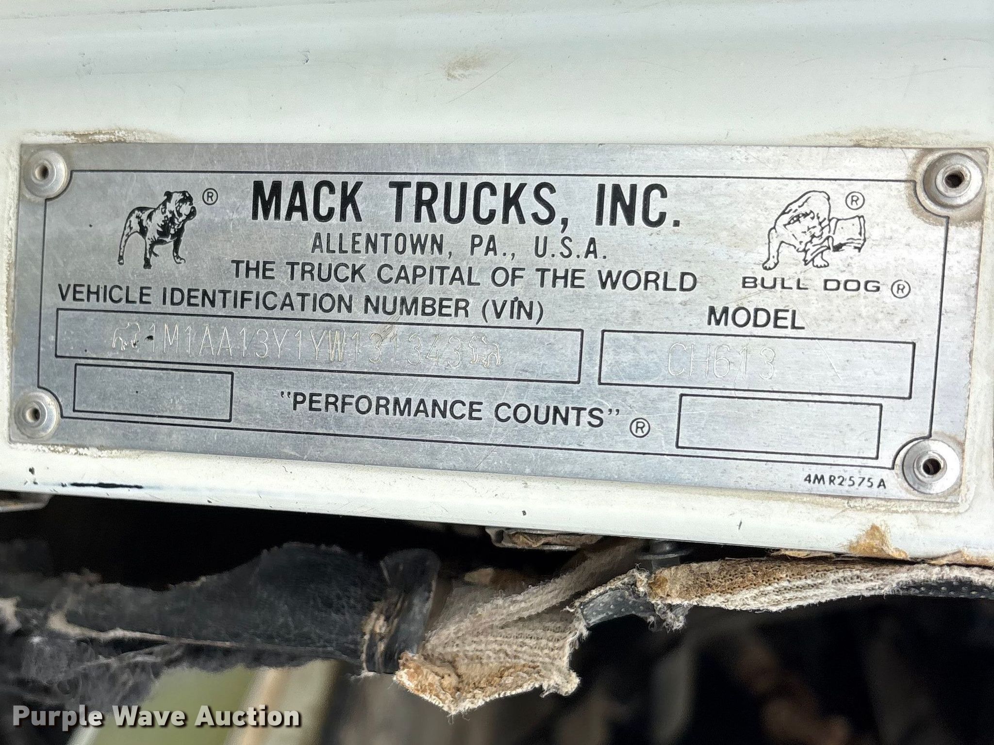 Purple Wave is selling a used Truck Chassis in Texas. This item is a 2000 Mack CH613 truck cab and chassis with the following: Miles: Unknown, Hours: 285,142 on meter, VIN: 1M1AA13Y1YW131343, Unit #: 2304