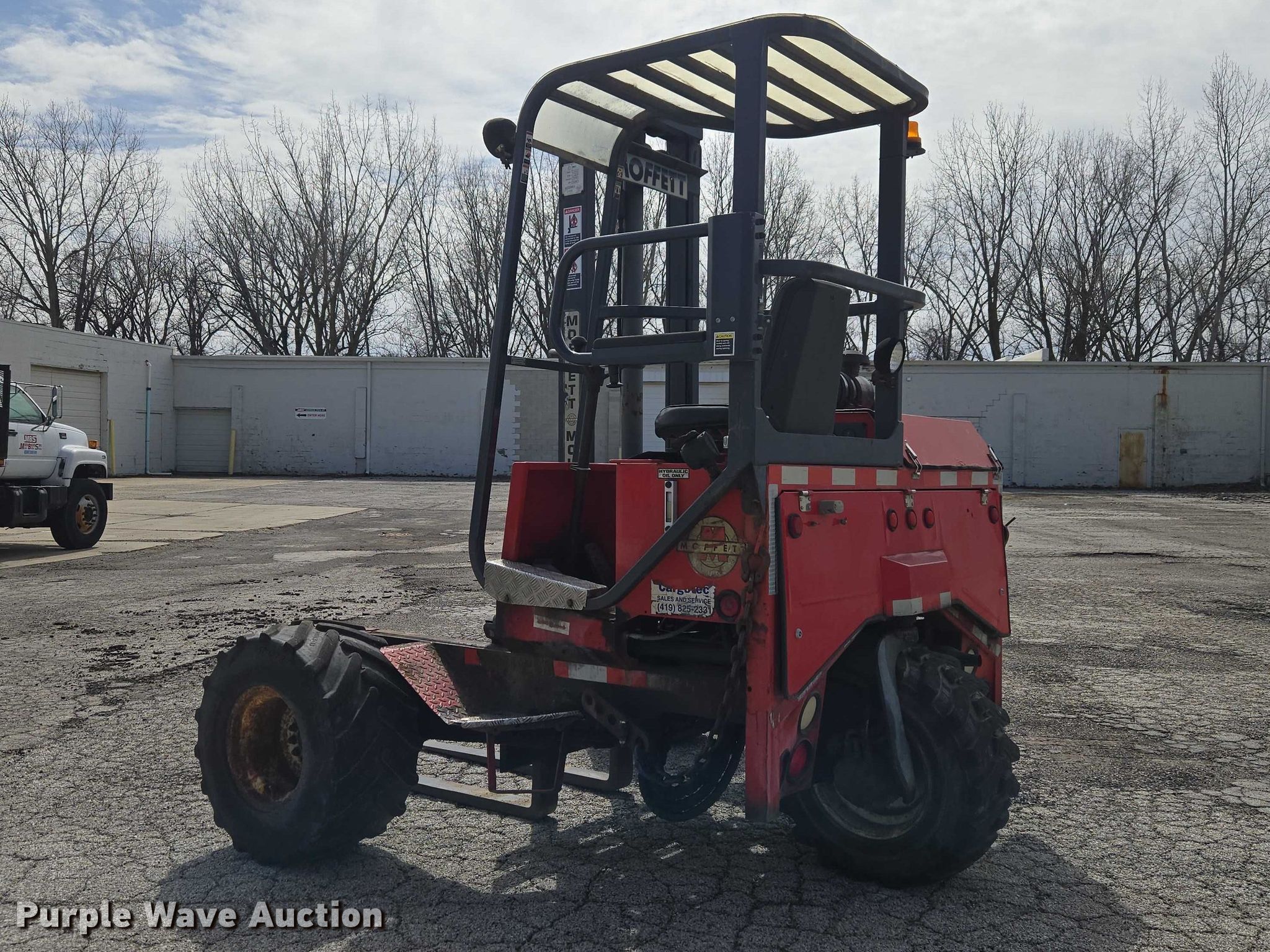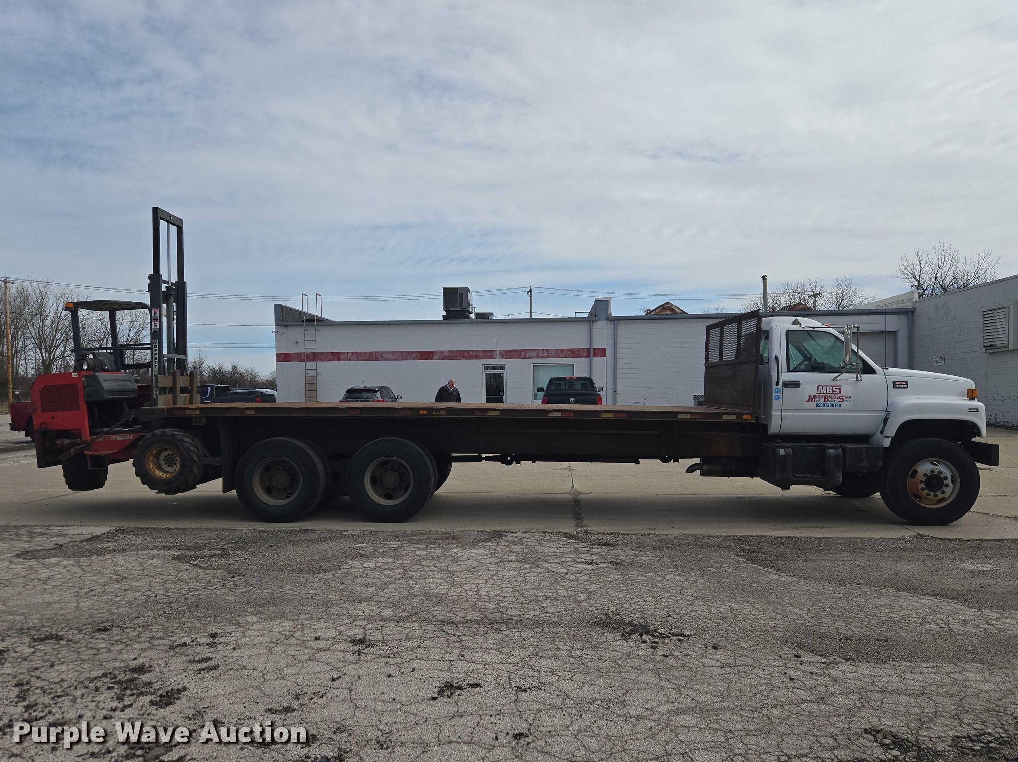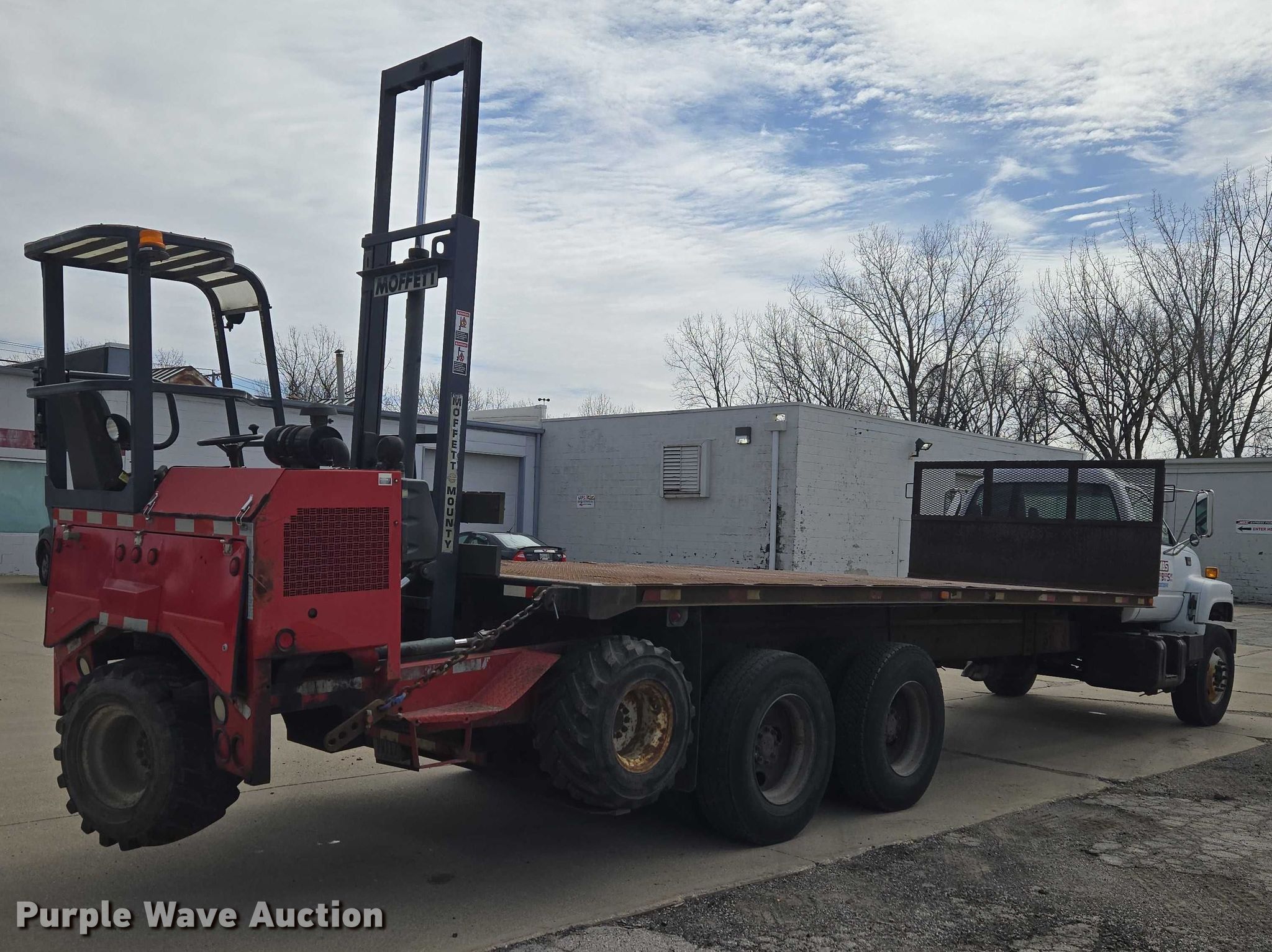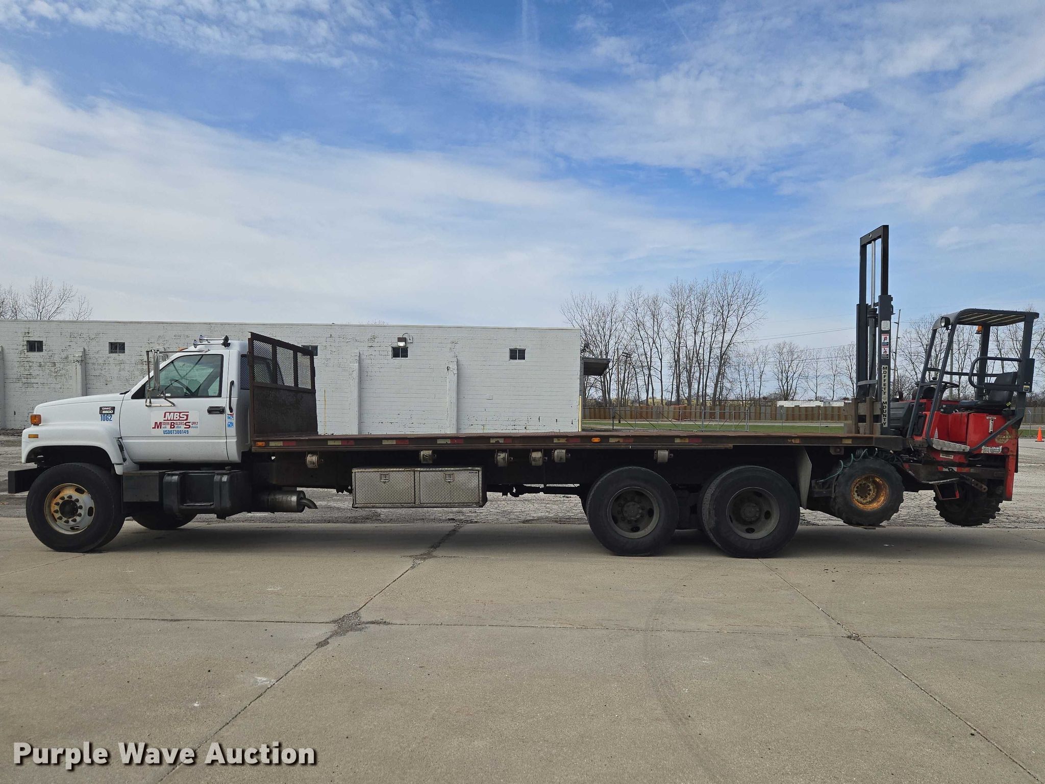 2000 GMC C8500 flatbed truck. Miles: 228,838 on odometer, VIN: 1GDT7H4C6YJ517915. Engine Caterpillar 3126, Cylinders: 6, Fuel type: Diesel. Transmission Eaton Fuller, Manual, Speed: 10. Chassis Axles: Tandem, Differential lock: Inter-axle, Suspension: Spring over walking beam, Brakes: Air, GVWR: 53,220 lbs. Interior AC, Heat. Features Bed Flatbed, Length: 24' 5", Width: 8' Forklift mount.. Tires Front: 315/80R22.5, Rear: 11R22.5. 2000 Moffeett M5000 forklift Hours: 1,777 on meter, Serial: 250076. Engine Kubota, Displacement: 2.2L, Cylinders: 5, Fuel type: Diesel, kW: 36.6. Transmission Hydrostatic. Chassis Differential lock. Operators station OROPS. Features Maximum lift capacity: 5,000 lbs, Mast stages: 1, Side shift, Mast tilt, Fork length: 45". Tires Size: 31x15.5-15. Notes Hydraulic issues. Ohio title. Title distribution may be delayed up to 30 days from verification of funds. Modern Builders Supply. Toledo, OH 43612