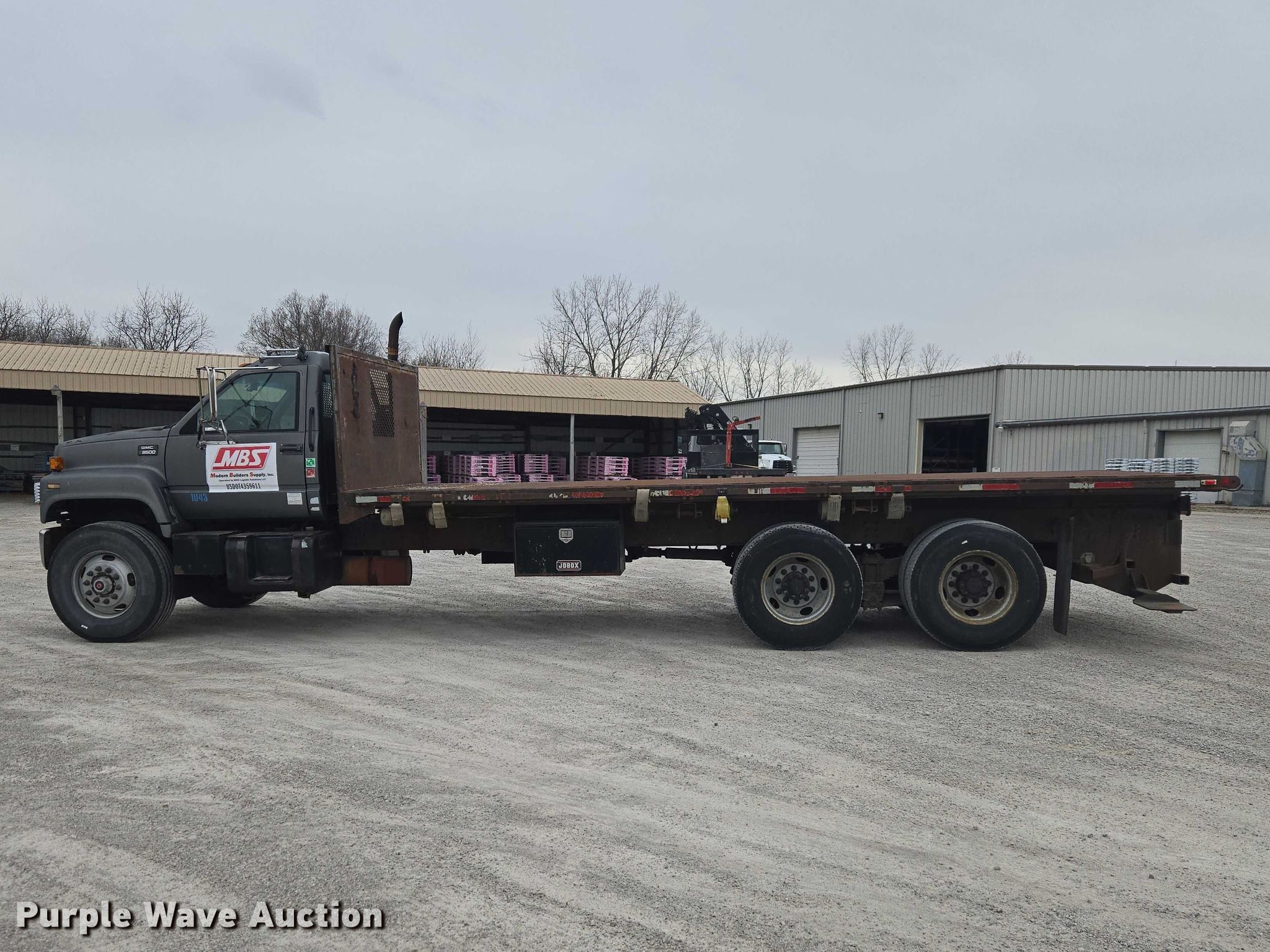 2000 GMC C8500 flatbed truck. Miles: 268,028 on odometer, VIN: 1GDT7H4C8YJ506348. Engine Caterpillar 3126, Cylinders: 6, Fuel type: Diesel. Transmission Eaton Fuller, Manual, Speed: 8. Chassis Axles: Tandem, Differential lock: Inter-axle, Suspension: Spring over walking beam, Brakes: Air, GVWR: 54,600 lbs. Interior AC, Heat, Heated mirrors, Brake controller. Features Bed Flatbed, Length: 23' 2", Width: 8' Forklift mount.. Tires Front: 315/80R22.5, Rear: 11R22.5. Notes Dash cam will be removed prior to auction, Door latch issues, Windshield chipped or cracked. Ohio title. Title distribution may be delayed up to 30 days from verification of funds. Modern Builders Supply. Fort Wayne, IN 46808