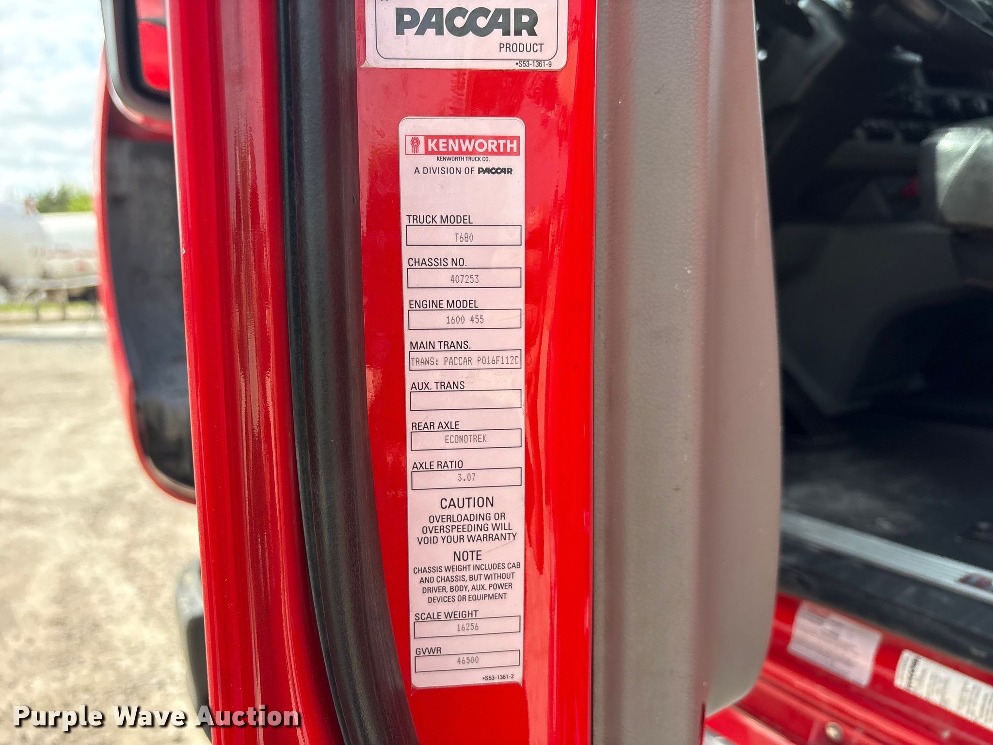 2020 Kenworth T680 semi truck. Miles: 680,239 on odometer, VIN: 1XKYAP8X6LJ407253, Unit #: T93. Engine Paccar MX-13, Displacement: 12.9L, Cylinders: 6, Fuel type: Diesel, HP: 405, Engine brake. Transmission Automated manual. Chassis Axles: Tandem, Single axle differential lock, Suspension: Air Dump valves, Brakes: Air, PTO, GVWR: 46,500 lbs FAWR: 12,500 lbs, IAWR: 17,000 lbs, RAWR: 17,000 lbs. Interior AC, Heat, Heated mirrors, Power windows, Power locks, Cruise control, Air ride cab, Sleeper Sleeper length: 64", Beds: Single, TV, Rear climate control. Features Deck plate: Aluminum, Fifth wheel type: Air operated, Sliding, Fuel tank: Dual. Tires Size: 11R22.5. Notes APU motor removed, Windshield chipped or cracked, Possible power steering issues. Texas title. Title distribution may be delayed up to 14 days from verification of funds. Red River Transport, Inc.. Paris, TX 75462