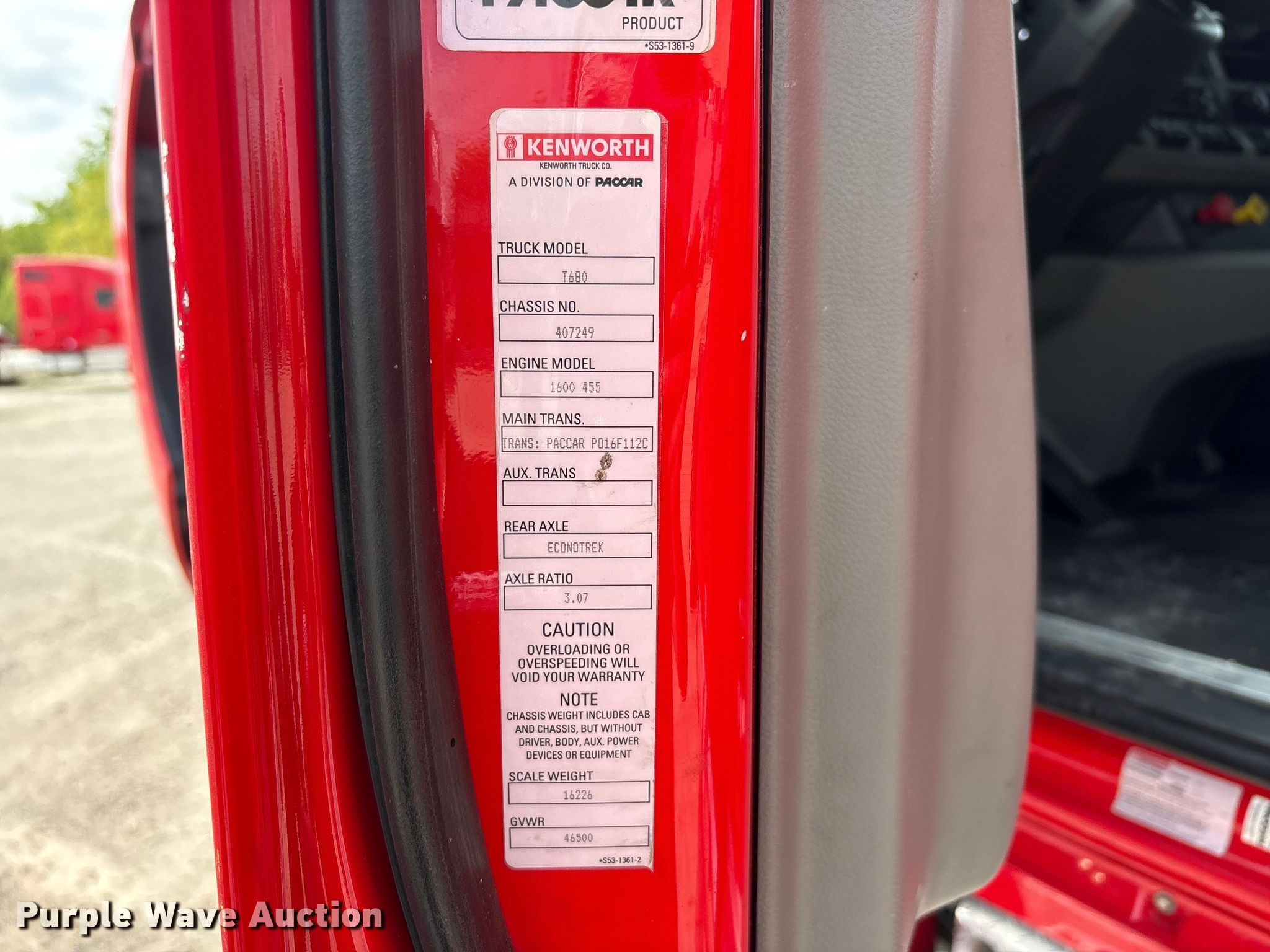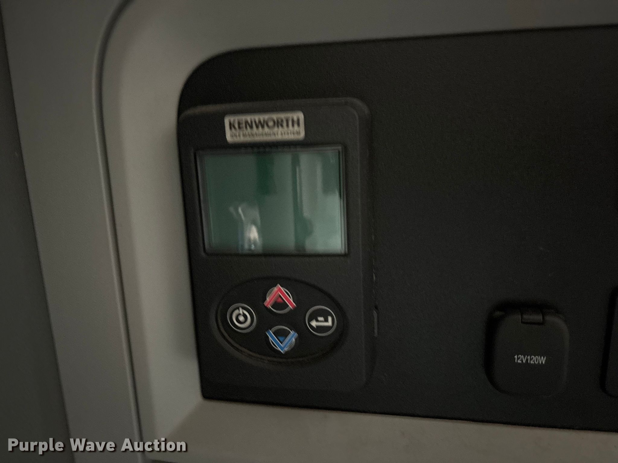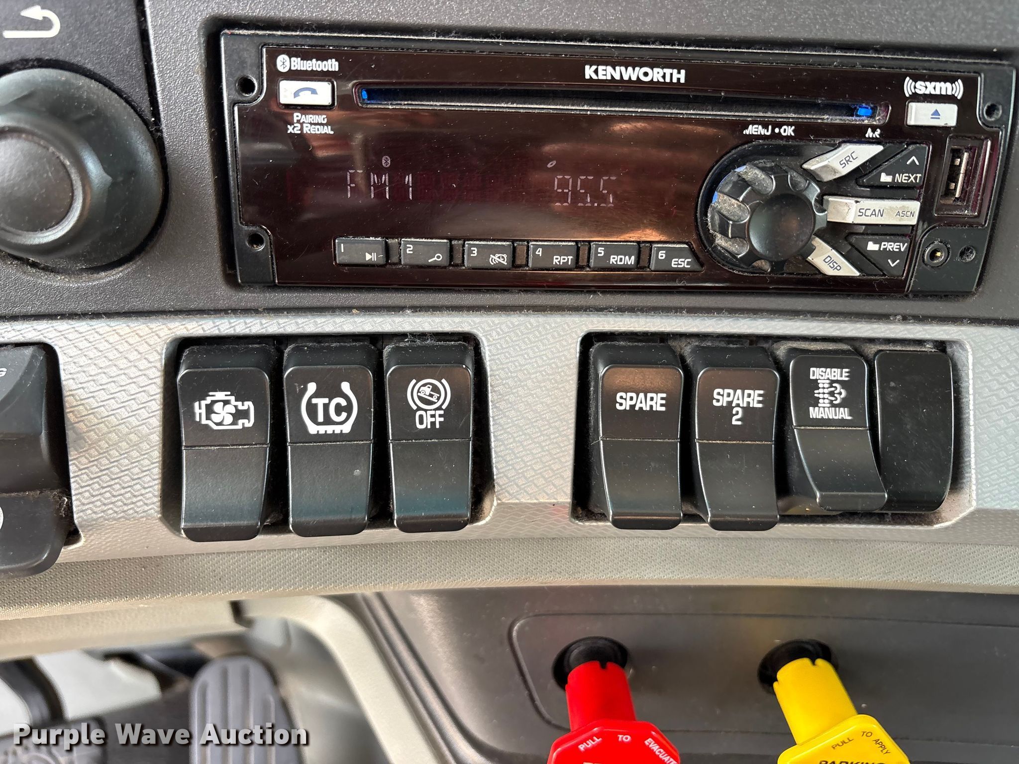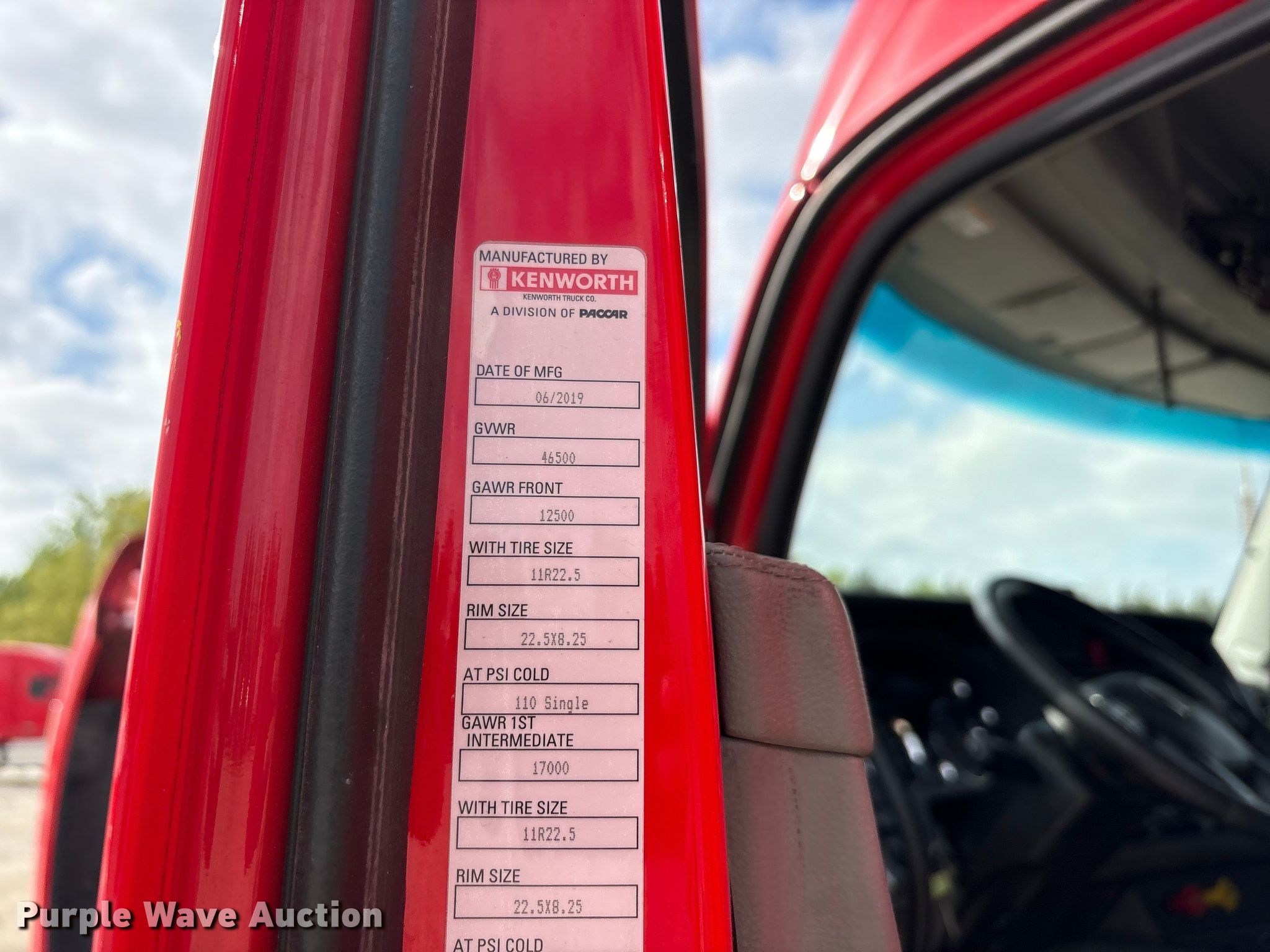 2020 Kenworth T680 semi truck. Miles: 585,836 on odometer, VIN: 1XKYAP8X4LJ407249, Unit #: T87. Engine Paccar MX-13, Displacement: 12.9L, Cylinders: 6, Fuel type: Diesel, HP: 405, Engine brake. Transmission Automated manual. Chassis Axles: Tandem, Single axle differential lock, Suspension: Air Dump valves, Brakes: Air, PTO, GVWR: 46,500 lbs FAWR: 12,500 lbs, IAWR: 17,000 lbs, RAWR: 17,000 lbs. Interior AC, Heat, Heated mirrors, Power windows, Power locks, Cruise control, Air ride cab, Sleeper Sleeper length: 64", Beds: Single, Refrigerator, Rear climate control. Features Deck plate: Aluminum, Fifth wheel type: Air operated, Sliding, Fuel tank: Single. Tires Size: 11R22.5. Notes APU motor removed, Dash warning indicator: Traction control, Windshield chipped or cracked. Texas title. Title distribution may be delayed up to 14 days from verification of funds. Paris, TX 75462