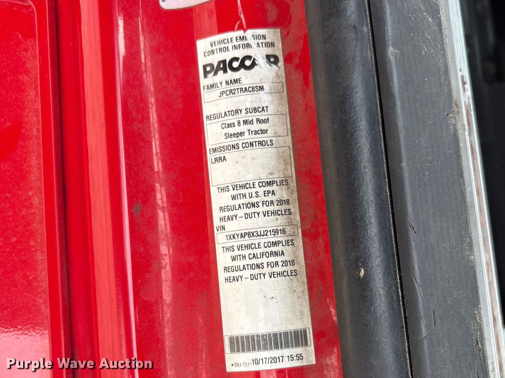 2018 Kenworth T680 semi truck. Miles: 654,776 on odometer, VIN: 1XKYAP8X3JJ215916, Unit #: T78. Engine Paccar MX-13, Displacement: 12.9L, Cylinders: 6, Fuel type: Diesel, HP: 405, Engine brake. Transmission Eaton Fuller, Manual, Speed: 10. Chassis Axles: Tandem, Single axle differential lock, Suspension: Air, Brakes: Air, PTO, GVWR: 46,500 lbs FAWR: 12,500 lbs, IAWR: 17,000 lbs, RAWR: 17,000 lbs. Interior AC, Heat, Heated mirrors, Power windows, Power locks, Cruise control, Air ride cab, Sleeper Sleeper length: 64", Beds: Single, Refrigerator, Rear climate control, Auxiliary power unit Comfort pro. Features Deck plate: Aluminum, Fifth wheel type: Air operated, Sliding, Fuel tank: Dual. Tires Size: 11R22.5. Notes APU cooling fans missing, APU engine cover issues, bolts stripped, Windshield chipped or cracked. Texas title. Title distribution may be delayed up to 14 days from verification of funds. Red River Transport, Inc.. Paris, TX 75462