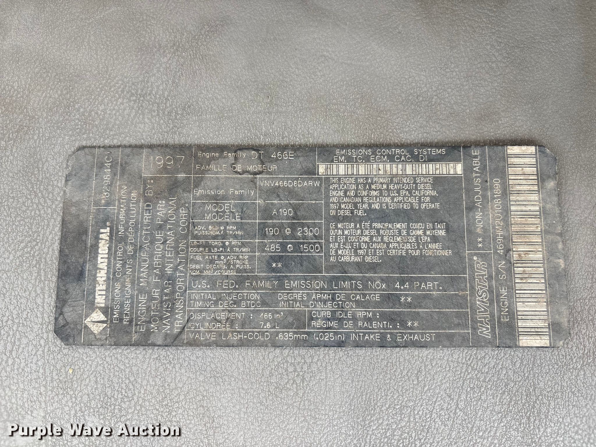 1998 International 4700 box truck. Miles: 276,931 on odometer, VIN: 1HTSCAAM0WH542879. Engine International DT466, Serial: 469HM2U1081890, Displacement: 7.64L, Cylinders: 6, Fuel type: Diesel. Transmission Eaton Fuller, Manual, Speed: 6. Chassis Axles: Single, Suspension: Spring, Brakes: Hydraulic, GVWR: 25,000 lbs. Interior AC, Heat, Cruise control. Features Bed Box bed, Morgan GVFD10324096, Serial: MPA94VB11918001, Length: 24' 6", Width: 96", Height: 8' 8", E-track rail system, Floor: Wood, End gate lift, Anthony. Tires Size: 10R22.5. Notes Contents not included, Dead battery, Unknown operating condition of lift gate, Non-operational unit Unit must be towed or hauled. Oklahoma classic title. Title distribution may be delayed up to 14 days from verification of funds. Mill Creek Lumber & Supply. Lowell, AR 72745