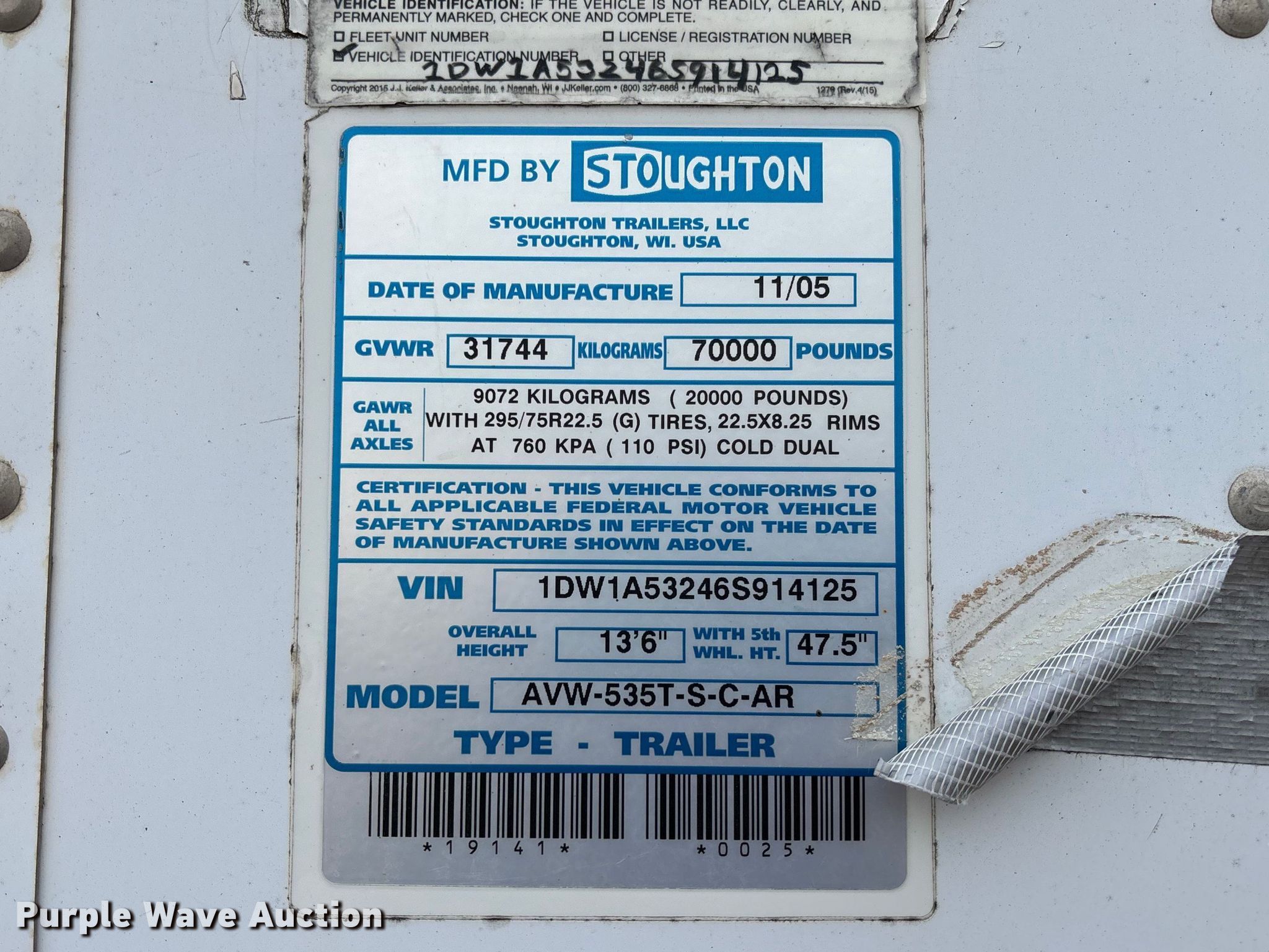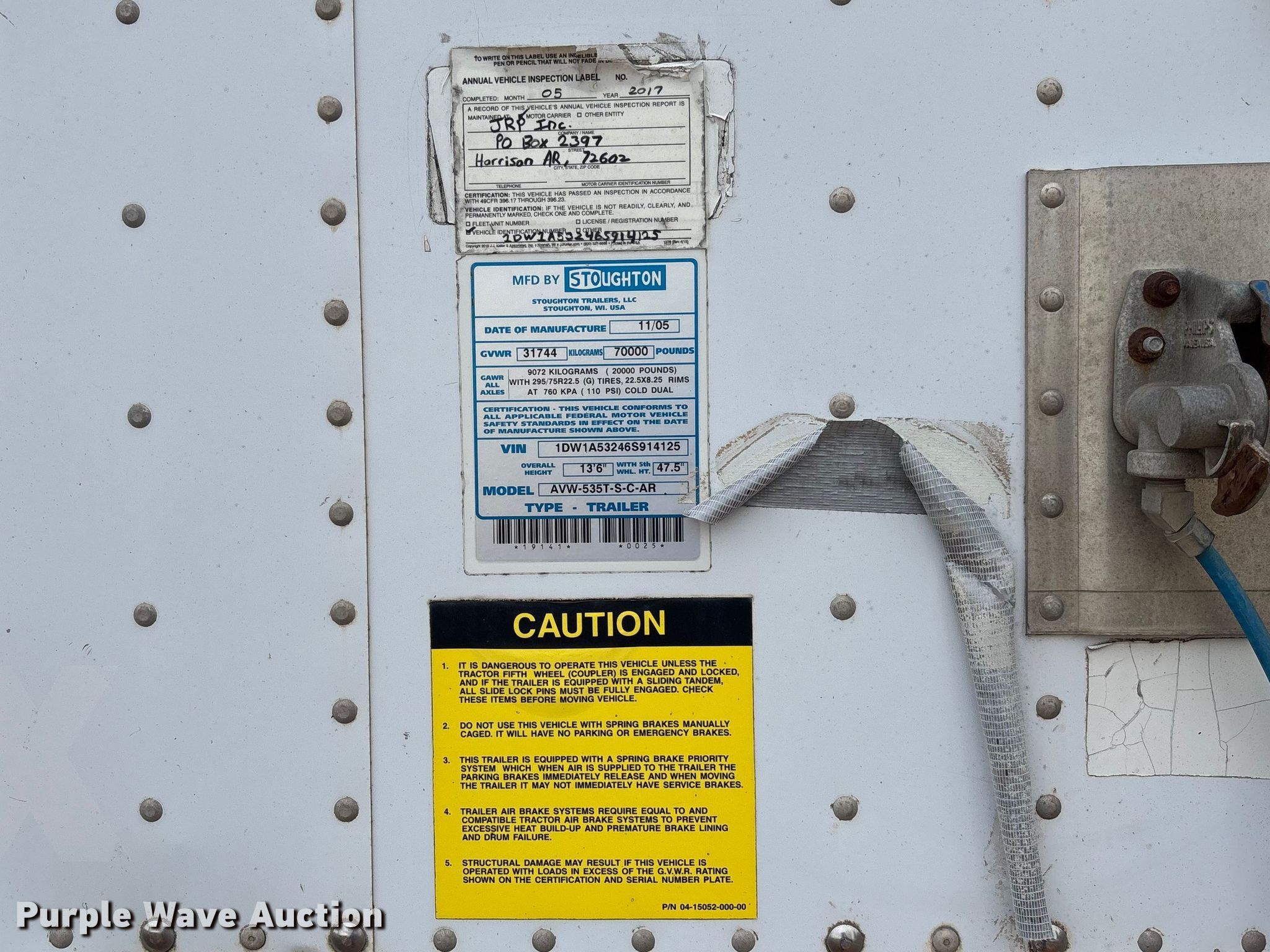 Purple Wave is selling a used Dry Van Trailer in Arkansas. This item is a 2006 Stoughton AVW-535T-S-C-AR dry van trailer with the following: VIN: 1DW1A53246S914125