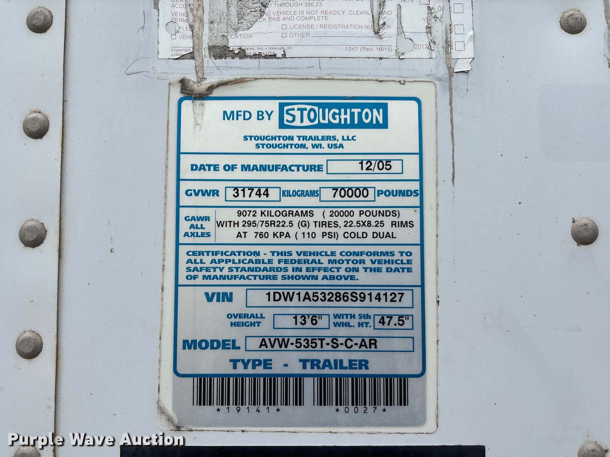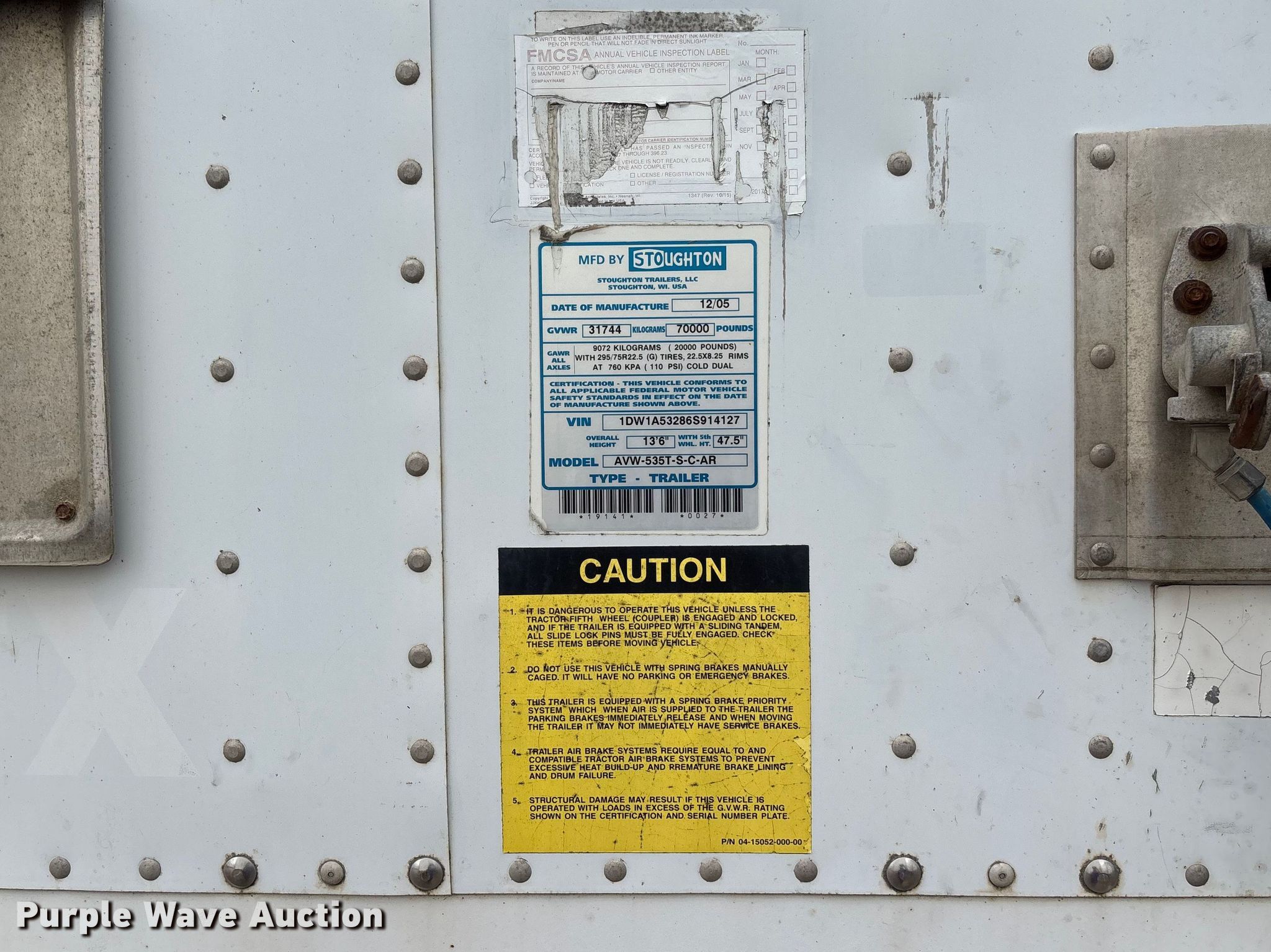 Purple Wave is selling a used Dry Van Trailer in Arkansas. This item is a 2006 Stoughton AVW-535T-S-C-AR dry van trailer with the following: VIN: 1DW1A53286S914127