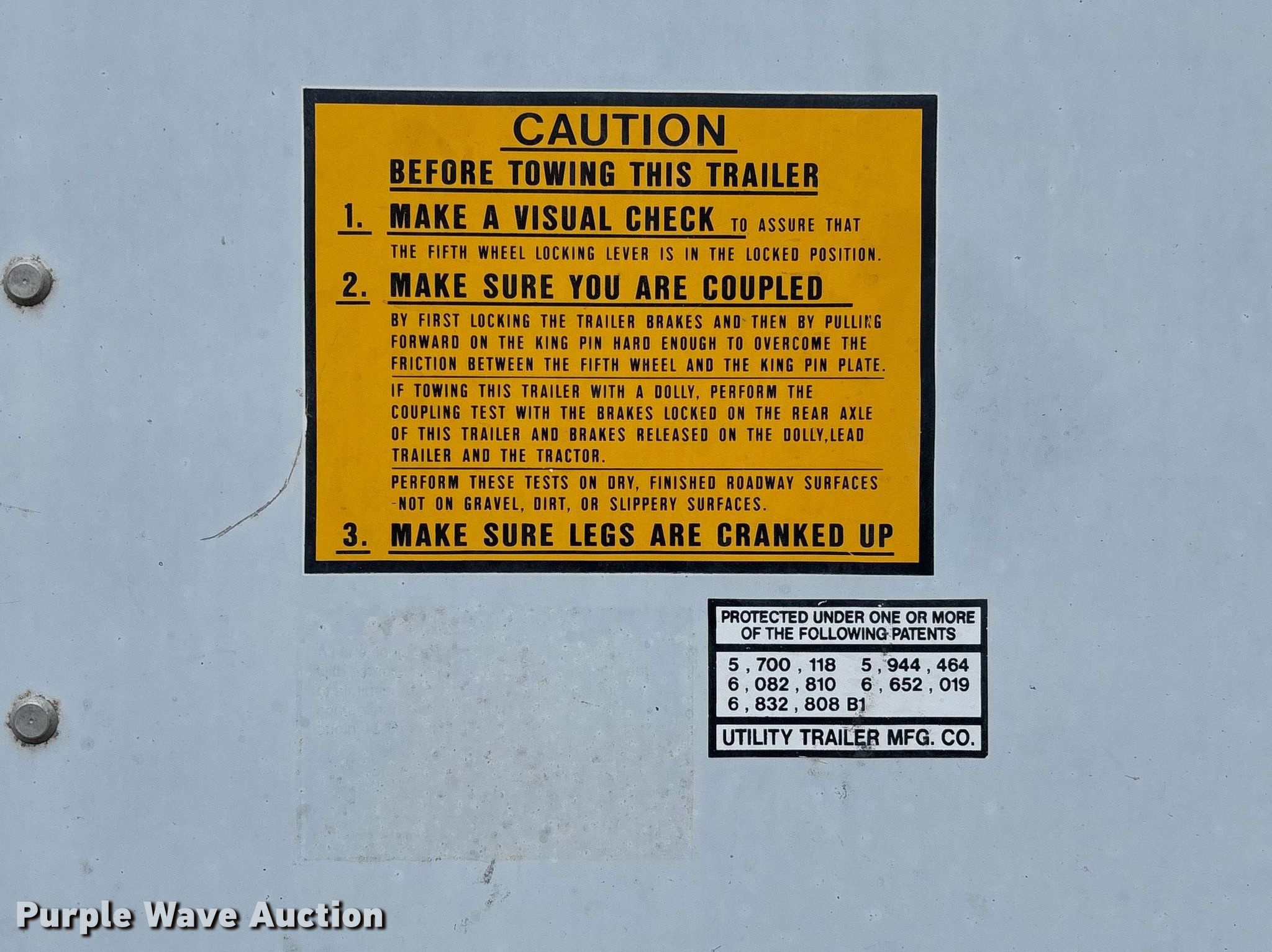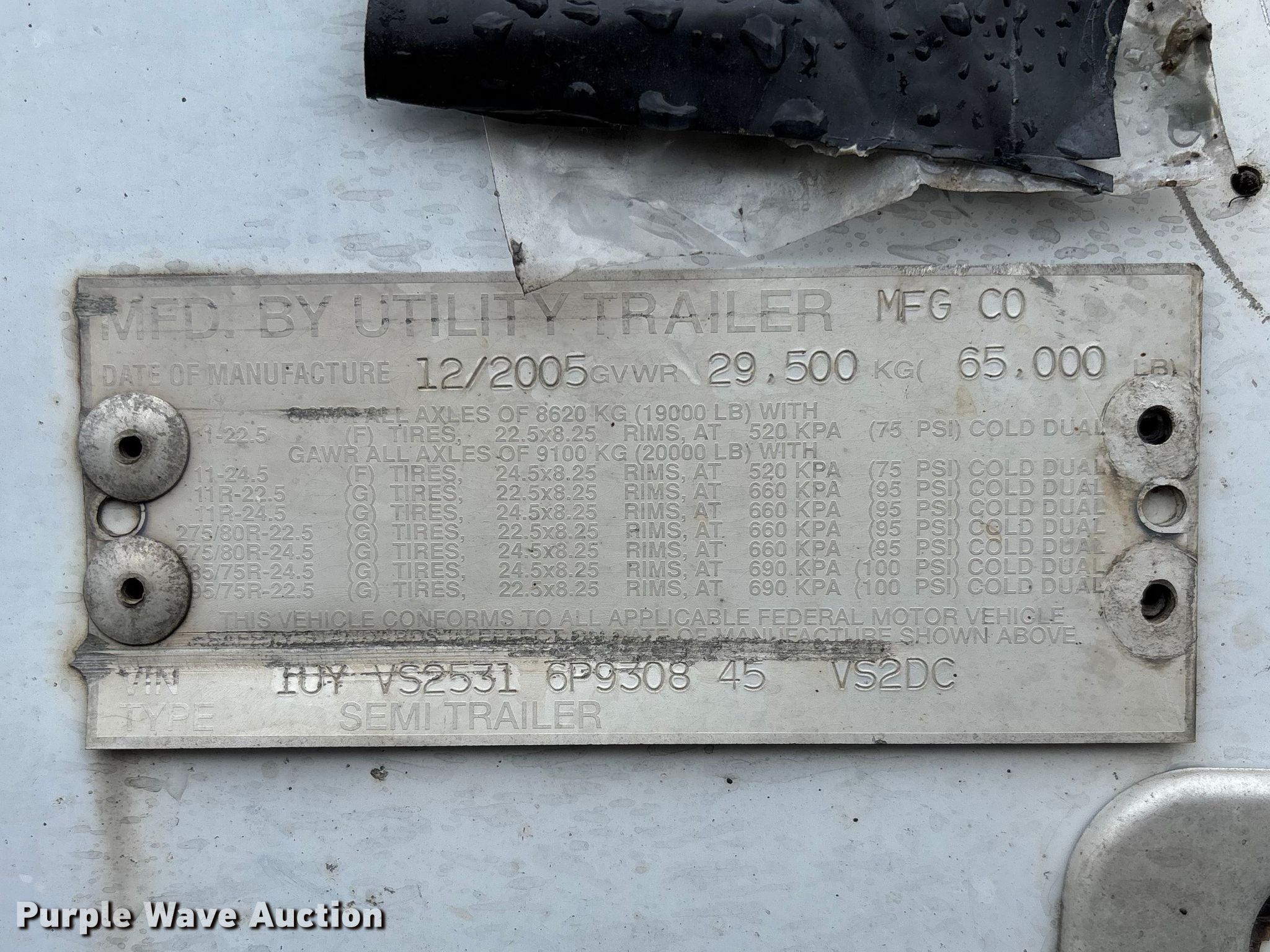 2006 Utility VS2DC dry van trailer. VIN: 1UYVS25316P930845. Dimensions Overall Length: 53', Width: 102". Features Deck type: Wood, E-track rail system. Chassis Landing gear: Dual, Suspension: Air, Brakes: Air, Axles: Tandem Sliding, GVWR: 65,000 lbs, GAWR: 19,000 lbs. Tires Steel wheels, Size: 295/75R22.5. Notes King pin corrosion damage, Contents not included. Missouri title. Title distribution may be delayed up to 14 days from verification of funds. Edge Transportation LLC. Harrison, AR 72601