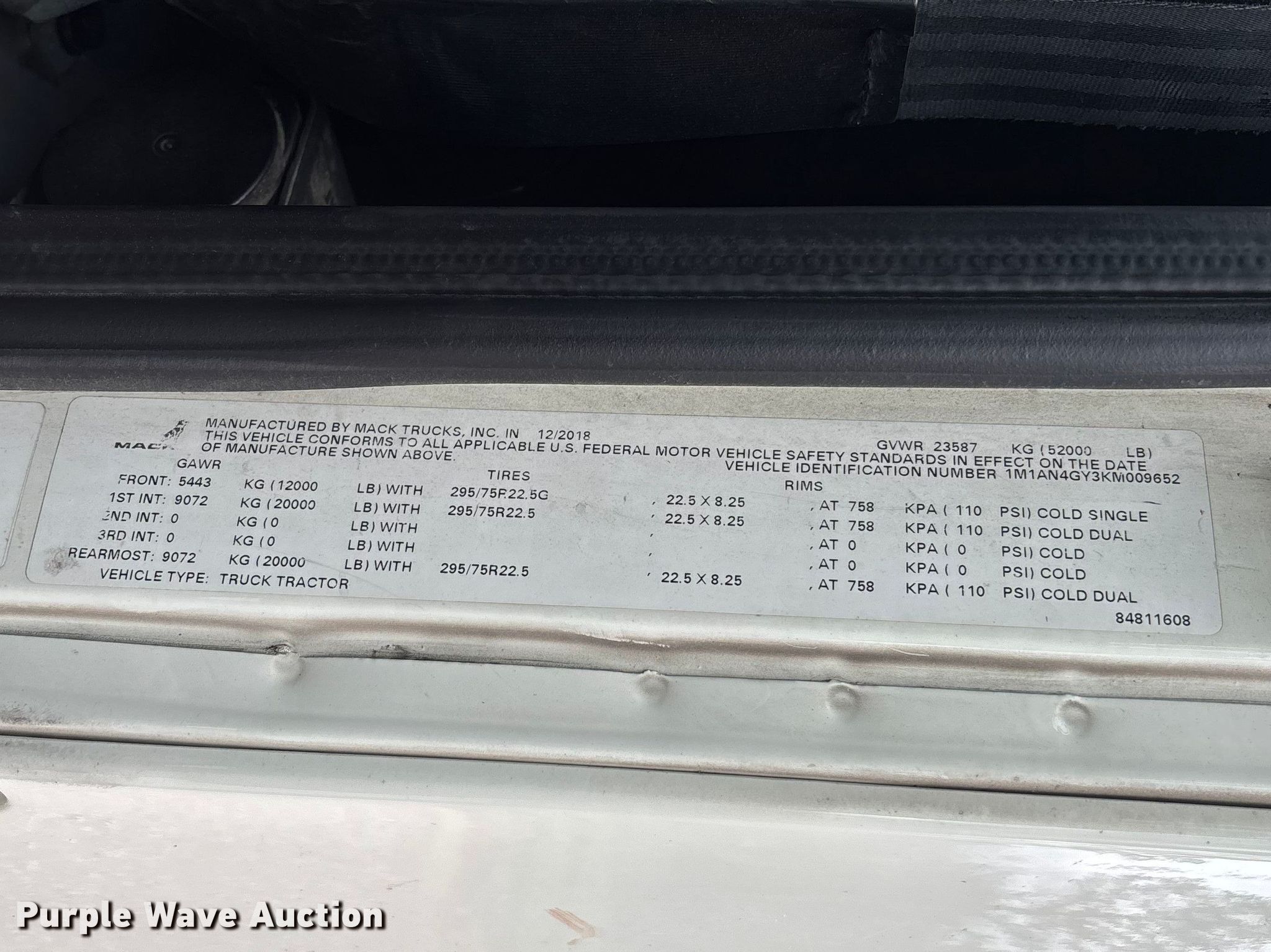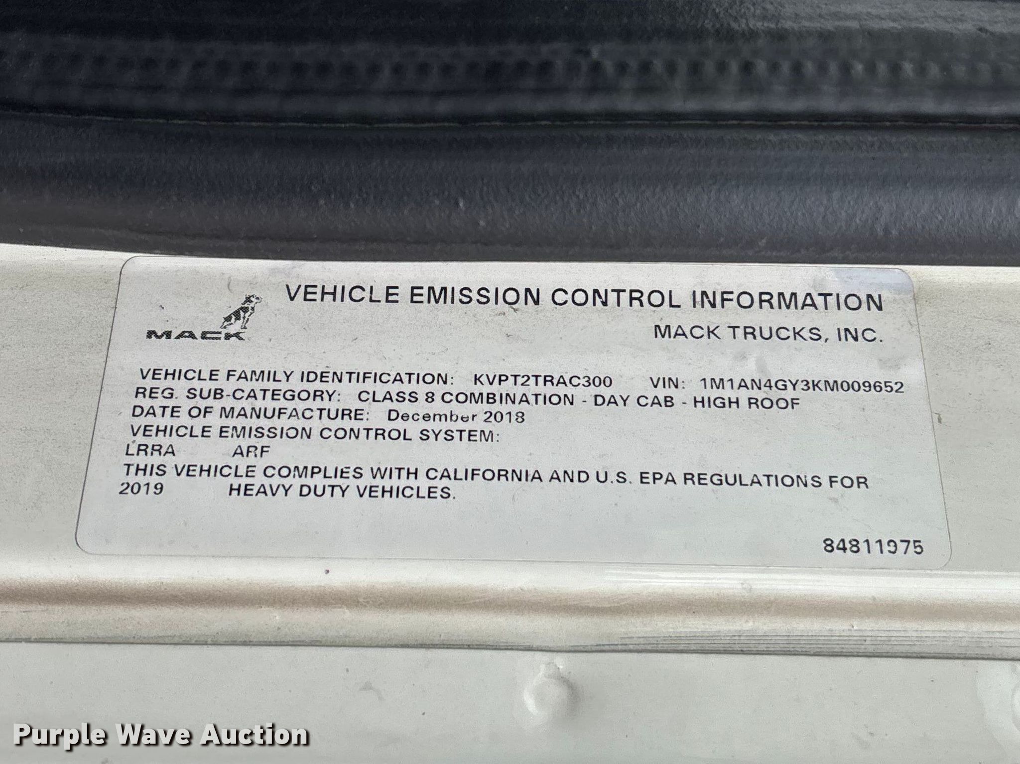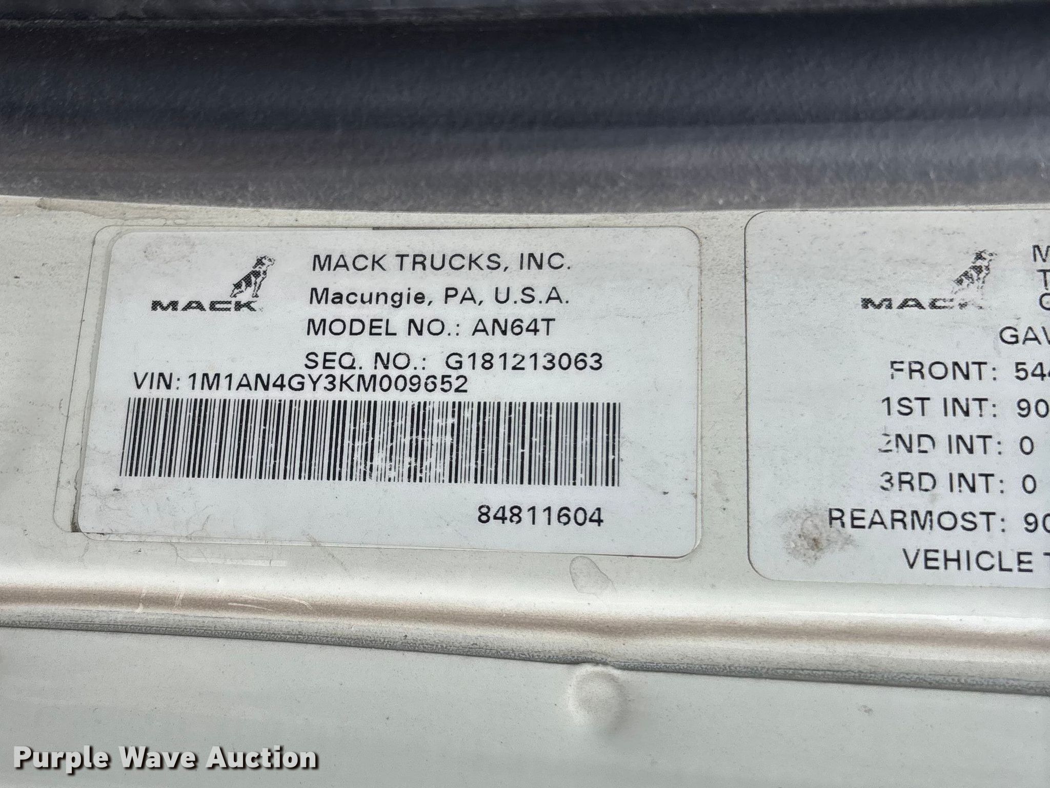 Purple Wave is selling a used Truck Tractor in Arkansas. This item is a 2019 Mack AN64T semi truck with the following: Miles: 646,214 on odometer, Hours: 14,862 on meter, VIN: 1M1AN4GY3KM009652