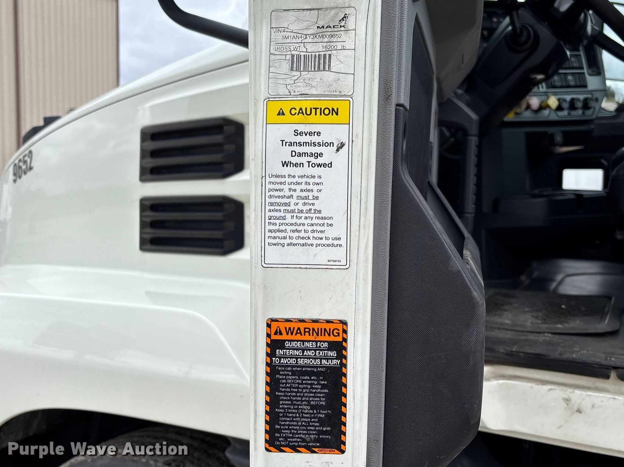 2019 Mack AN64T semi truck. Miles: 646,214 on odometer, Hours: 14,862 on meter, VIN: 1M1AN4GY3KM009652. Engine Mack MP8, Serial: 1235669, Displacement: 12.8L, Cylinders: 6, Fuel type: Diesel, HP: 445, Engine brake. Transmission Mack mDrive, Automated manual. Chassis Axles: Tandem, Differential lock: Inter-axle, Suspension: Air Dump valves, Brakes: Air, GVWR: 52,000 lbs FAWR: 12,000 lbs, IAWR: 20,000 lbs, RAWR: 20,000 lbs, Wheelbase: 185". Interior AC, Heat, Heated mirrors, Power windows, Power locks, Cruise control, Air ride cab, Brake controller. Features Deck plate: Steel, Fifth wheel type: Air operated, Sliding, Fuel tank: Dual. Tires Size: 295/75R22.5. Notes Dash warning indicator: Check engine, Jump start required during on-site data collection, Oil leak. Arkansas title. Title has a lien that will be released following the close of the auction. Title distribution may be delayed up to 30 days from verification of funds. Edge Transportation LLC. Harrison, AR 72601