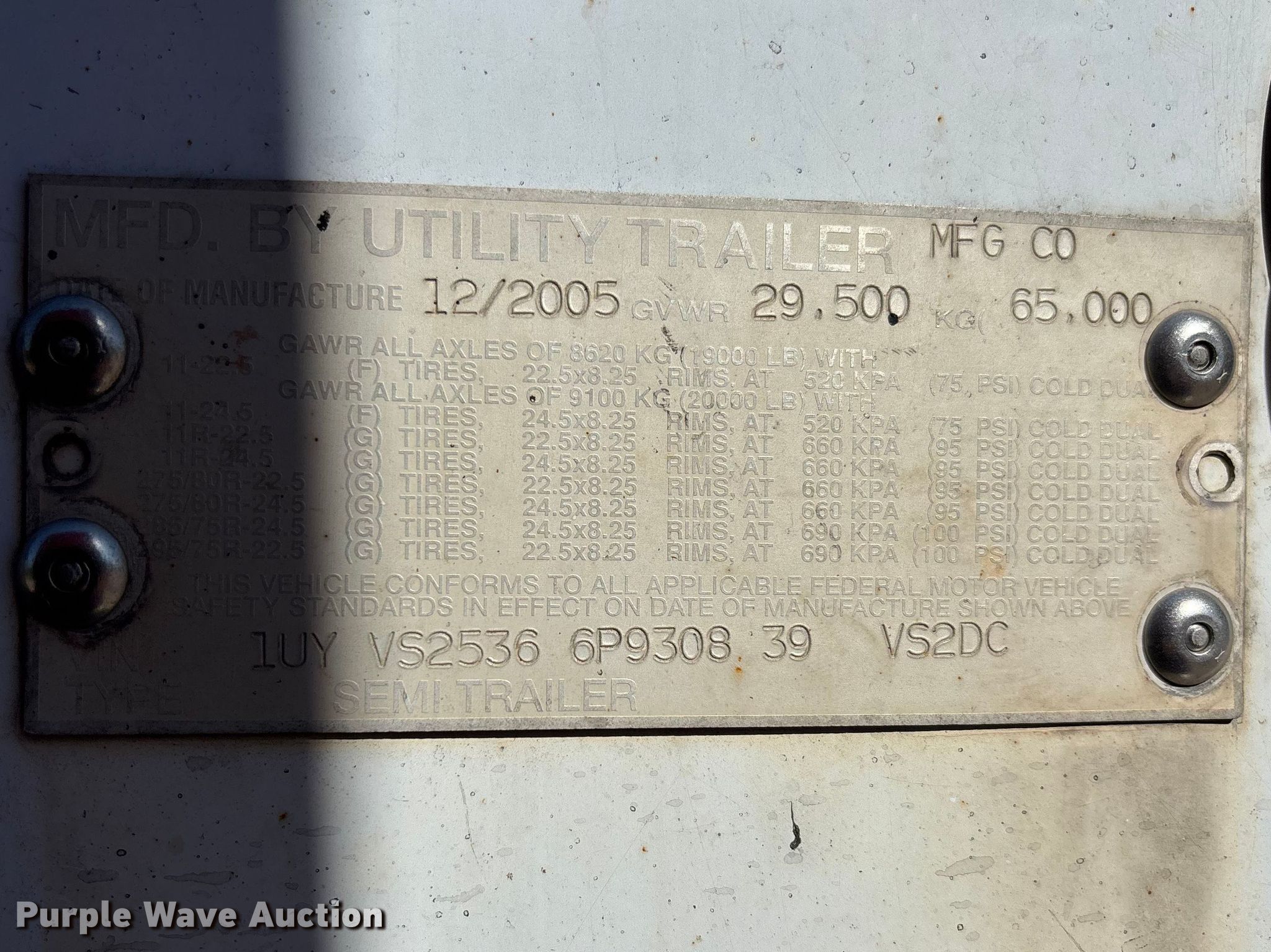 2006 Utility VS2DC dry van trailer. VIN: 1UYVS25366P930839. Dimensions Overall Length: 53', Width: 102", Body Length: 53', Width: 102". Features Deck type: Wood. Chassis Landing gear: Dual, Suspension: Air, Brakes: Air, Axles: Tandem Sliding, GVWR: 65,000 lbs, GAWR: 20,000 lbs. Tires Steel wheels, Size: 275/80R22.5, Size: 255/70R22.5. Notes Additional tires and wheels included, Truck not included. Missouri title. Title has a lien that will be released following the close of the auction. Title distribution may be delayed up to 30 days from verification of funds. Edge Transportation LLC. Harrison, AR 72601