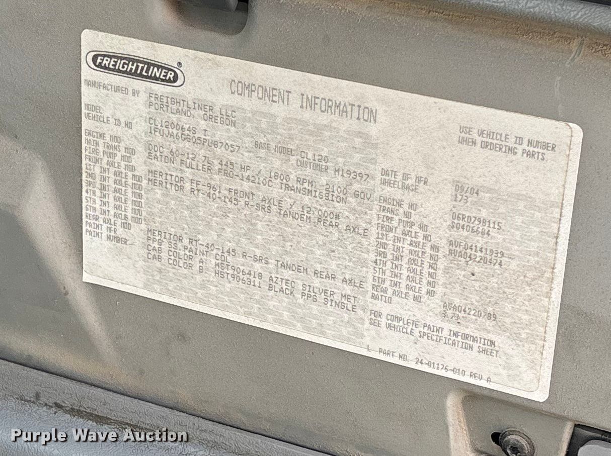 Take a look at this used 2005 Freightliner CL120 semi truck being sold on April 30th, 2026 in the Thursday April 30 Truck and Trailer Auction made by Freightliner. Take a look at all of the item information below or take a look at similar auctions for Trucks.