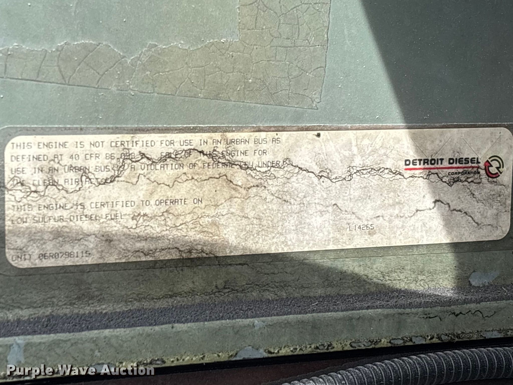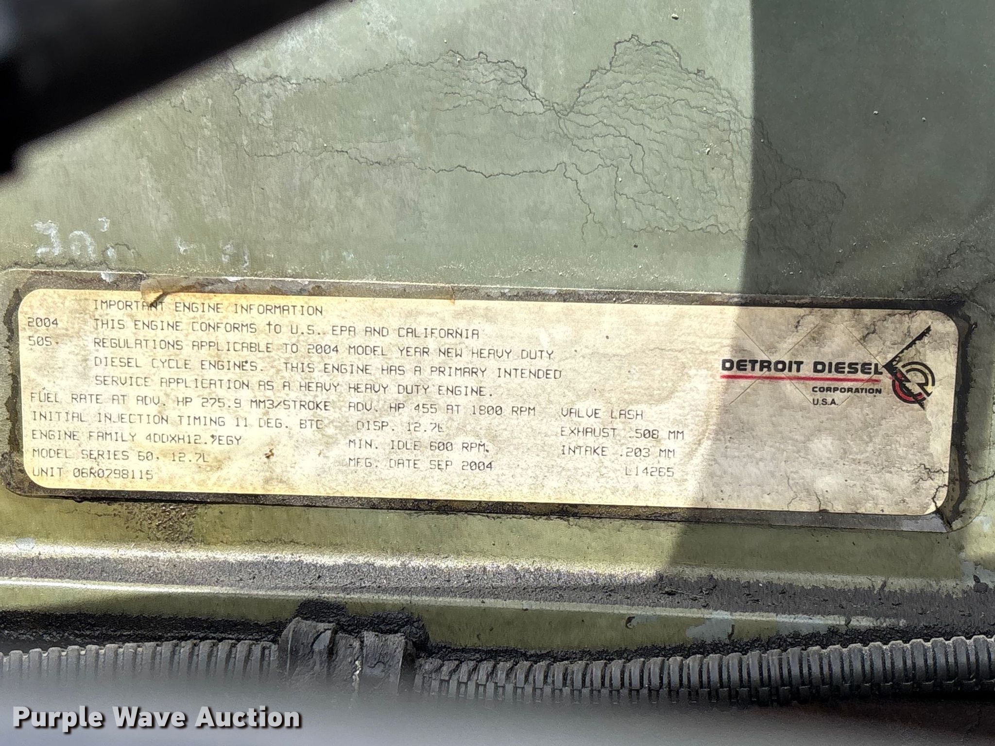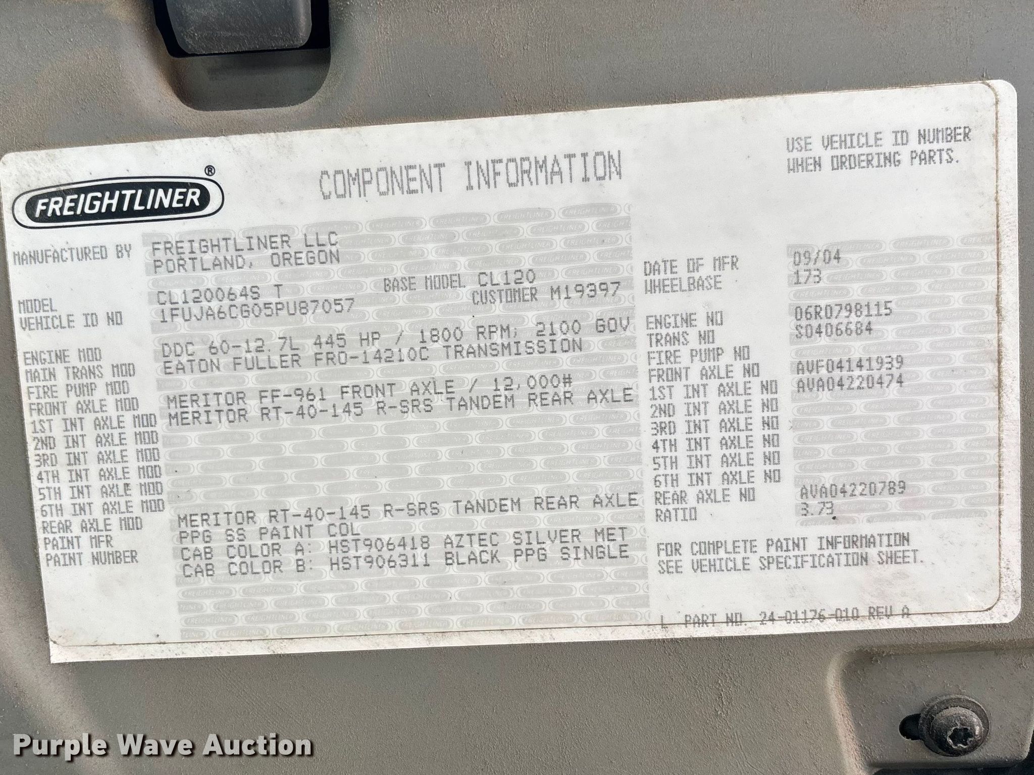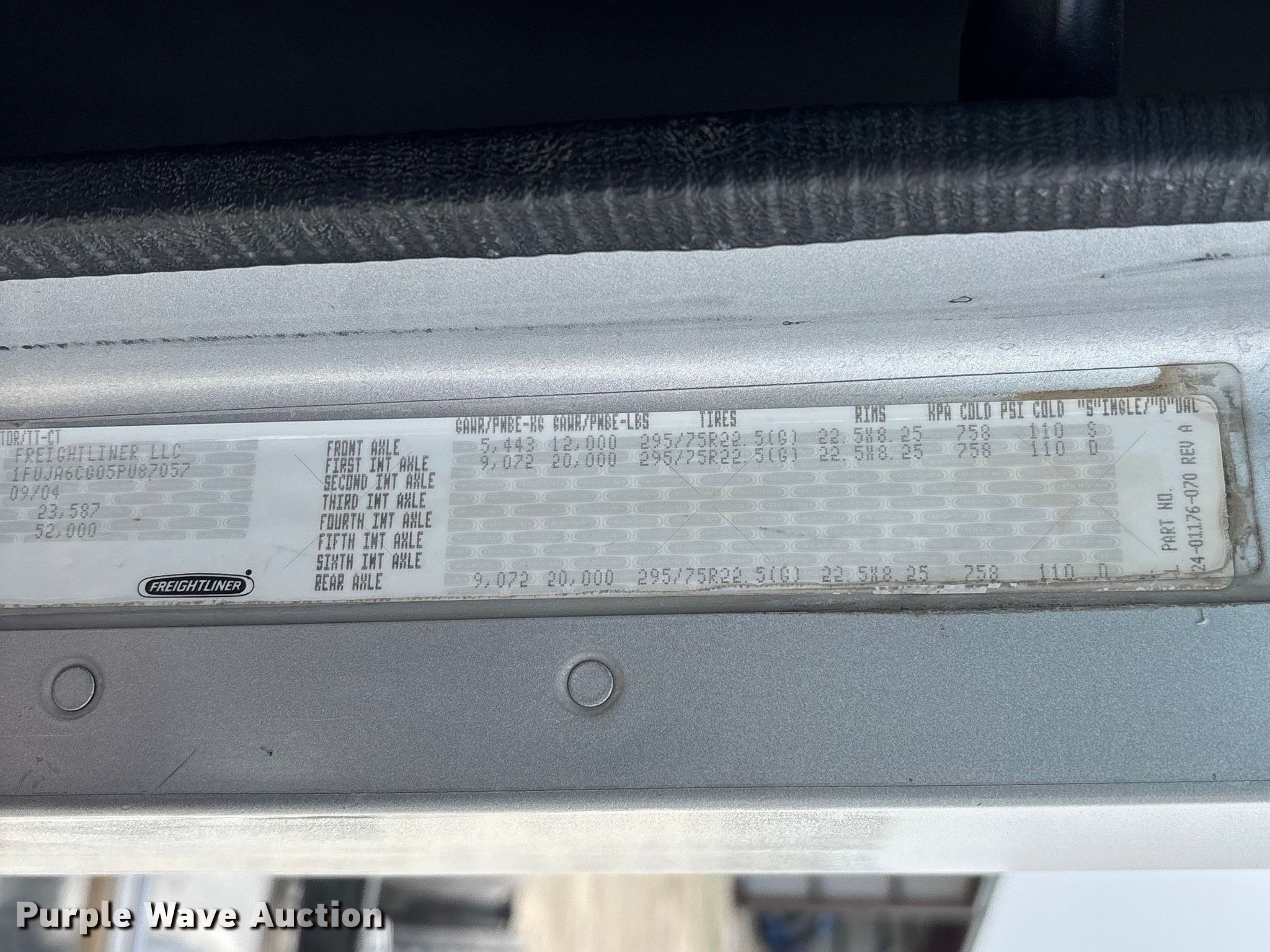 2005 Freightliner CL120 semi truck. Miles: 507,682 on odometer, Hours: 514 on meter, VIN: 1FUJA6CG05PU87057. Engine Detroit Diesel Series 60, Serial: 06R0798115, Displacement: 12.7L, Cylinders: 6, Fuel type: Diesel, HP: 455, Engine brake. Transmission Eaton Fuller FRO-14210C, Manual, Speed: 10. Chassis Axles: Tandem, Differential lock: Inter-axle, Suspension: Air Dump valves, Brakes: Air, Truck chassis: 13', GVWR: 52,000 lbs FAWR: 12,000 lbs, RAWR: 40,000 lbs, Wheelbase: 173". Interior AC, Heat, Heated mirrors, Cruise control, Air ride cab, Brake controller. Features Deck plate: Aluminum, Fifth wheel type: Air operated, Sliding, Fuel tank: Dual. Tires Front: 295/75R22.5, Rear: 275/80R22.5, Rear: 295/75R22.5. Notes Windshield chipped or cracked. Missouri title. Title distribution may be delayed up to 14 days from verification of funds. SelecTurf, Inc.. Jefferson City, MO 65101