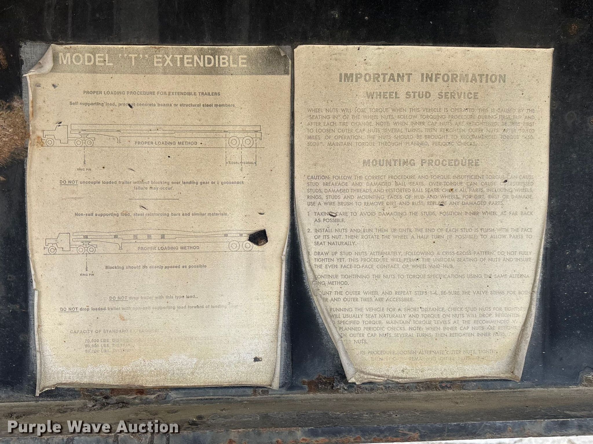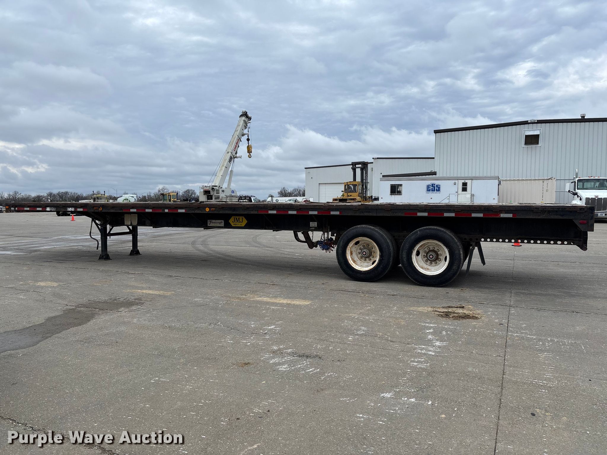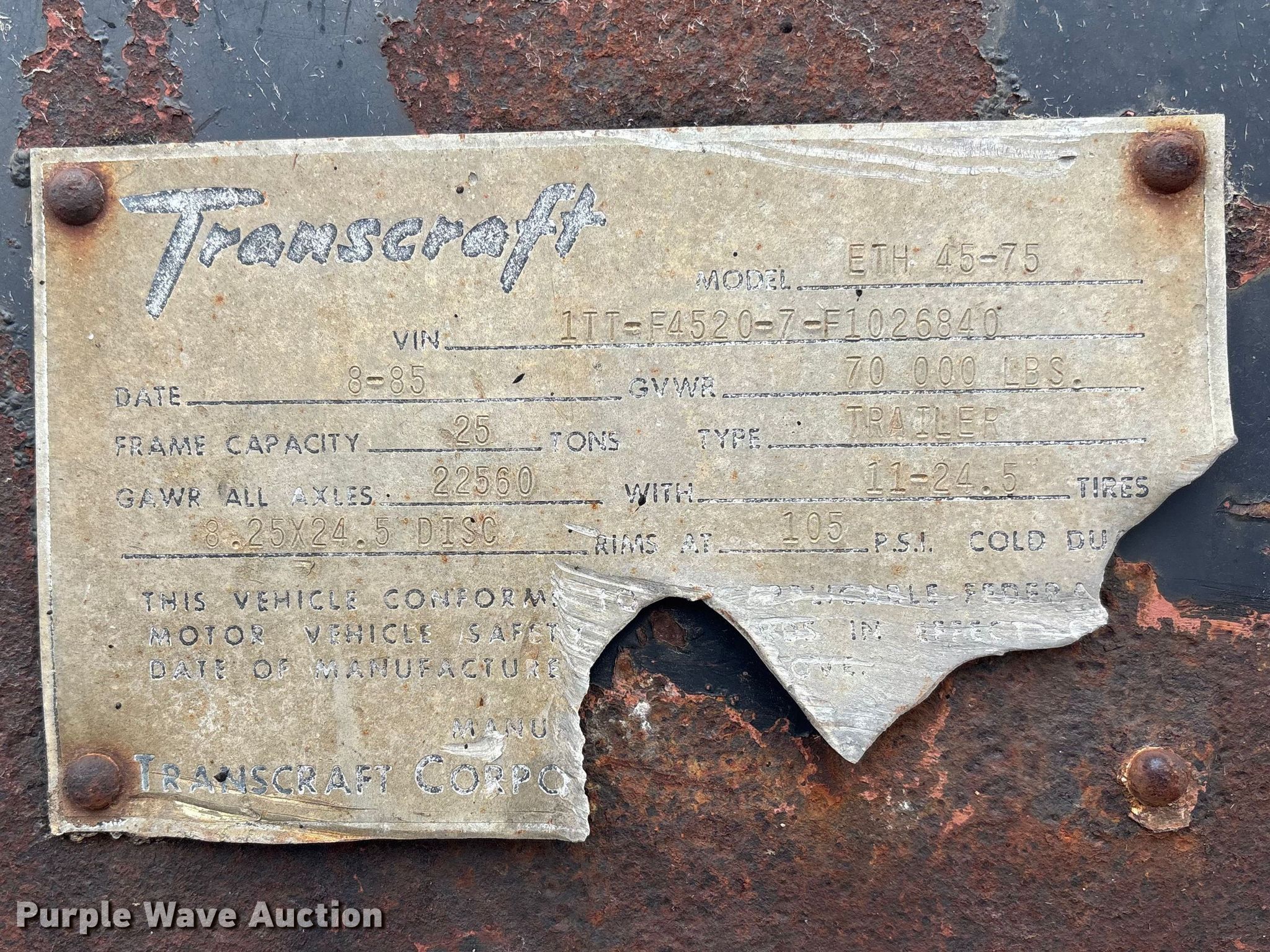 1986 Transcraft ETH 45-75 extendable flatbed trailer. VIN: 1TTF45207F1026840. Dimensions Overall Length: 45', Width: 7' 10", Deck Length: 45', Width: 7' 7", Max length: 75'. Features Deck type: Wood. Chassis Landing gear: Dual, Suspension: Spring, Brakes: Air, Axles: Tandem Sliding, GVWR: 70,000 lbs, GAWR: 22,560 lbs. Tires Steel wheels, Size: 11R24.5. Notes Rust damage. Missouri title. Title distribution may be delayed up to 30 days from verification of funds. Emery Sapp & Sons, Inc... Columbia, MO 65202