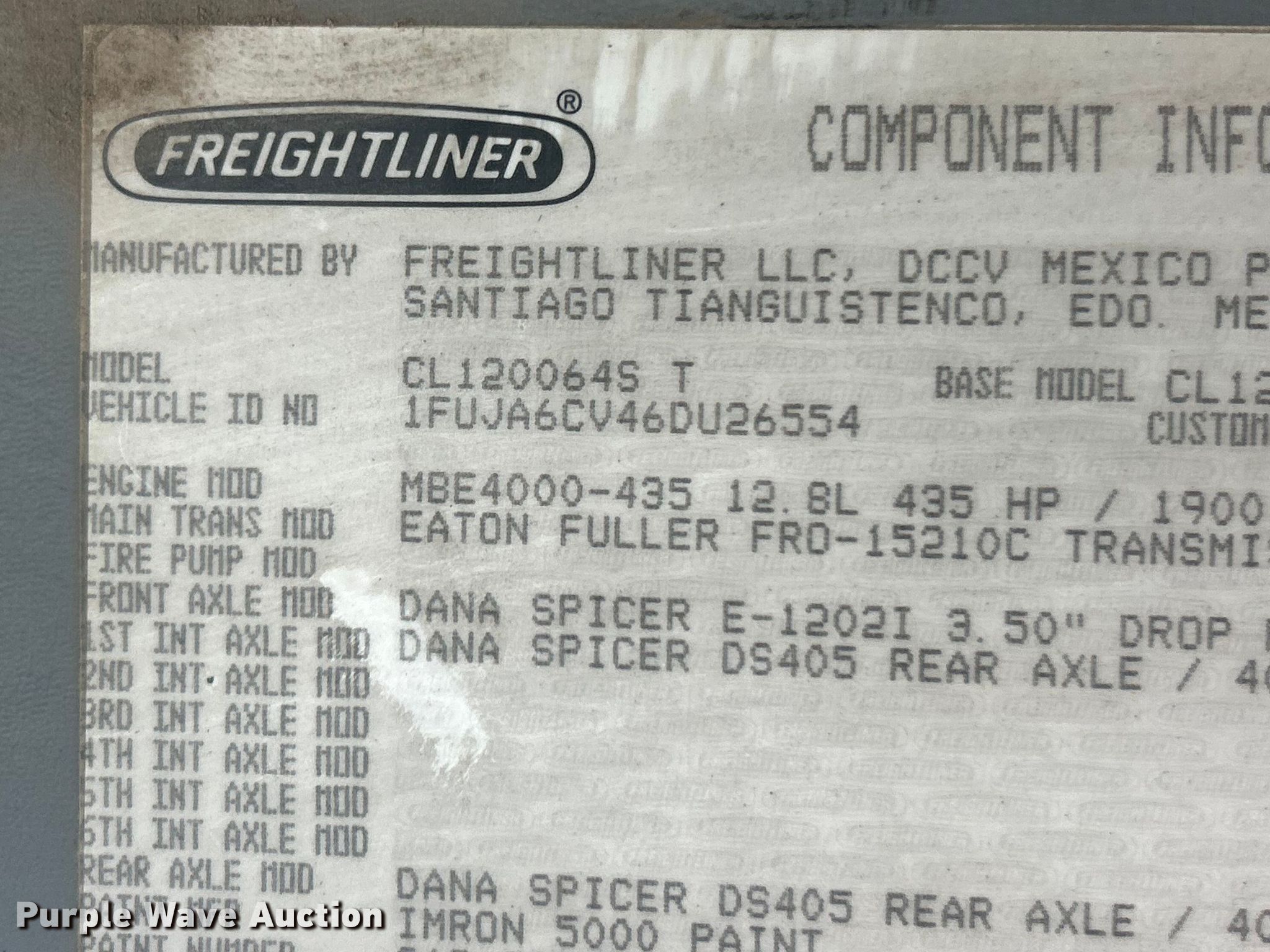2006 Freightliner Columbia semi truck. Miles: 635,993 on odometer, Hours: 22,323 on meter, VIN: 1FUJA6CV46DU26554. Engine Mercedes-Benz, Displacement: 12.8L, Cylinders: 6, Fuel type: Diesel, Engine brake. Transmission Eaton Fuller FRO-15210C, Manual, Speed: 10. Chassis Axles: Tandem, Differential lock: Inter-axle, Suspension: Air, Brakes: Air, PTO, Wet kit. Interior AC, Heat, Heated mirrors, Cruise control, Air ride cab. Features Deck plate: Aluminum, Fifth wheel type: Air operated, Sliding, Fuel tank: Dual. Tires Size: 11R24.5. Notes Dash warning indicator: Tractor ABS, Windshield chipped or cracked, Glass broken, Oil leak, Possible water in oil, Passenger seat missing, Cab air ride issues, detached, Fifth wheel airline missing. Illinois title. Title distribution may be delayed up to 30 days from verification of funds. KDC Global LLC. East St. Louis, IL 62205