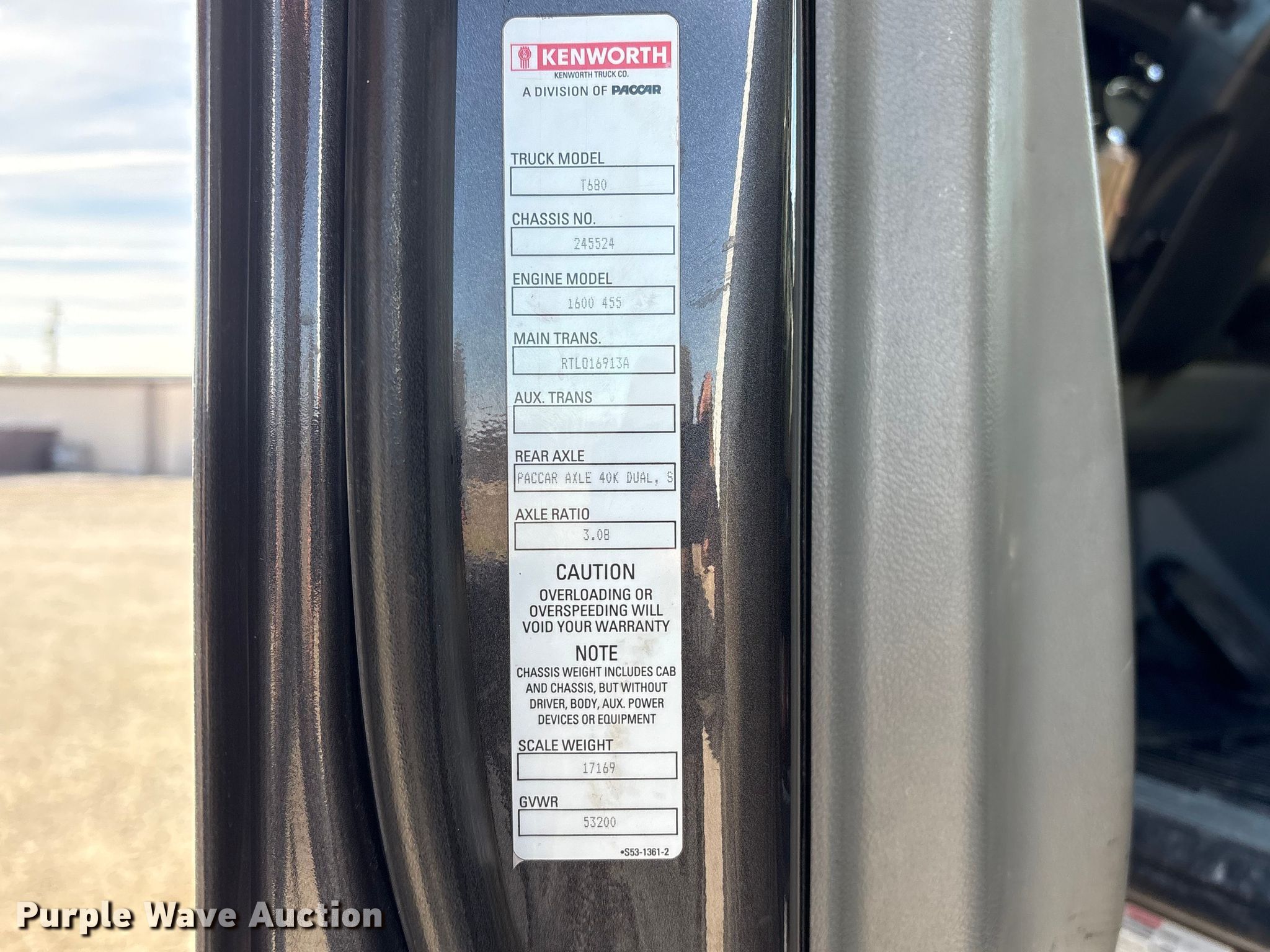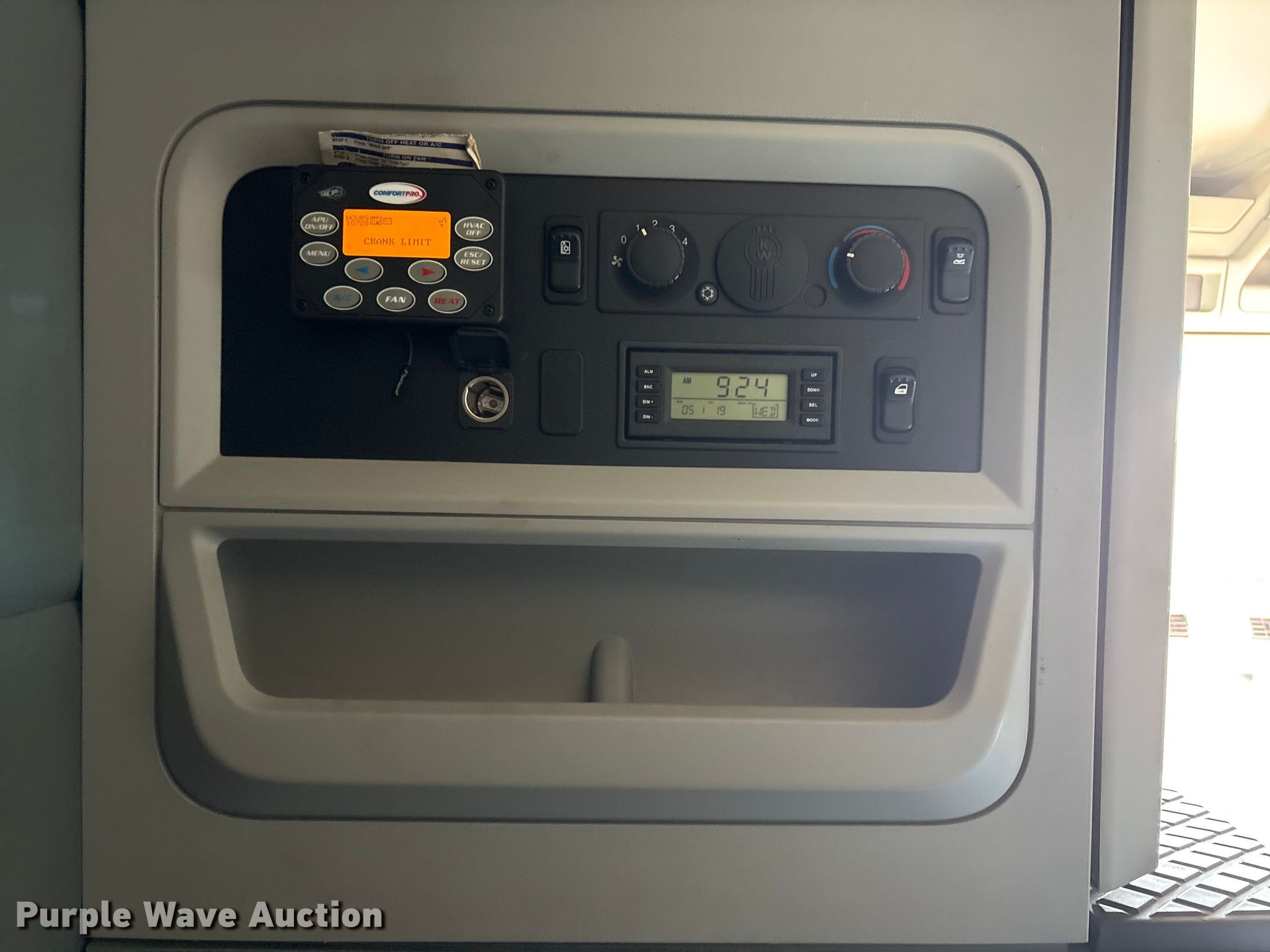 2019 Kenworth T680 semi truck. Miles: 851,150 on odometer, VIN: 1XKYDP9X5KJ245524. Engine Paccar MX-13, Displacement: 12.9L, Cylinders: 6, Fuel type: Diesel, HP: 405. Transmission Eaton Fuller, Manual, Speed: 13. Chassis Axles: Tandem, Gear ratio: 3.08, Differential lock: Inter-axle, Suspension: Air, Brakes: Air, Truck chassis: 13' 6", GVWR: 53,200 lbs FAWR: 13,200 lbs, IAWR: 20,000 lbs, RAWR: 20,000 lbs. Interior AC, Heat, Heated mirrors, Power windows, Power locks, Cruise control, Air ride cab, Auxiliary controls, Brake controller, Sleeper Sleeper length: 54", Beds: Double bunk, Refrigerator, Microwave, Rear climate control, Auxiliary power unit Comfort pro. Features Deck plate: Aluminum, Fifth wheel type: Air operated, Sliding, Fuel tank: Dual. Tires Size: 275/80R22.5. Notes Dash warning indicator: Check engine, TPMS, ABS, Traction control, CECU not customized to vehicle. Iowa title. Title distribution may be delayed up to 30 days from verification of funds. S & R Trucking Inc. Audubon, IA 50025