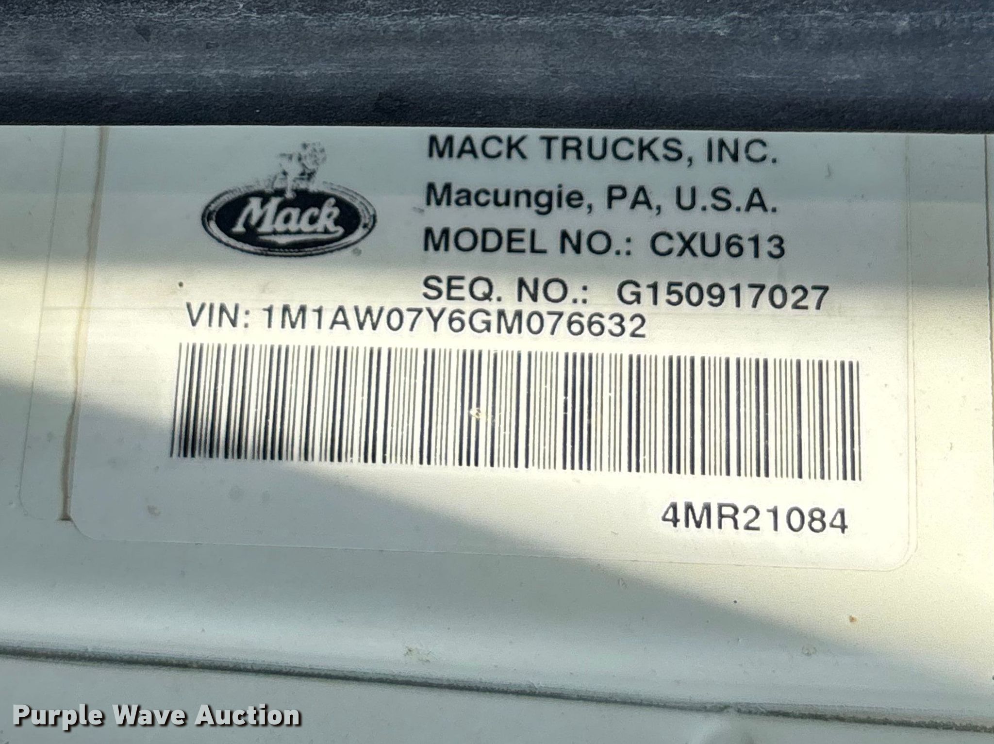 Take a look at this used 2016 Mack CXU613 semi truck being sold on April 30th, 2026 in the Thursday April 30 Truck and Trailer Auction made by Mack. Take a look at all of the item information below or take a look at similar auctions for Trucks.