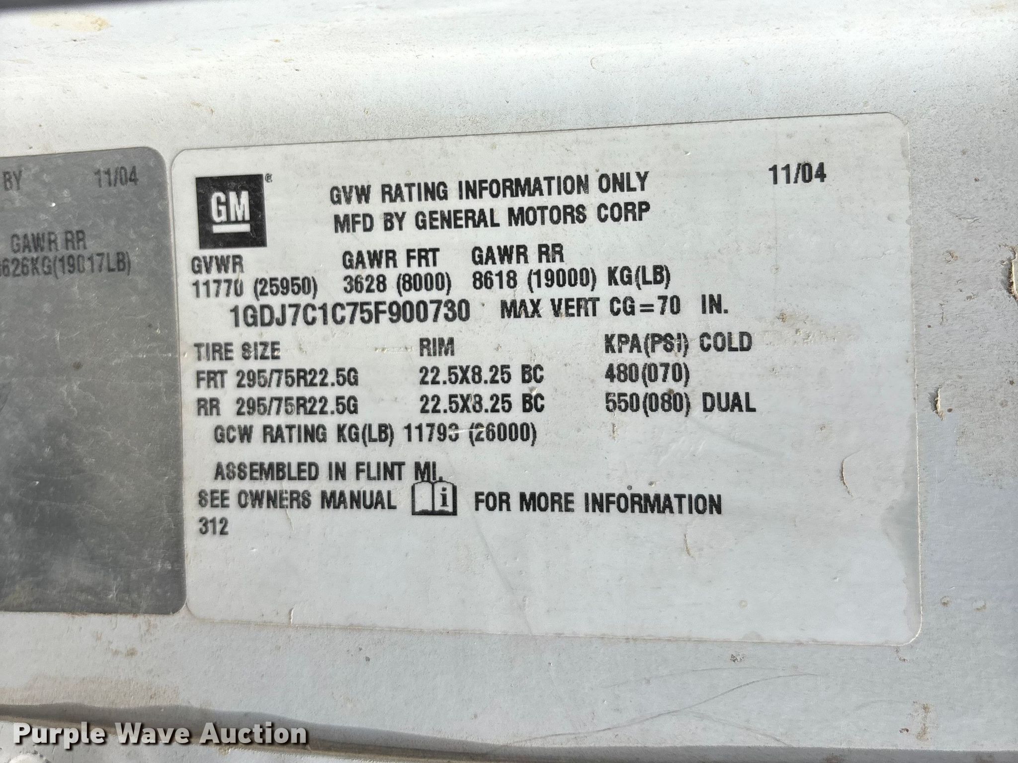Take a look at this used 2005 GMC C7500 truck cab and chassis being sold on April 30th, 2026 in the Thursday April 30 Truck and Trailer Auction made by GMC. Take a look at all of the item information below or take a look at similar auctions for Trucks.