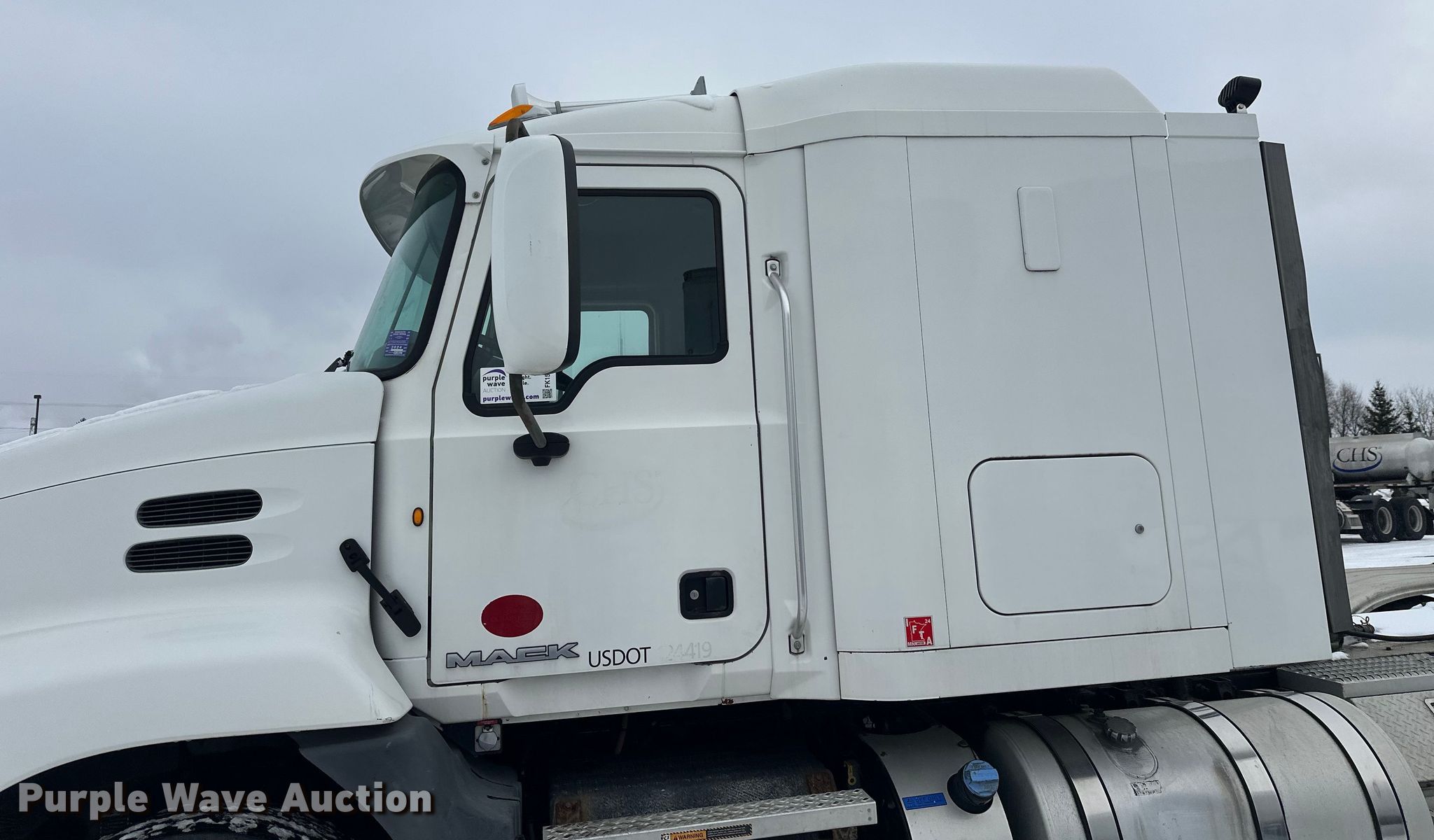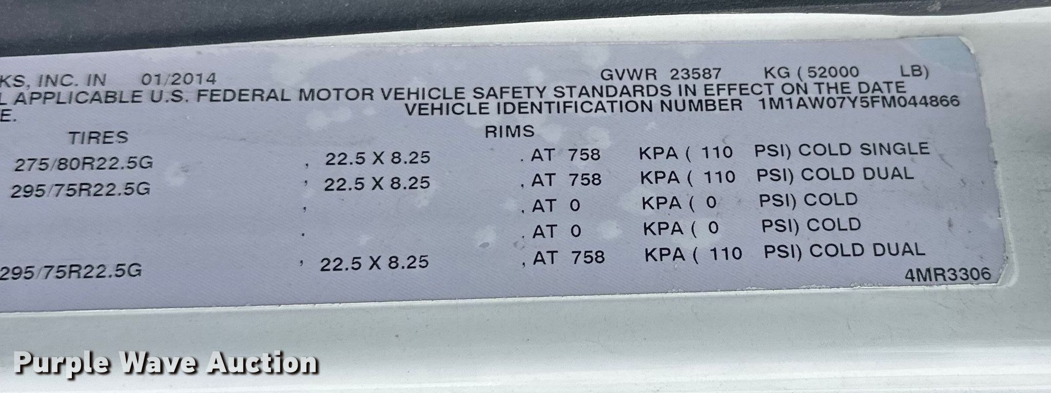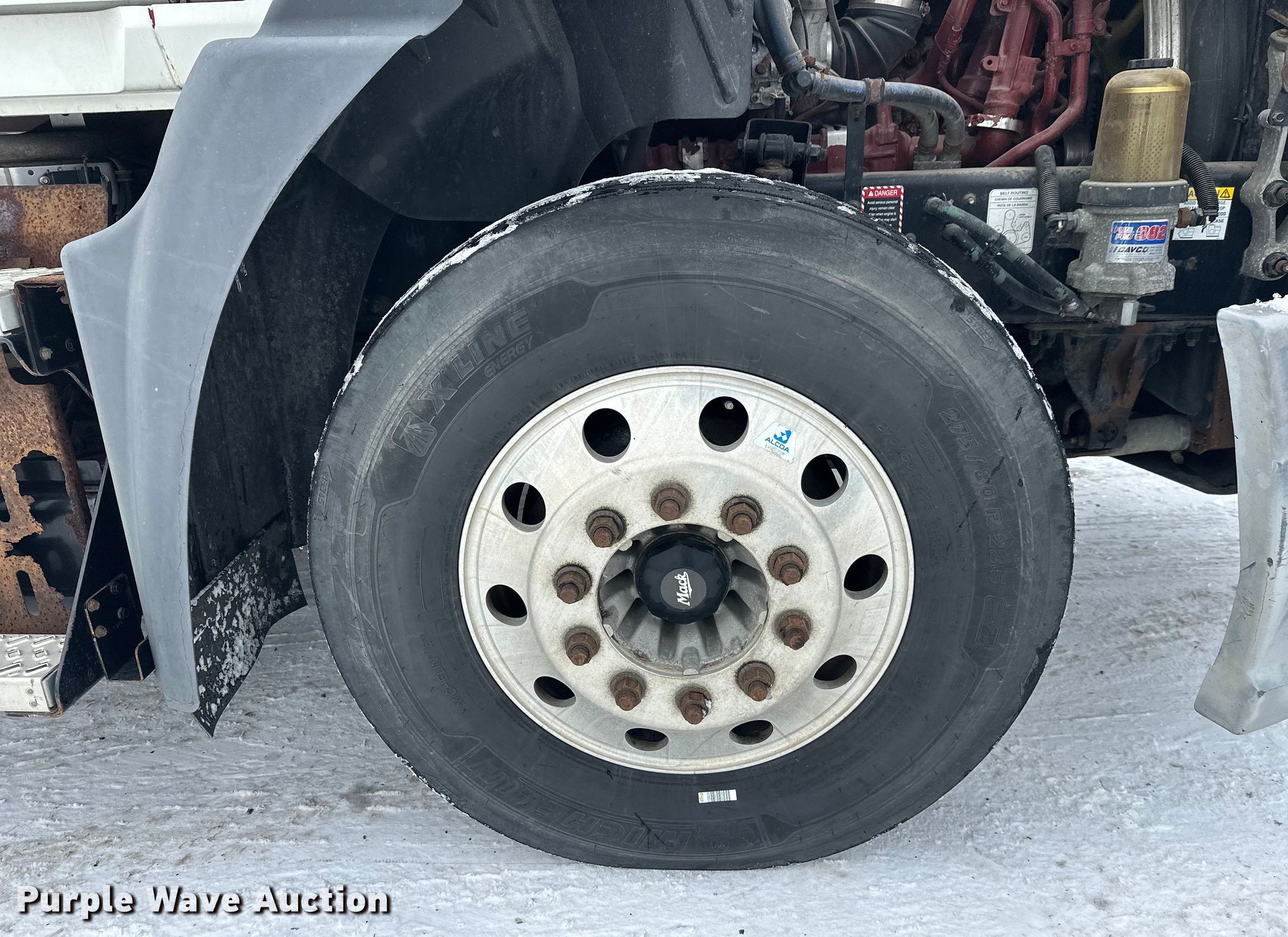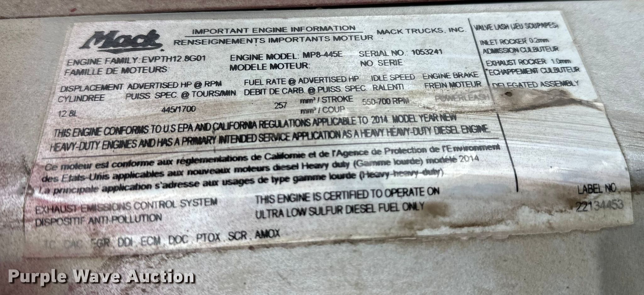 2015 Mack CXU613 semi truck. Miles: 666,429 on odometer, Hours: 19,739 on meter, VIN: 1M1AW07Y5FM044866, Unit #: 153283. Engine Mack MP8-445E, Serial: 1053241, Displacement: 12.8L, Cylinders: 6, Fuel type: Diesel, HP: 435, Engine brake. Transmission Eaton Fuller, Manual, Speed: 13. Chassis Axles: Tandem, Differential lock: Inter-axle, Suspension: Air Dump valves, Brakes: Air, PTO, Wet kit, GVWR: 52,000 lbs FAWR: 12,000 lbs, IAWR: 20,000 lbs, RAWR: 20,000 lbs. Interior AC, Heat, Heated mirrors, Power windows, Power locks, Cruise control, Air ride cab, Sleeper Sleeper length: 40", Beds: Single, Rear climate control. Features Deck plate: Aluminum, Fifth wheel type: Air operated, Sliding, Fuel tank: Single. Tires Size: 275/80R22.5. Notes Dash warning indicator: Check engine. Minnesota title. Title distribution may be delayed up to 30 days from verification of funds. CHS, Inc.. Rosemount, MN 55068