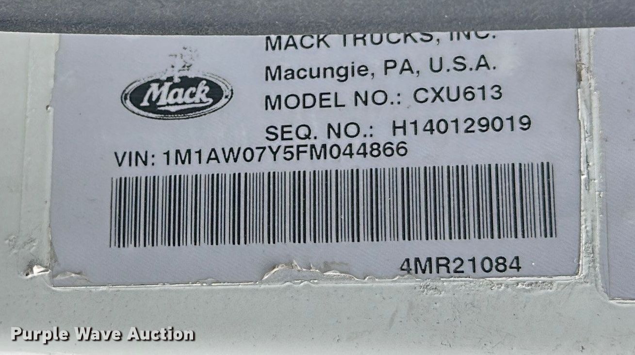Take a look at this used 2015 Mack CXU613 semi truck being sold on April 30th, 2026 in the Thursday April 30 Truck and Trailer Auction made by Mack. Take a look at all of the item information below or take a look at similar auctions for Trucks.