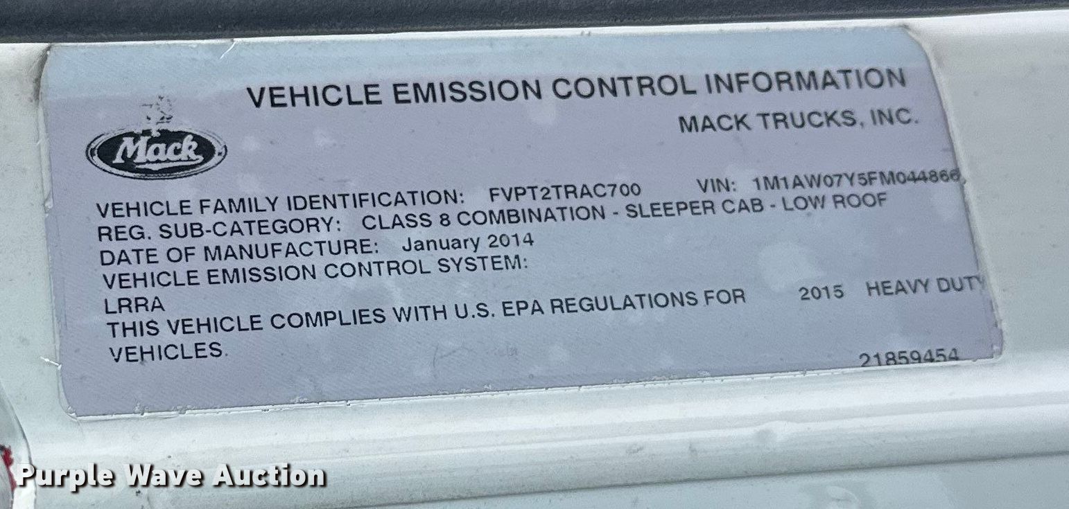 Purple Wave is selling a used Truck Tractor in Minnesota. This item is a 2015 Mack CXU613 semi truck with the following: Miles: 666,429 on odometer, Hours: 19,739 on meter, VIN: 1M1AW07Y5FM044866, Unit #: 153283