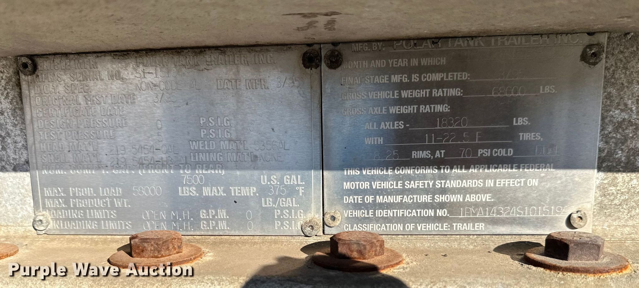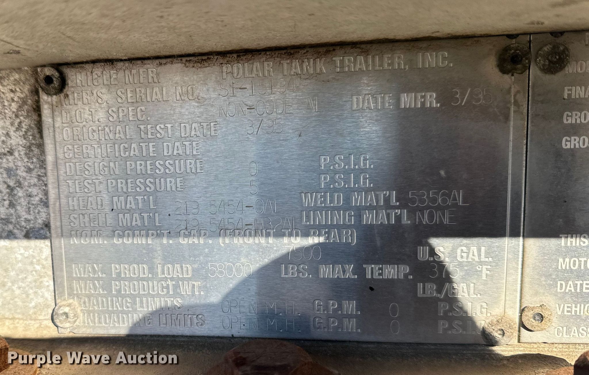 1995 Polar asphalt trailer. VIN: 1PMA14324S1015194. Dimensions Overall Length: 42', Width: 96". Features Tank type: Aluminum Capacity: 7,500 gallons, Outlet valves: 1 Size: 3", Pump Outlet size: 3". Chassis Landing gear: Dual, Suspension: Spring, Brakes: Air, Axles: Tandem, GVWR: 68,000 lbs. Tires Steel wheels, Size: 11R22.5. Minnesota title. Title distribution may be delayed up to 30 days from verification of funds. CHS, Inc.. Rosemount, MN 55068
